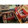 2 Boxes of assorted glassware, Bowles balls and a Mantel clock