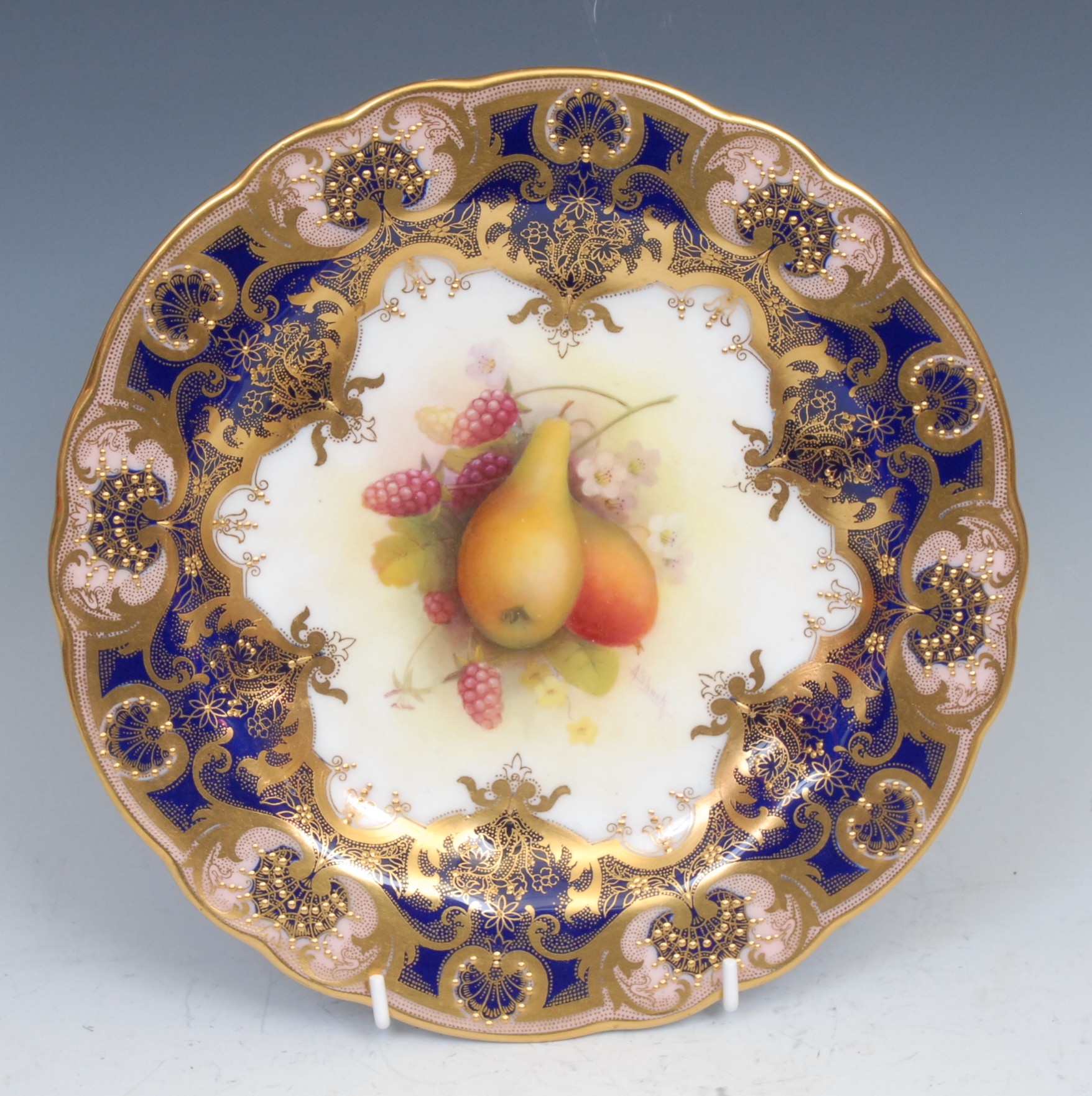 A Royal Worcester shaped circular plate, painted by Albert Shuck, signed, with ripe pears and raspberries, within fancy gilt cartouche, the border with six shaped cartouches in pink applied in gilt with leafy scrolls jewelled in gilt, on a cobalt blue ground, printed crown and circle mark in puce, 23cm diameter, date code for 1926