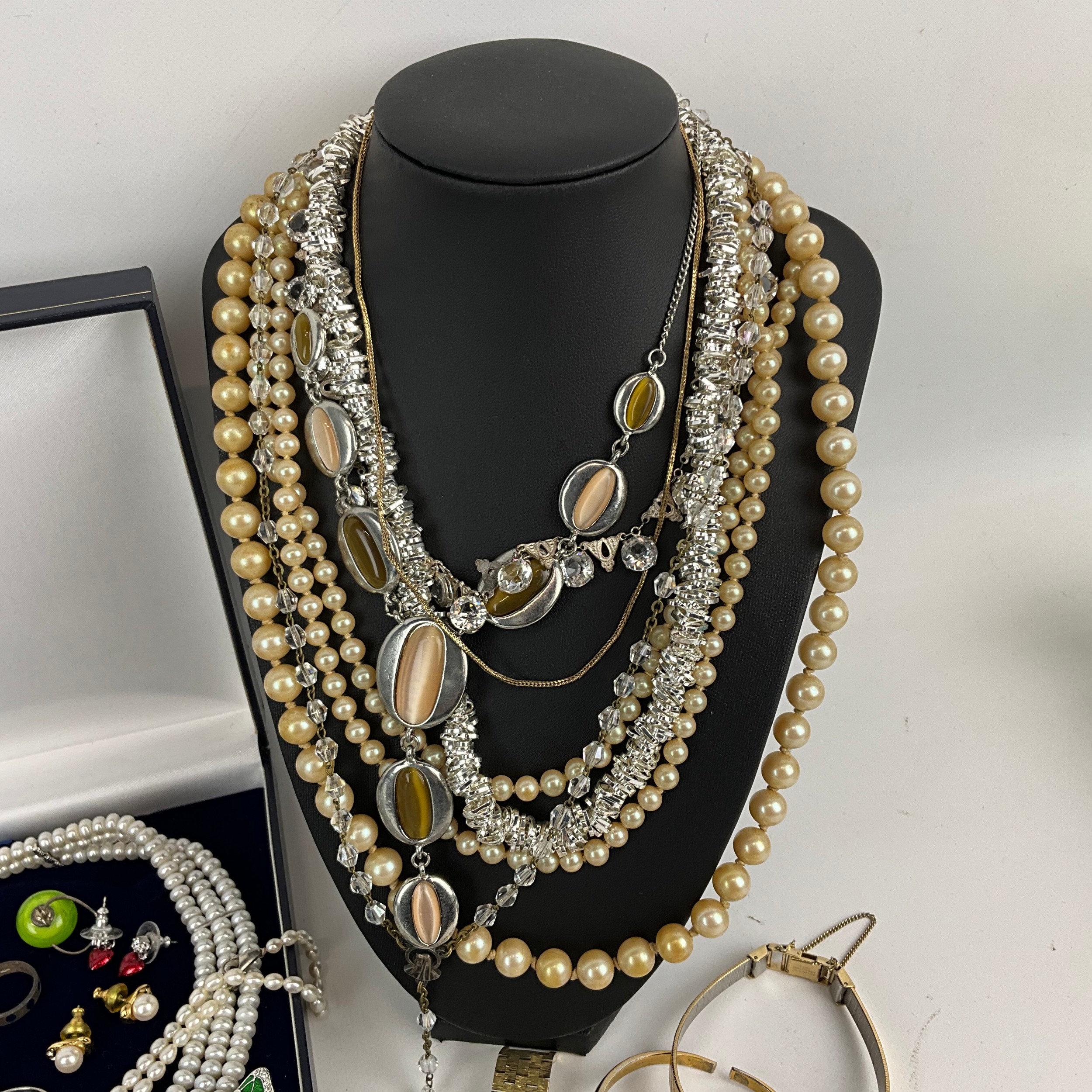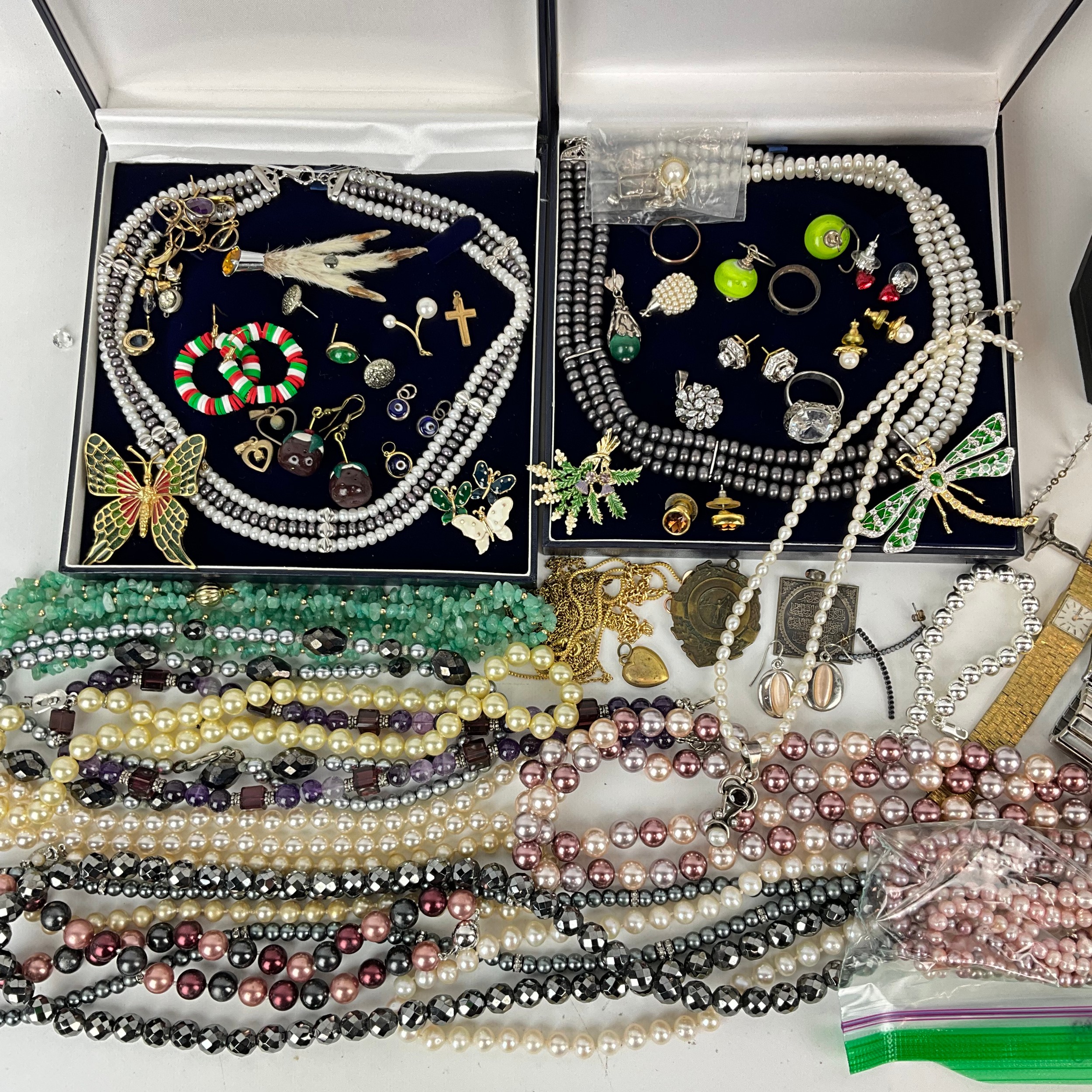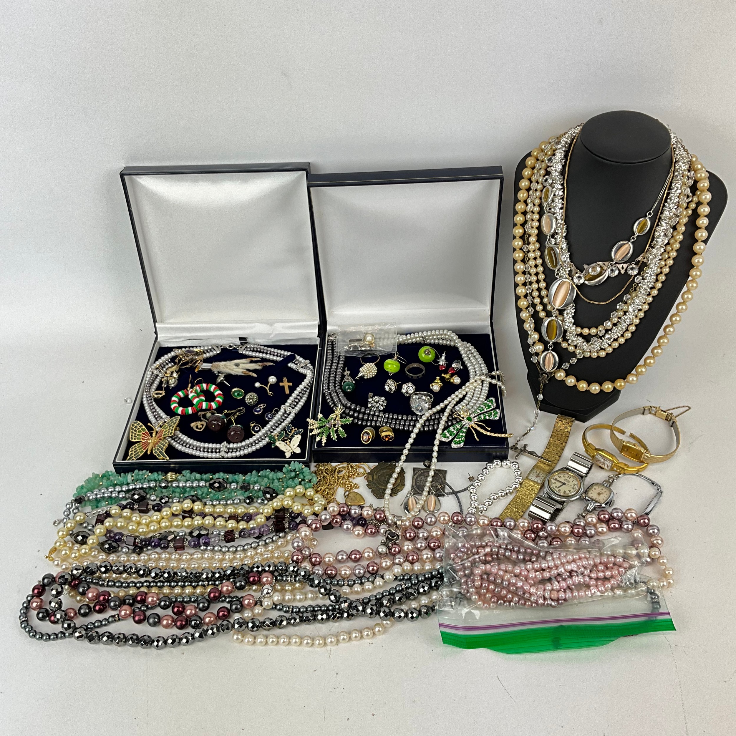 A collection of mixed costume jewellery, to include a 9ct gold hallmarked articulated necklace, weight 2.42 grams; along with a Romer shock-resistant watch, Rotary watch, necklaces, pendants and other costume jewellery.