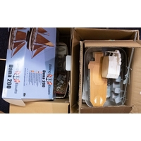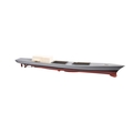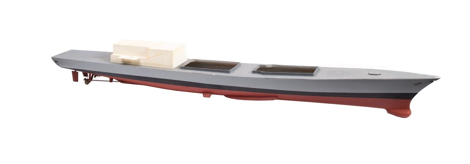 A part complete scale model of a destroyer. Having a fibreglass hull and wooden deck painted in grey with a red keel, fitted with running gear and rudder etc.