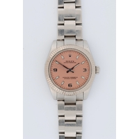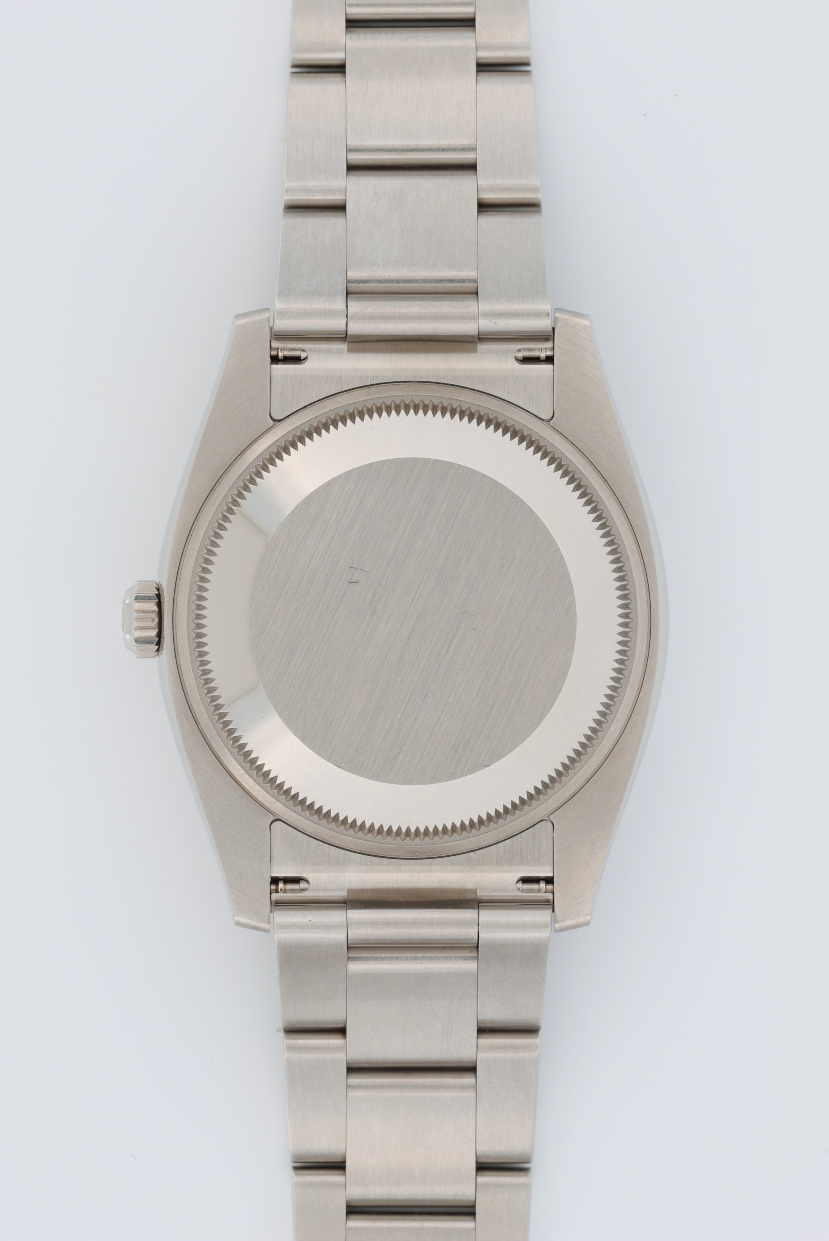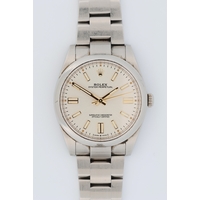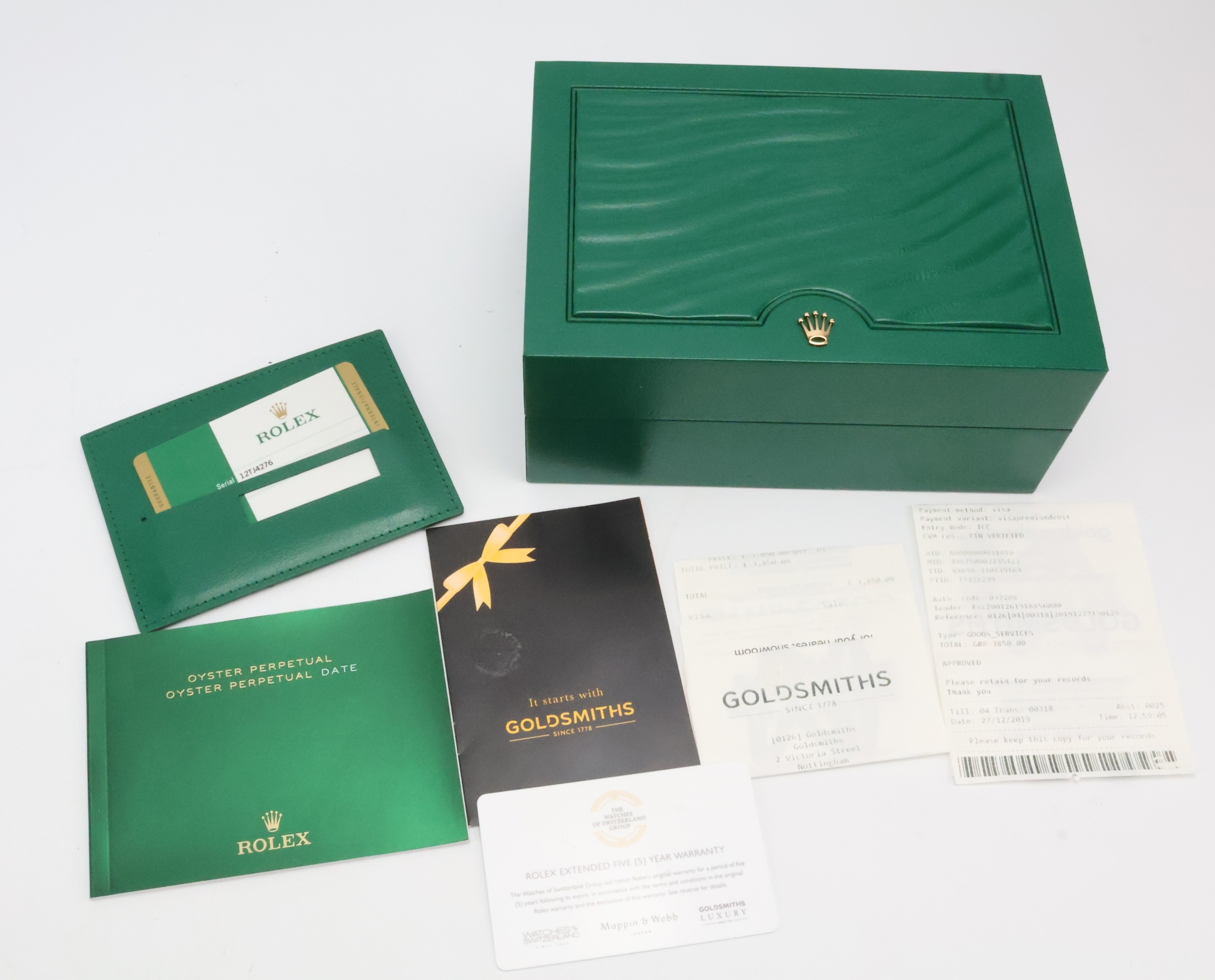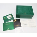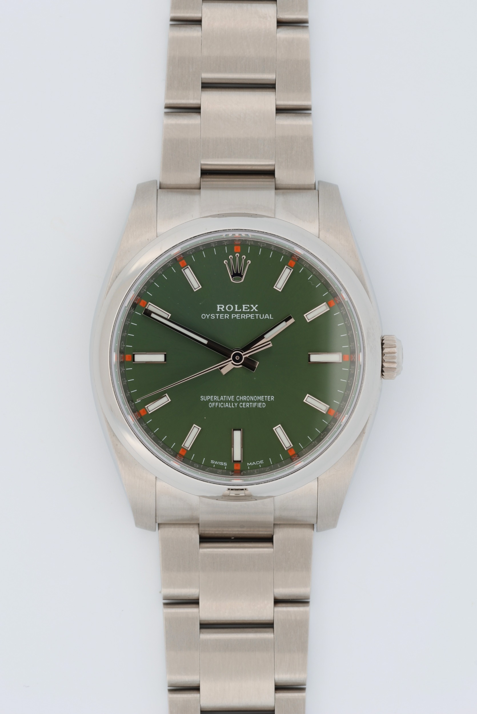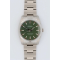 Rolex Oyster Perpetual 34, stainless steel, ref. 114200, 2019 card. The green dial with luminous baton indices, steel hands. Rolex automatic movement cal.3130 movement, signed bracelet, complete with box and paperwork. Working when catalogued
