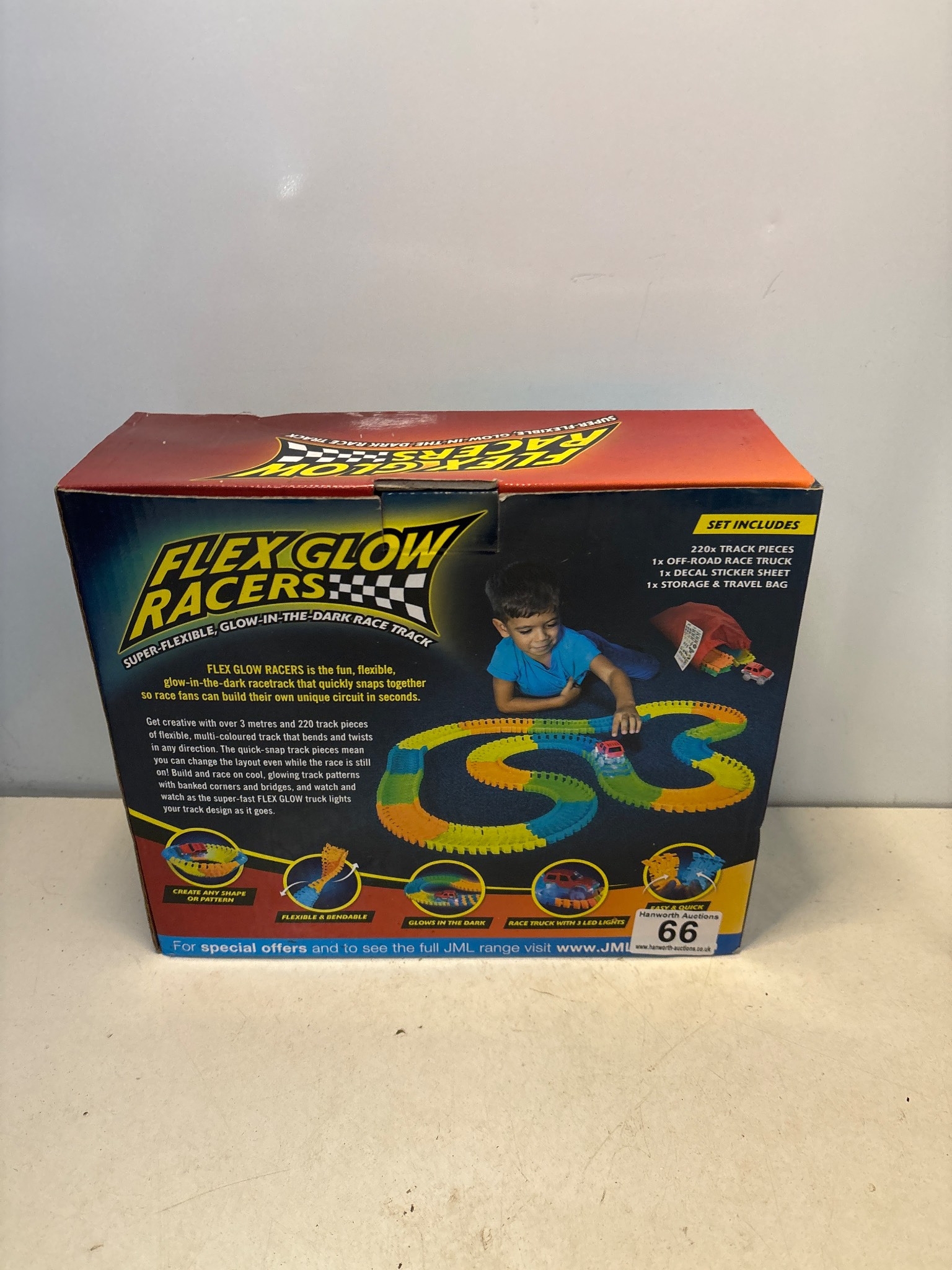 Flex Glow Racers track set with 66 pieces, including a battery-operated racing car. Suitable for children and featuring flexible track design. Packaging shows slight wear.