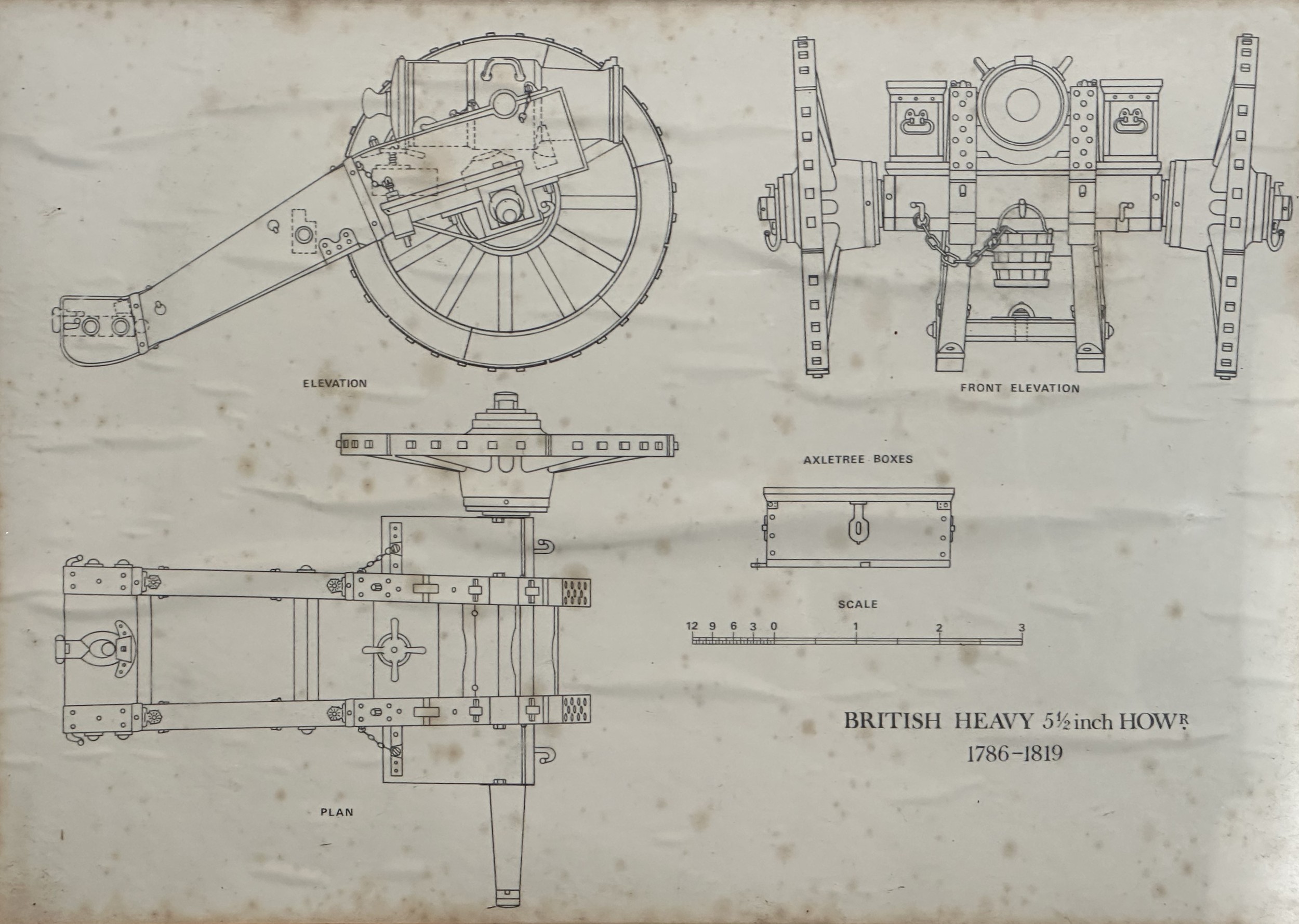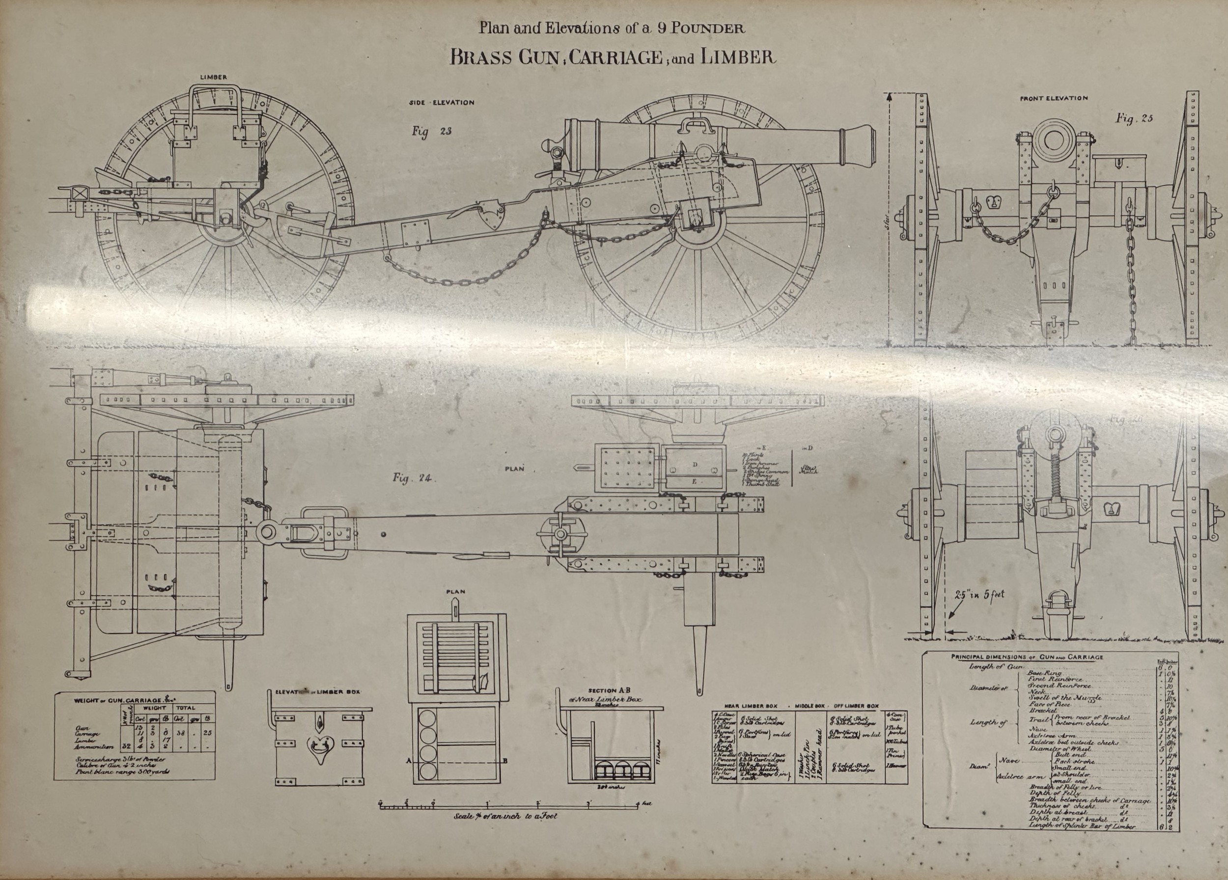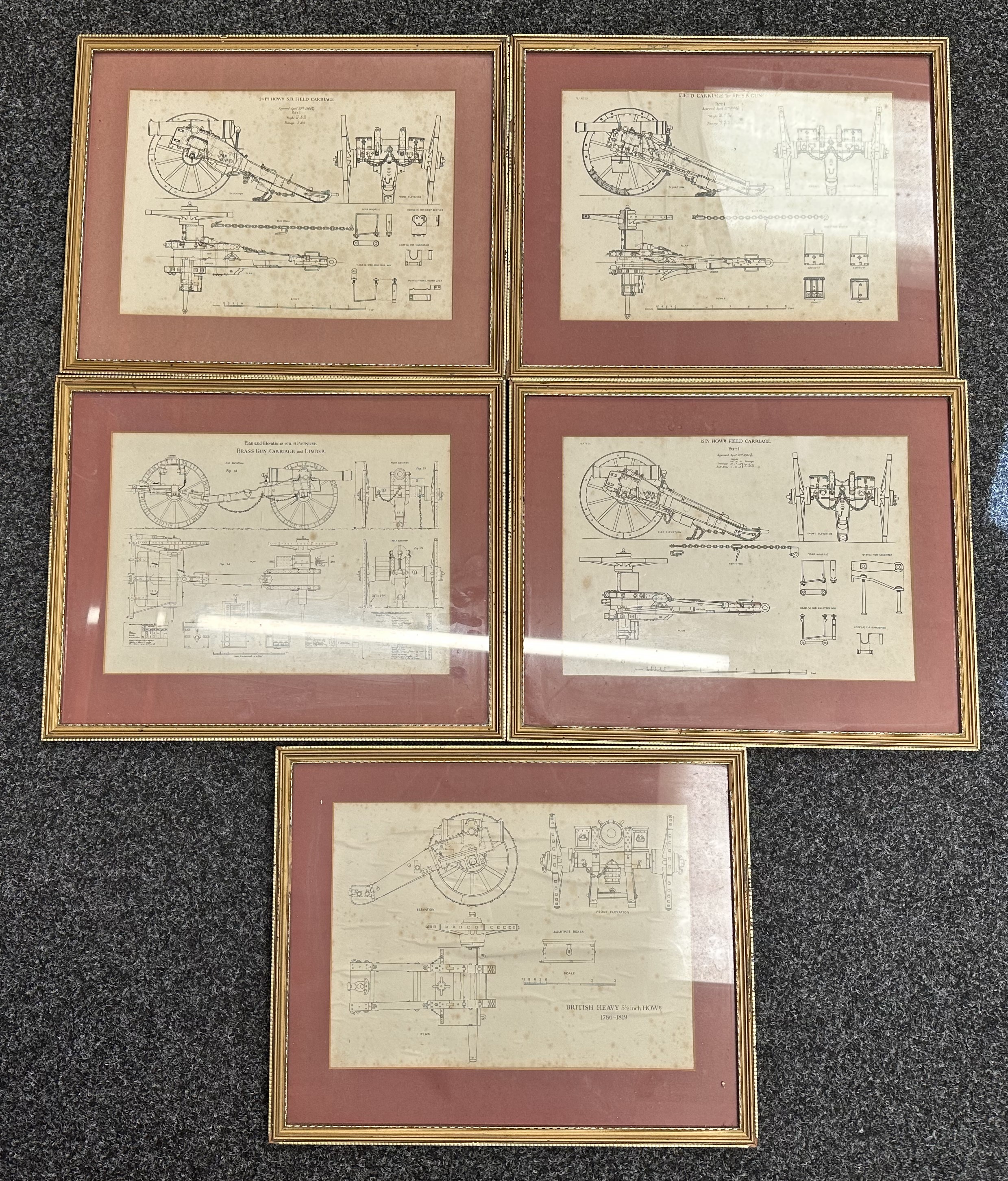 Set of five framed prints taken from Royal Artillery Manuals. Overall size including frame 52cm x 42cm. (5)