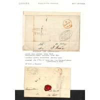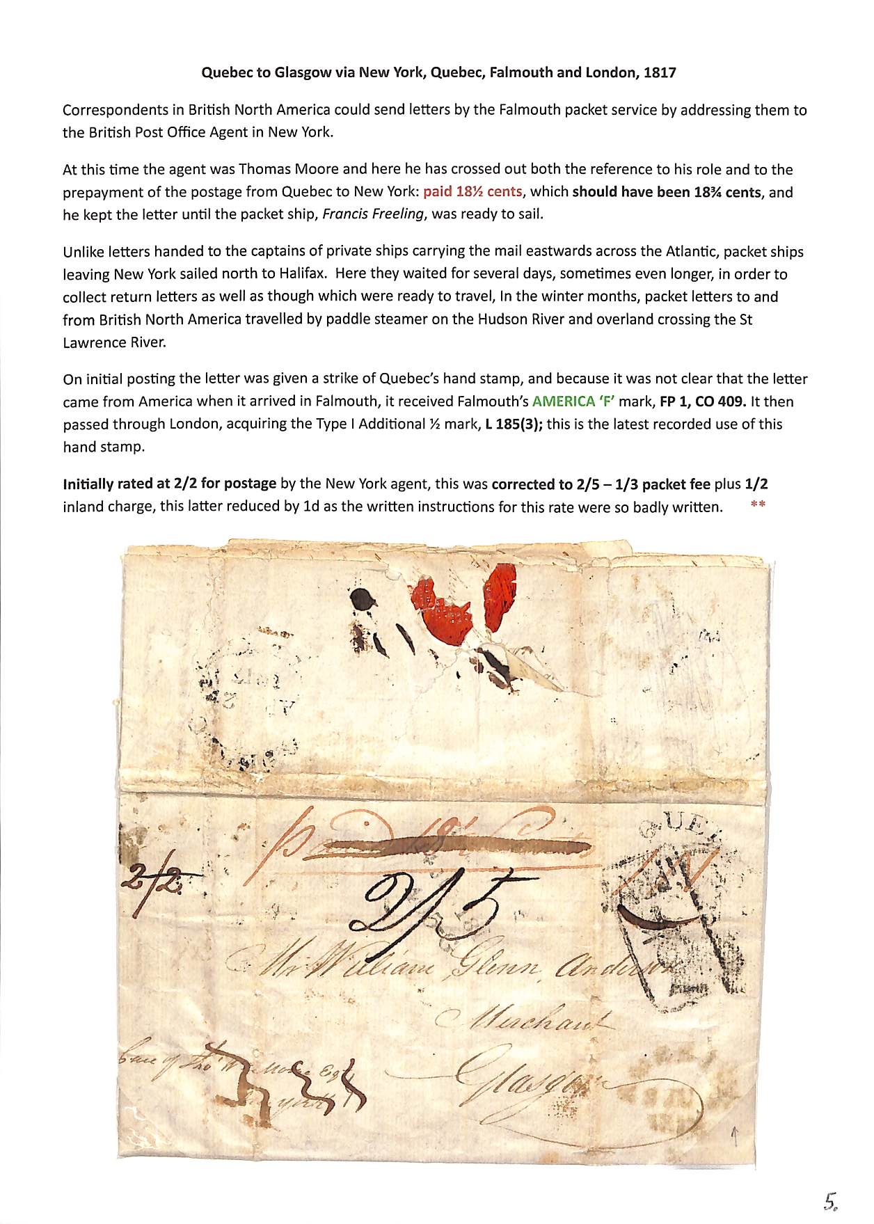 Falmouth. 1817 (Apr 16) Entire letter from Quebec to Glasgow directed "care of Tho. W. Moore, New York" (the British Post Office agent in New York) and prepaid 18√¶ cents U.S internal postage to New York, "QUEBEC" datestamps on both sides (AP 24, the "4" inverted) and green "AMERICA / F" datestamp (June 9) applied at Falmouth. File folds, an unusual routing via New York, the America F datestamp very scarce on mail from Canada.