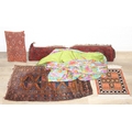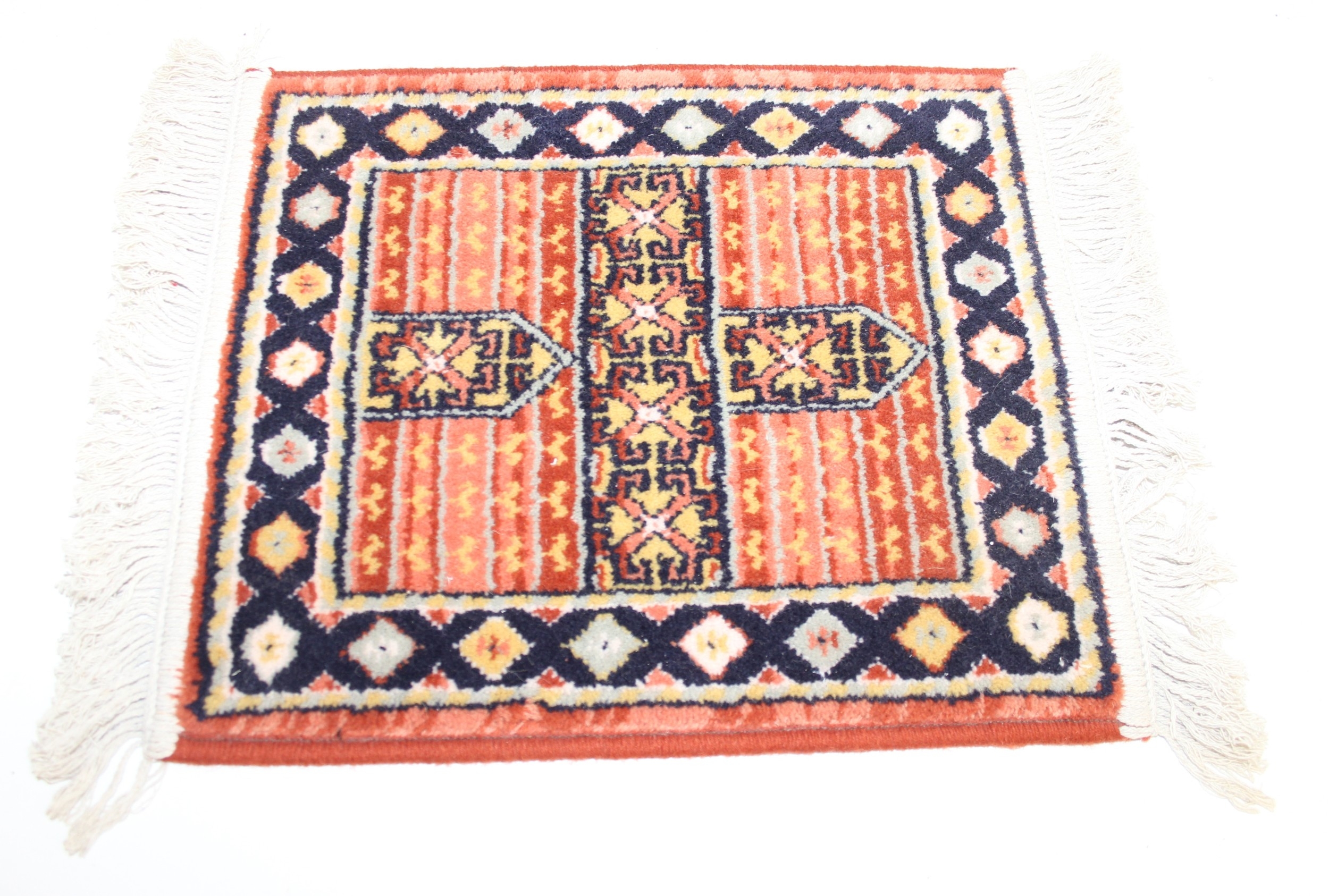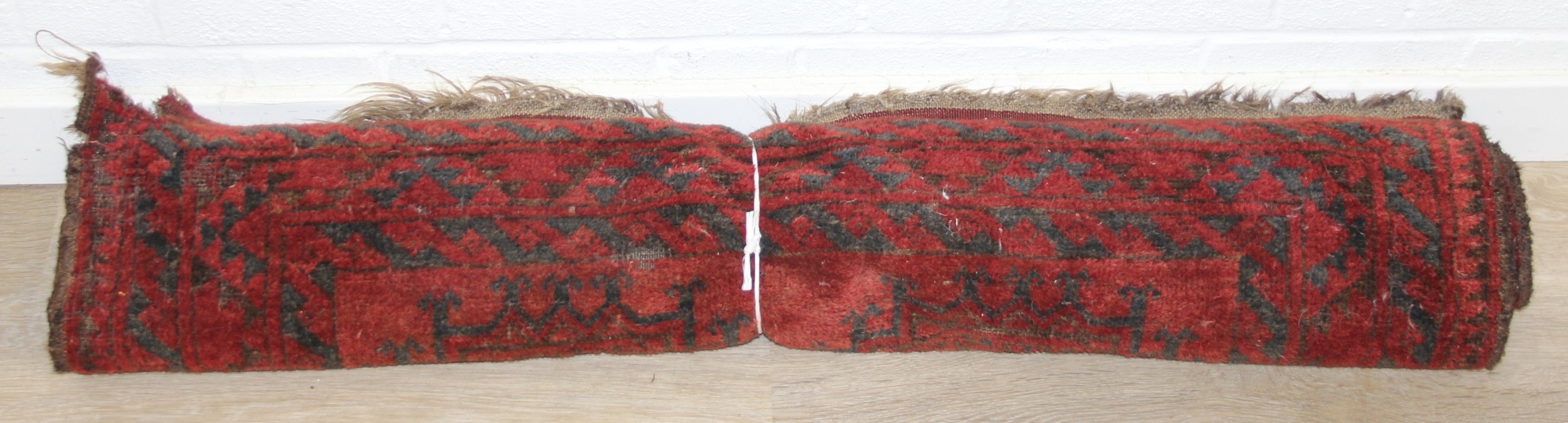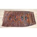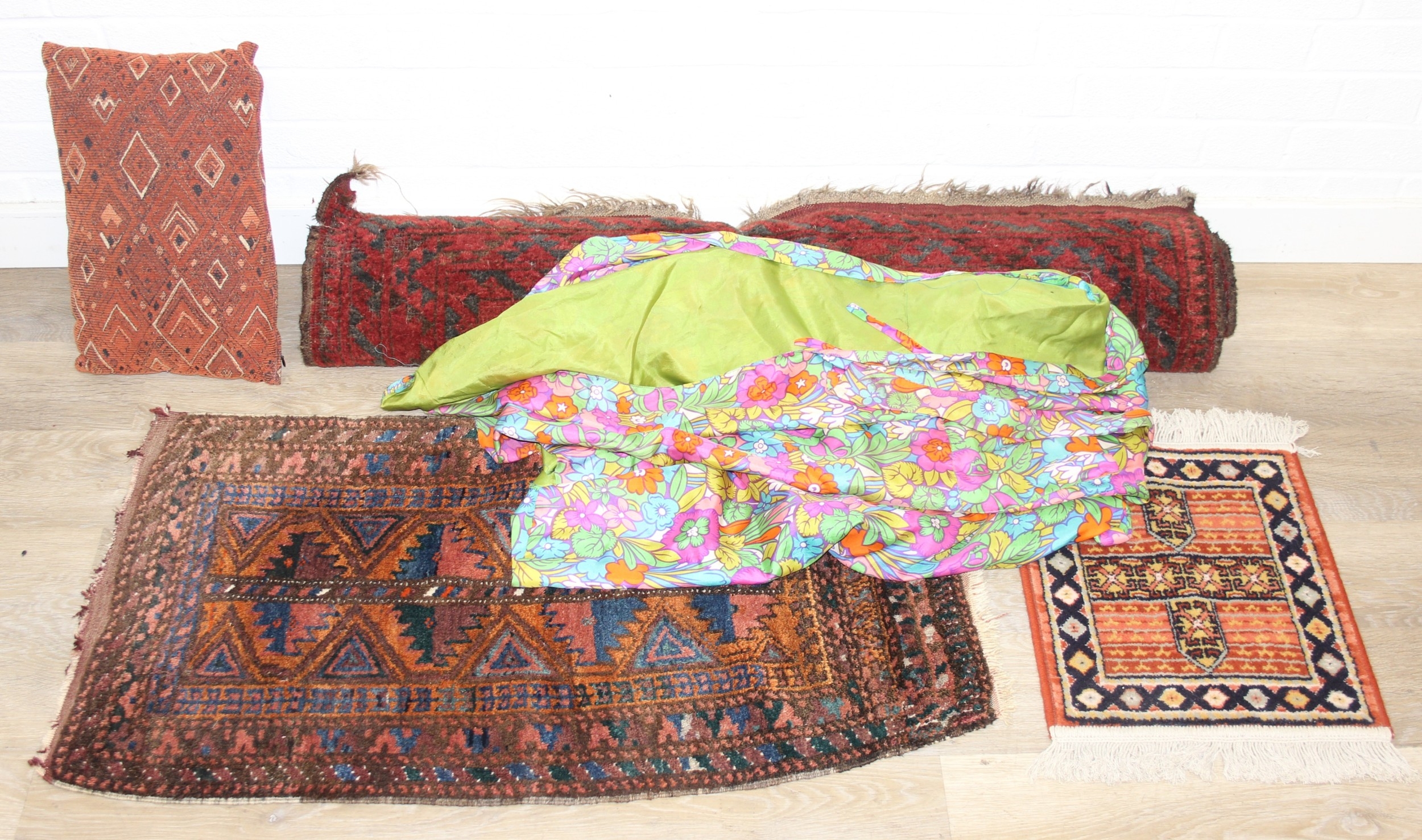 Mix of textile items to incl a vintage red ground Turkoman rug, hand knotted (212cm x 114cm), 2 other smaller rugs/mats, cushion and a retro flower-power style dressing gown [5]