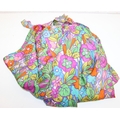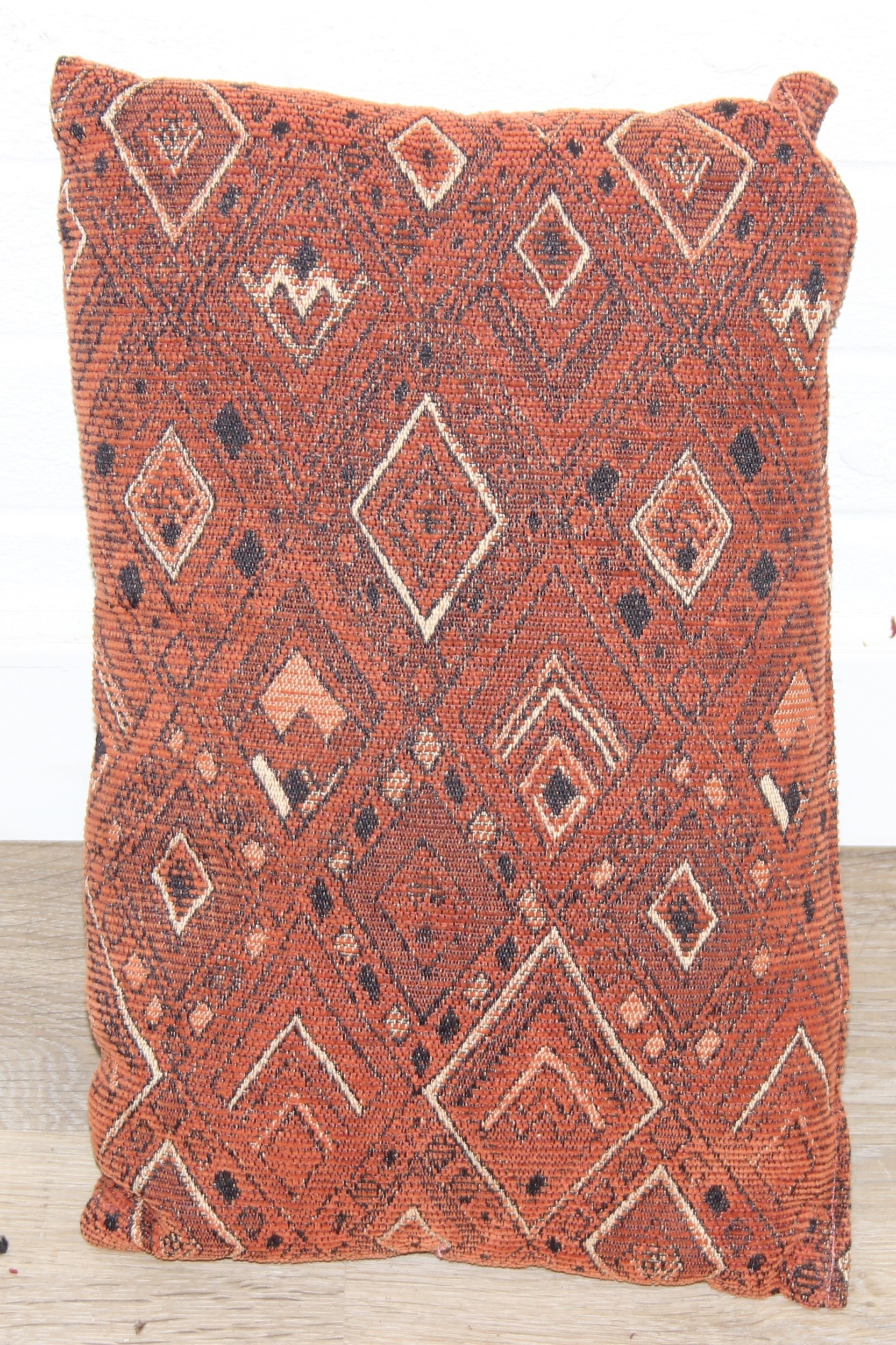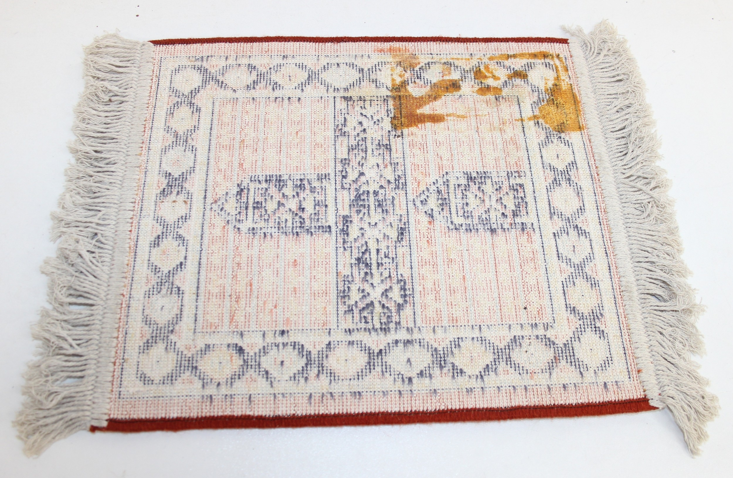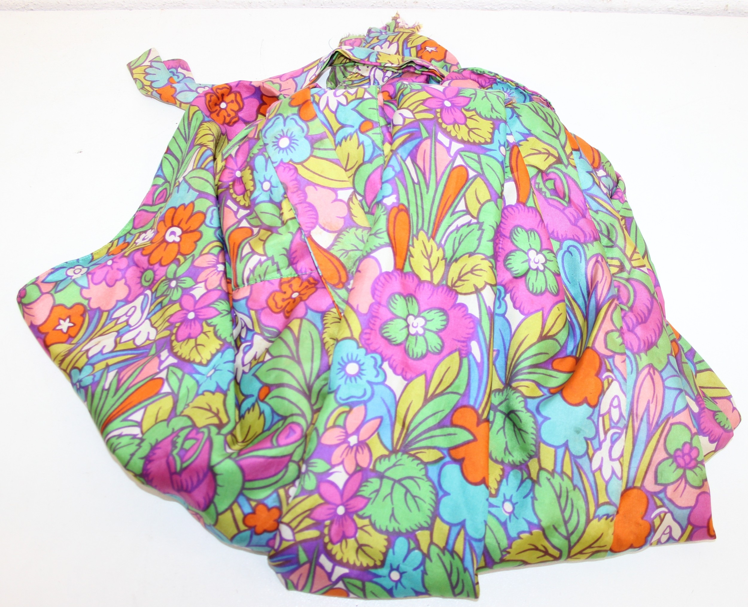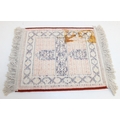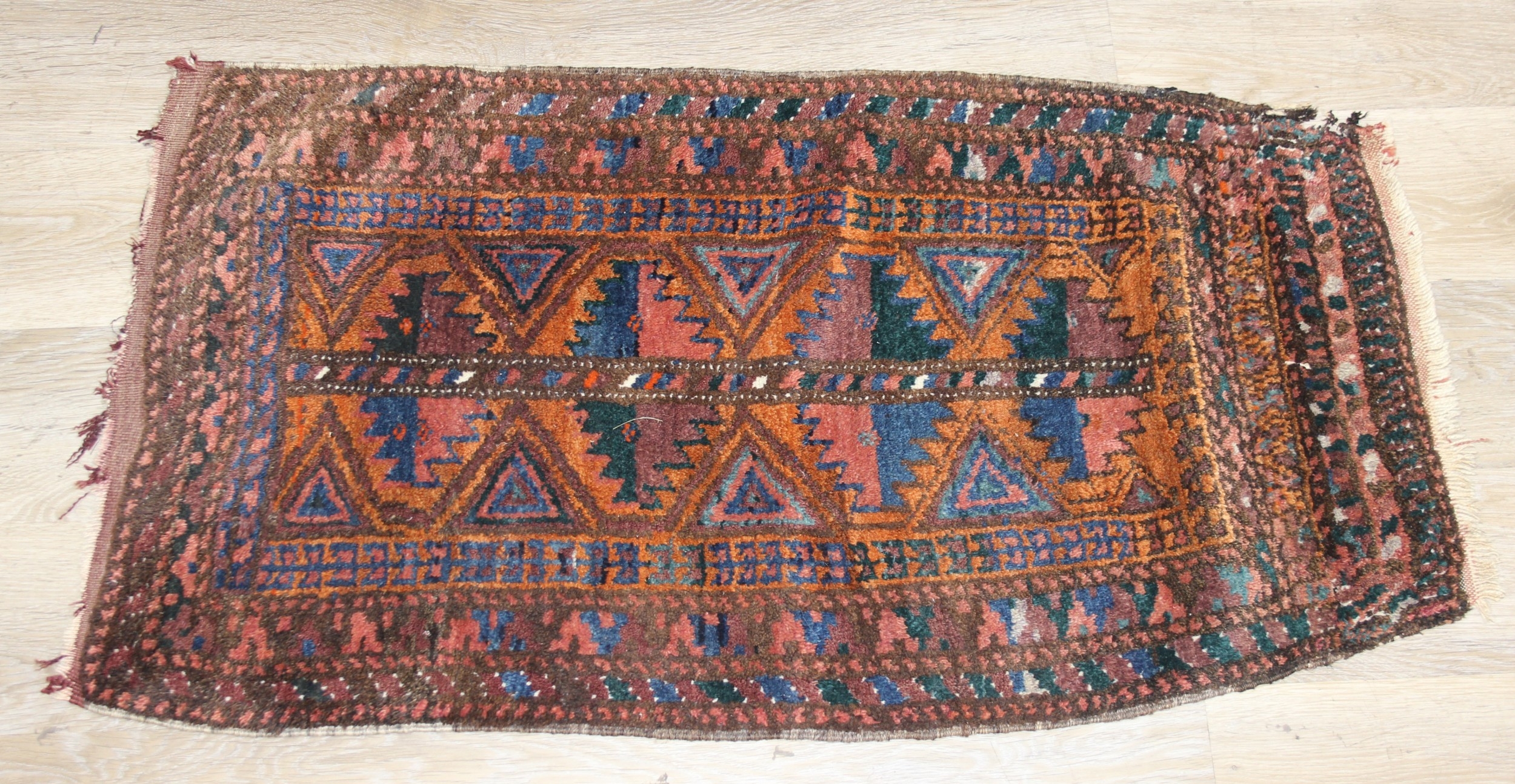 Mix of textile items to incl a vintage red ground Turkoman rug, hand knotted (212cm x 114cm), 2 other smaller rugs/mats, cushion and a retro flower-power style dressing gown [5]