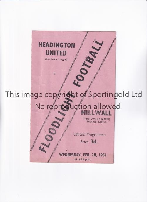 1951 HEADINGTON UNITED V MILLWALL A four page card programme for the friendly at The Manor Ground on 28/2/51. Generally good