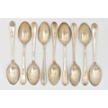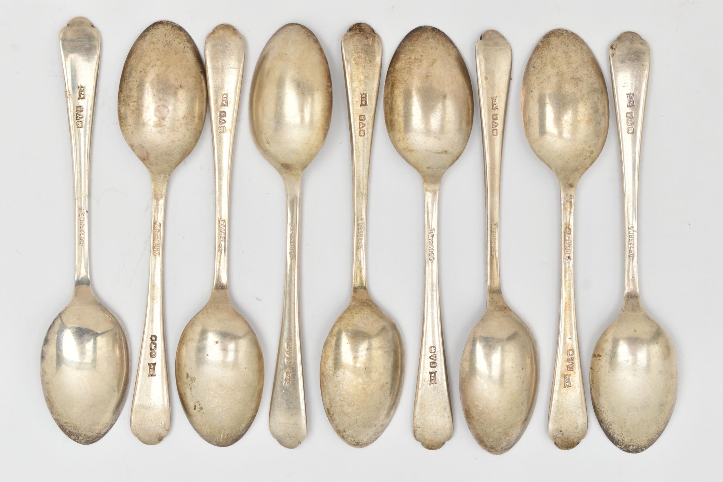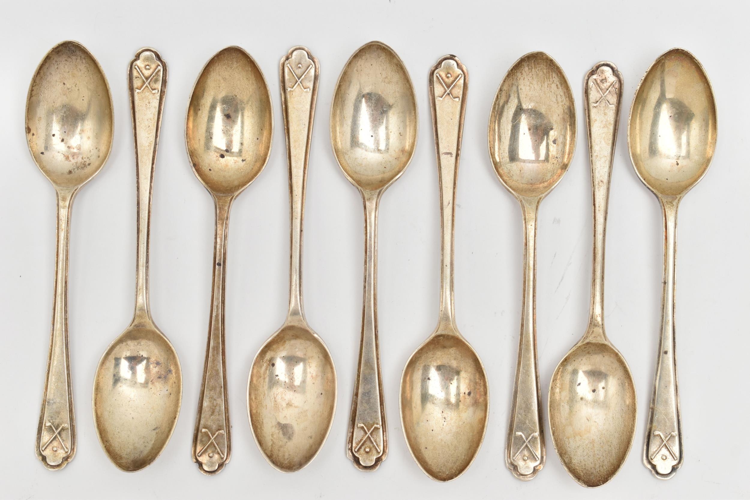 A SET OF NINE SILVER TEASPOONS, all with golf motifs to the terminals, all with silver hallmarks for Walker & Hall, Chester 1933, approximate total weight 122.6 grams