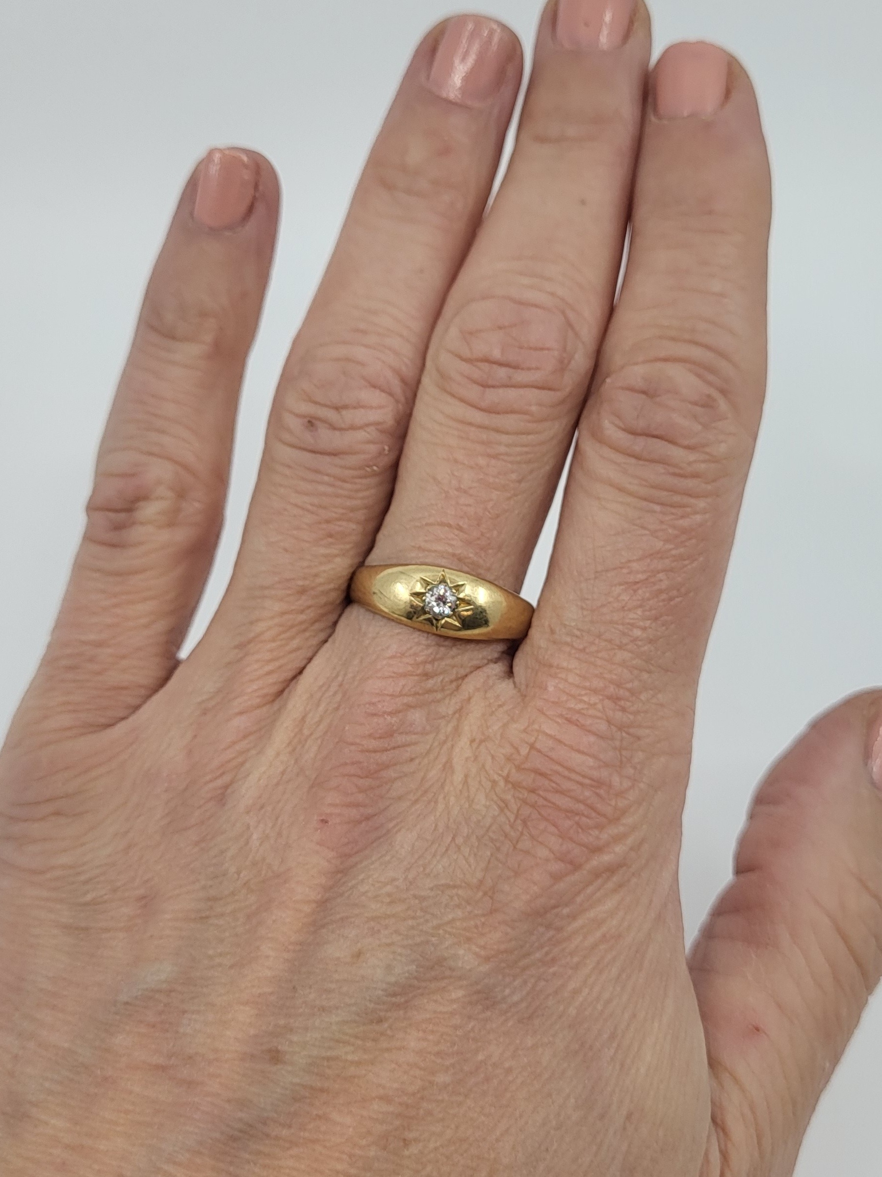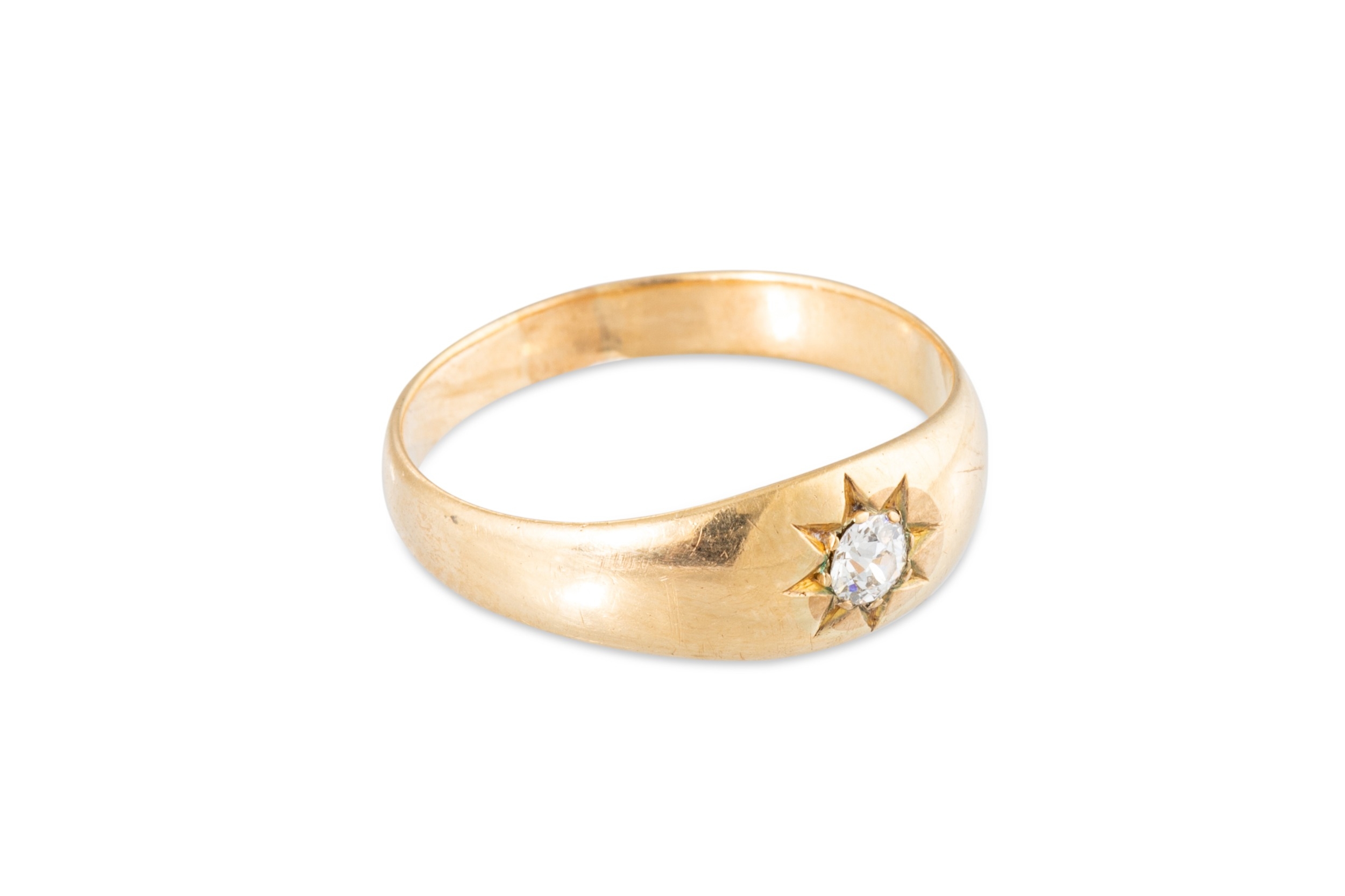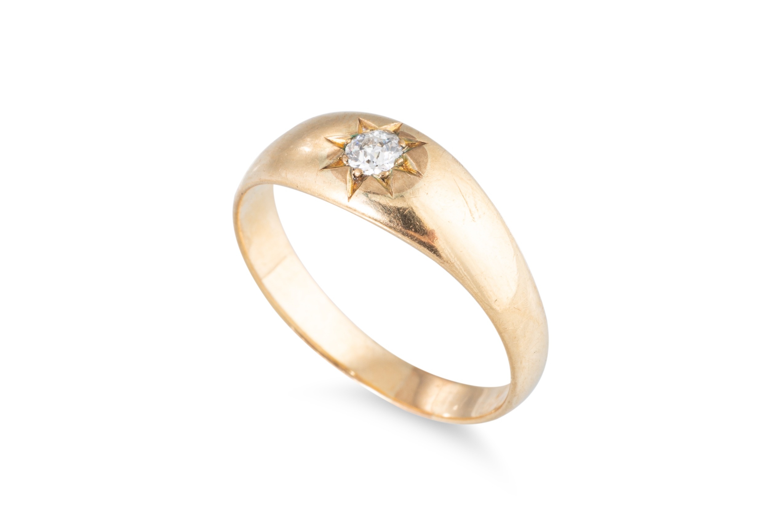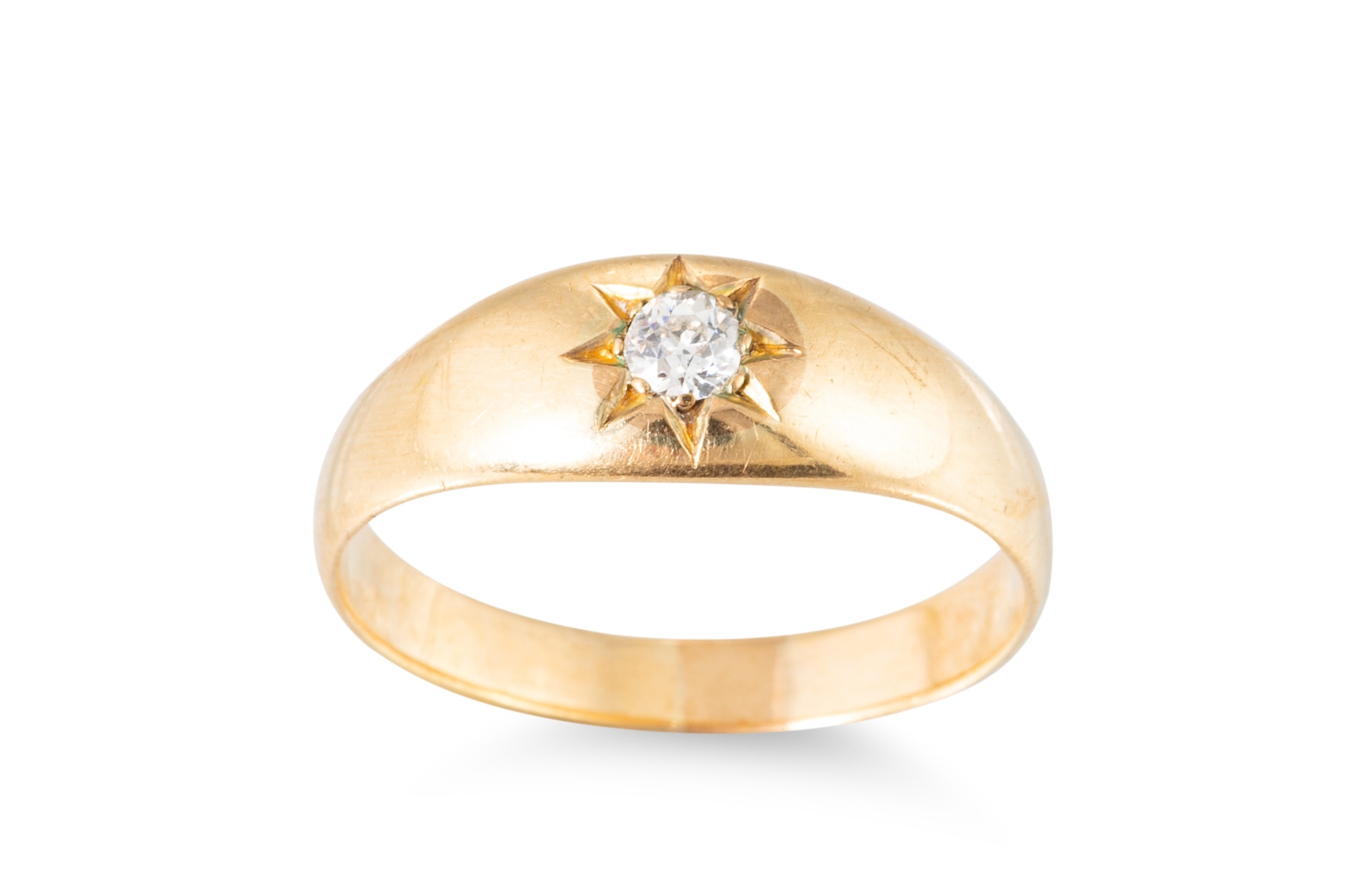 AN ANTIQUE DIAMOND SET RING, the old cut diamond inset in star setting, mounted in yellow gold, XRF test shows 56.5% (possibly 9ct with flash plating) 3.6 g., size S