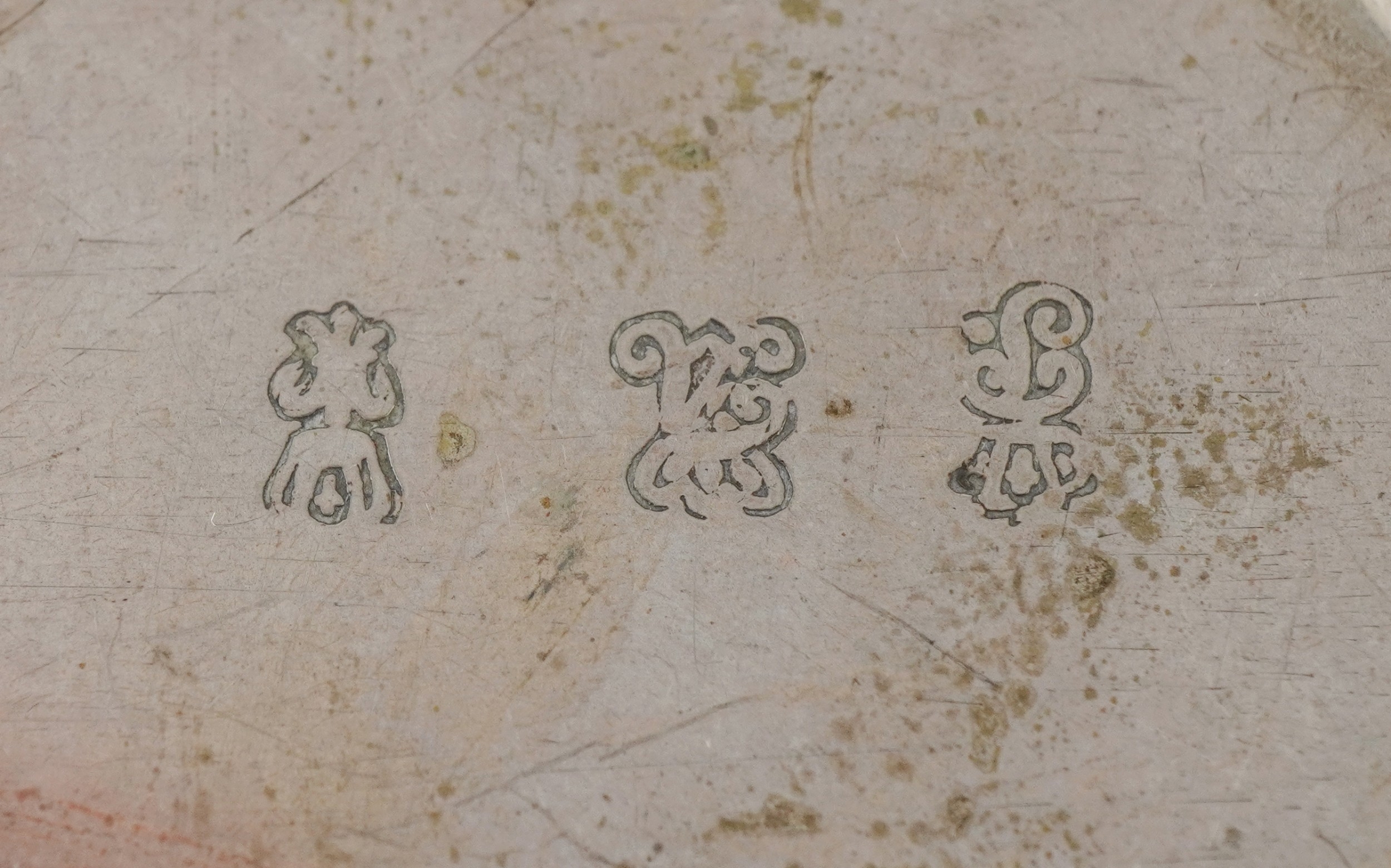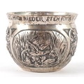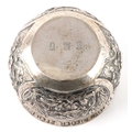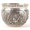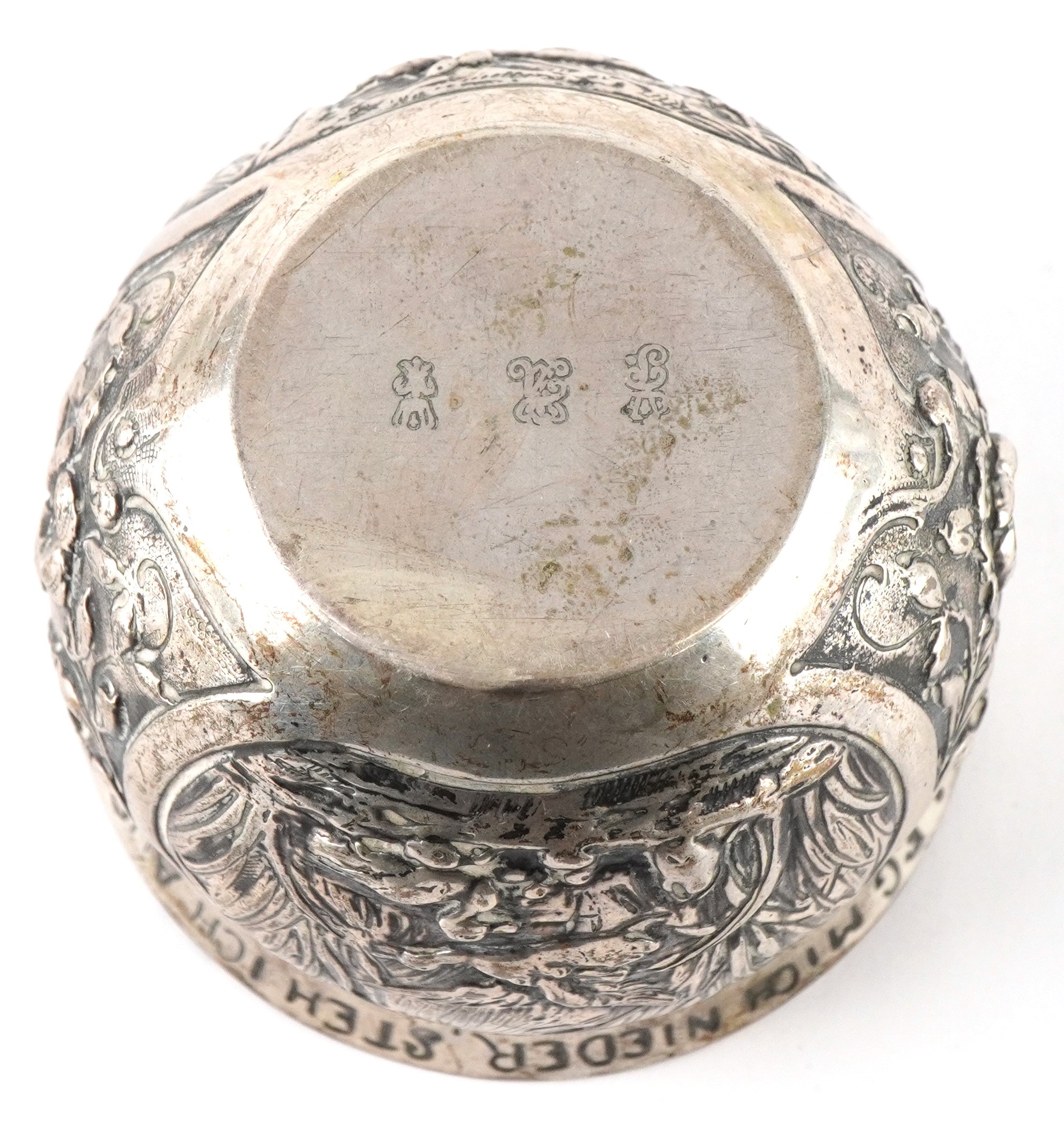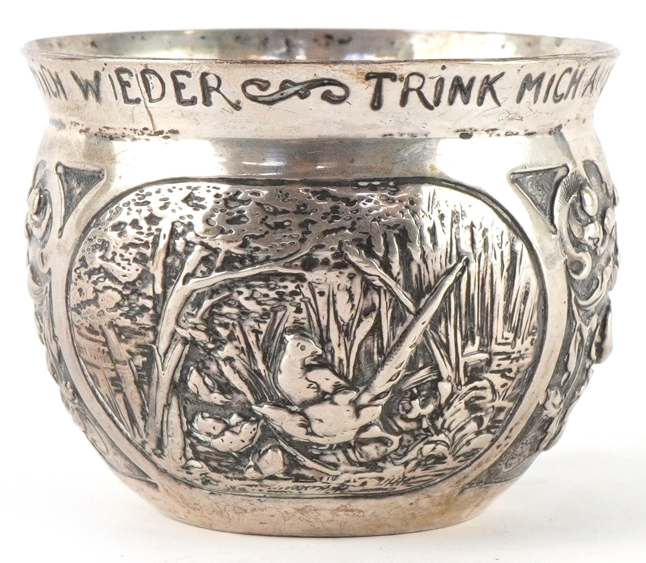 A German silver cup decorated with panels embossed with birds and foliage, inscribed 'Drink me up and lay me down, I get up so full again', translated from German, 6cm high, 82.4g.