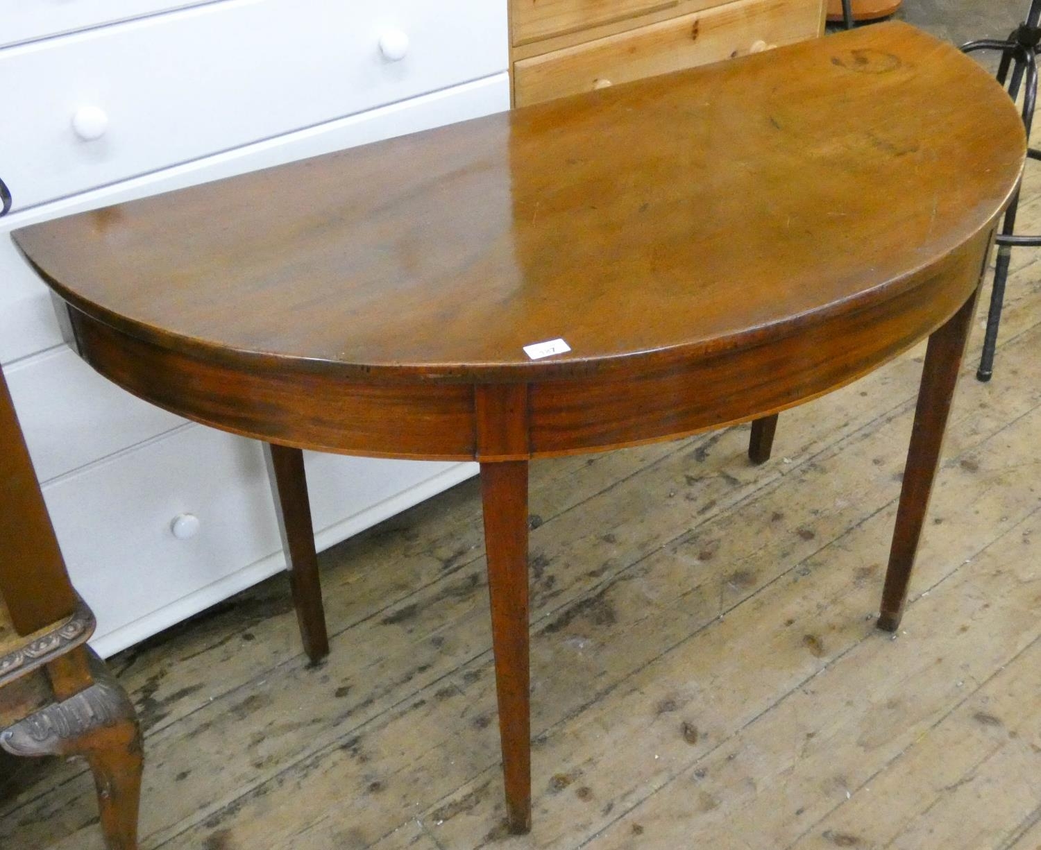 Antique mahogany semi-circular side table on square taper legs, 4'3 wide