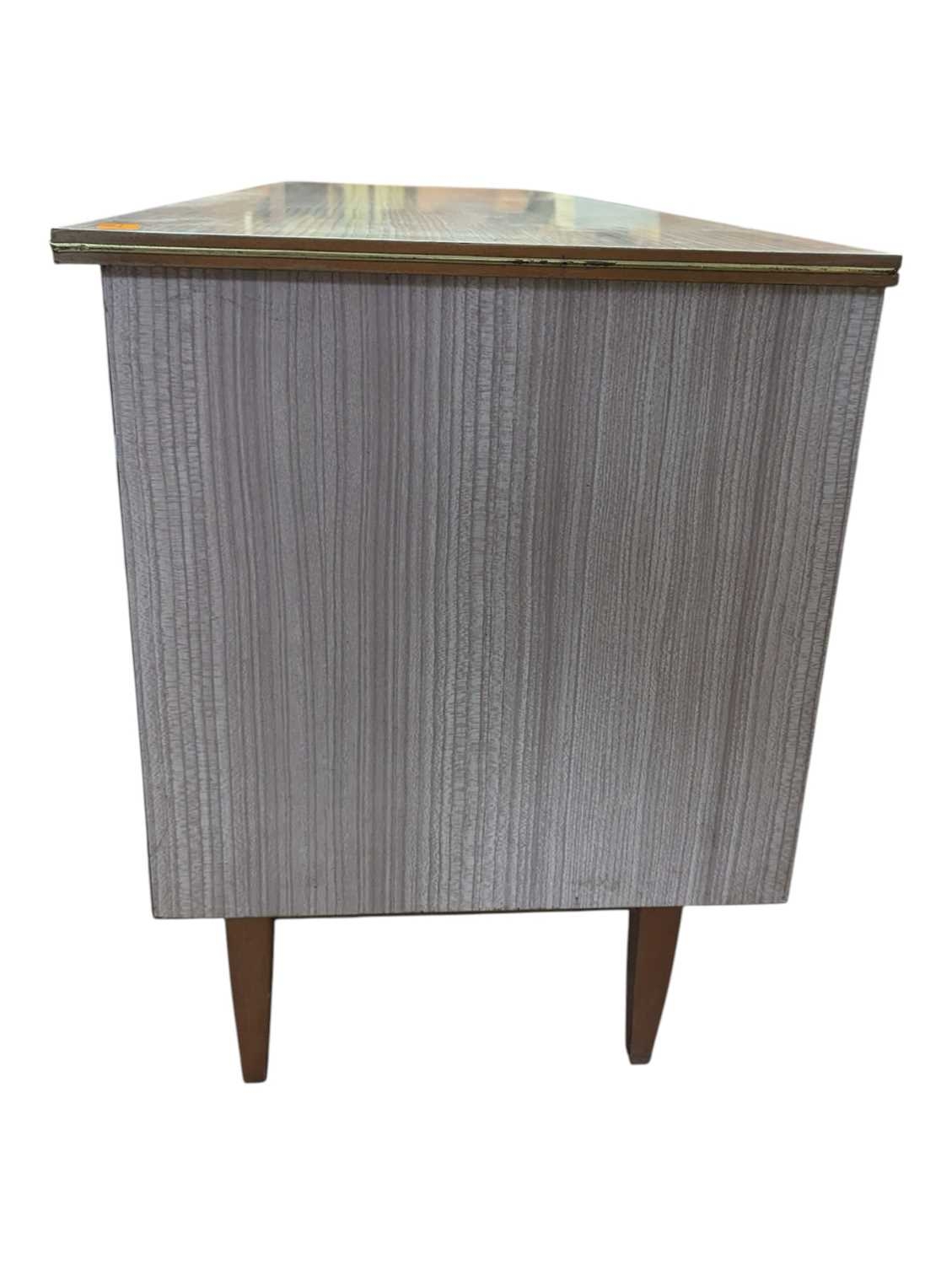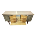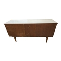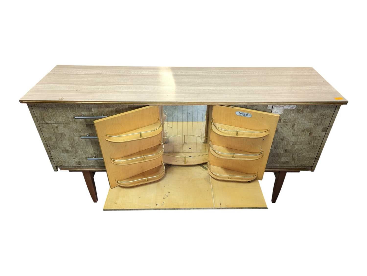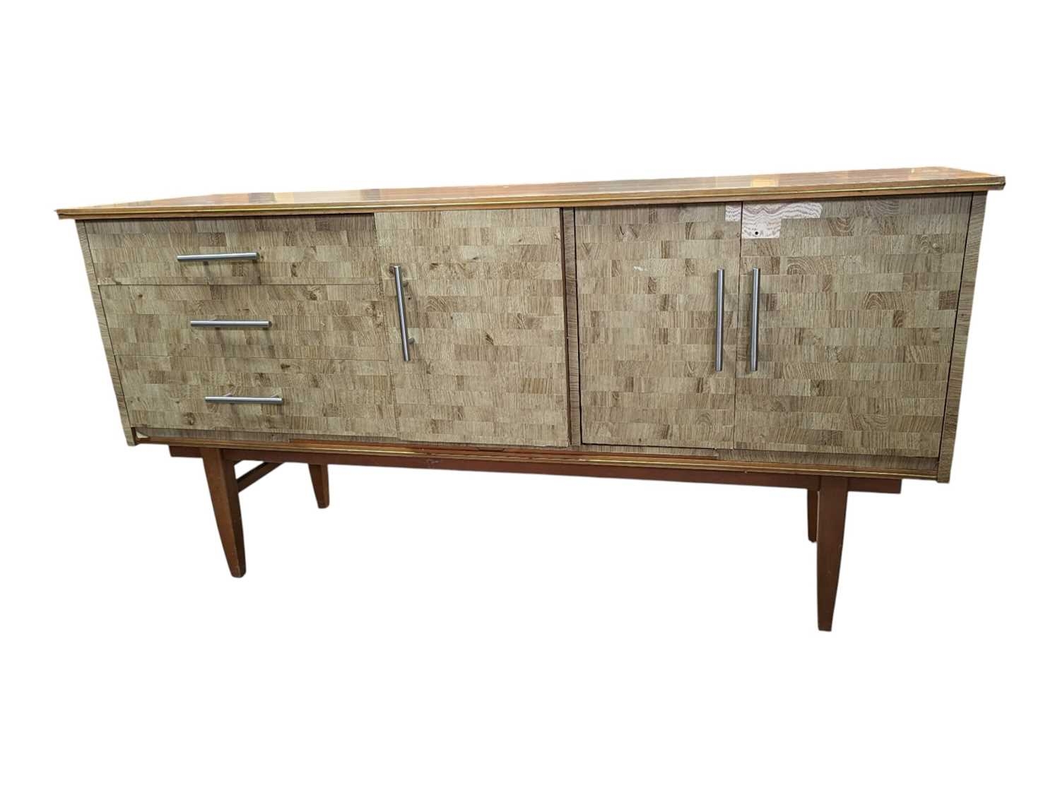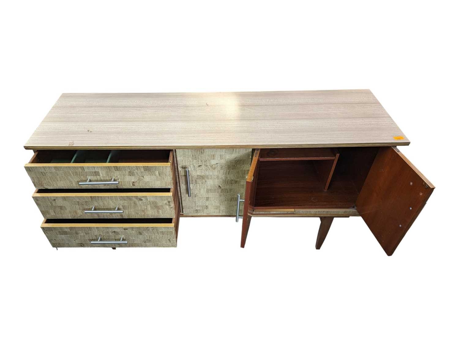 Beautility Furniture - A vintage 20th century Formica sideboard credenza. Chequered formica design to front with a series of cabinet doors and drawers. With shaped atomic pull handles raised on teak tapering legs. Measures approx: 76x153x47cm