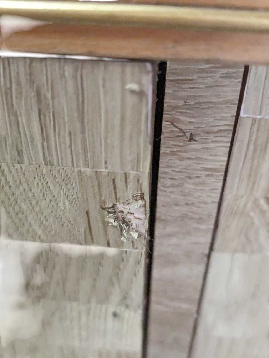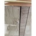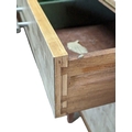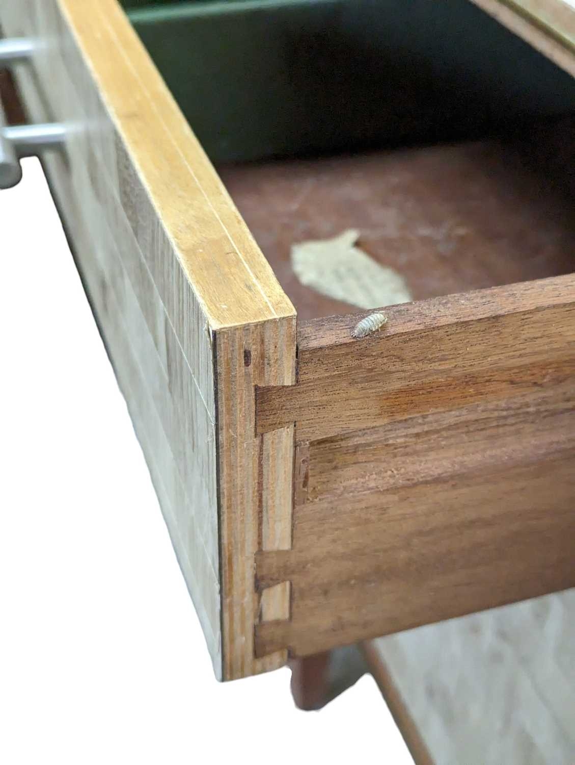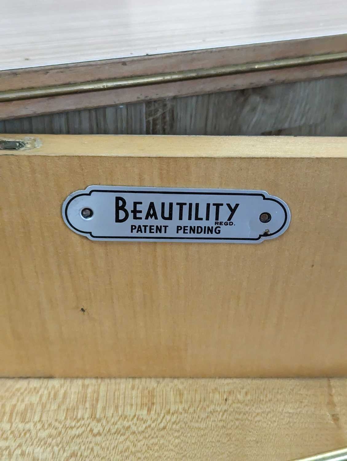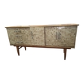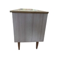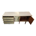 Beautility Furniture - A vintage 20th century Formica sideboard credenza. Chequered formica design to front with a series of cabinet doors and drawers. With shaped atomic pull handles raised on teak tapering legs. Measures approx: 76x153x47cm