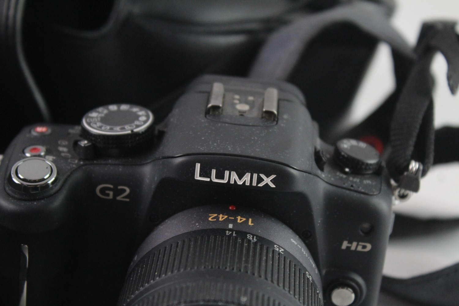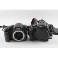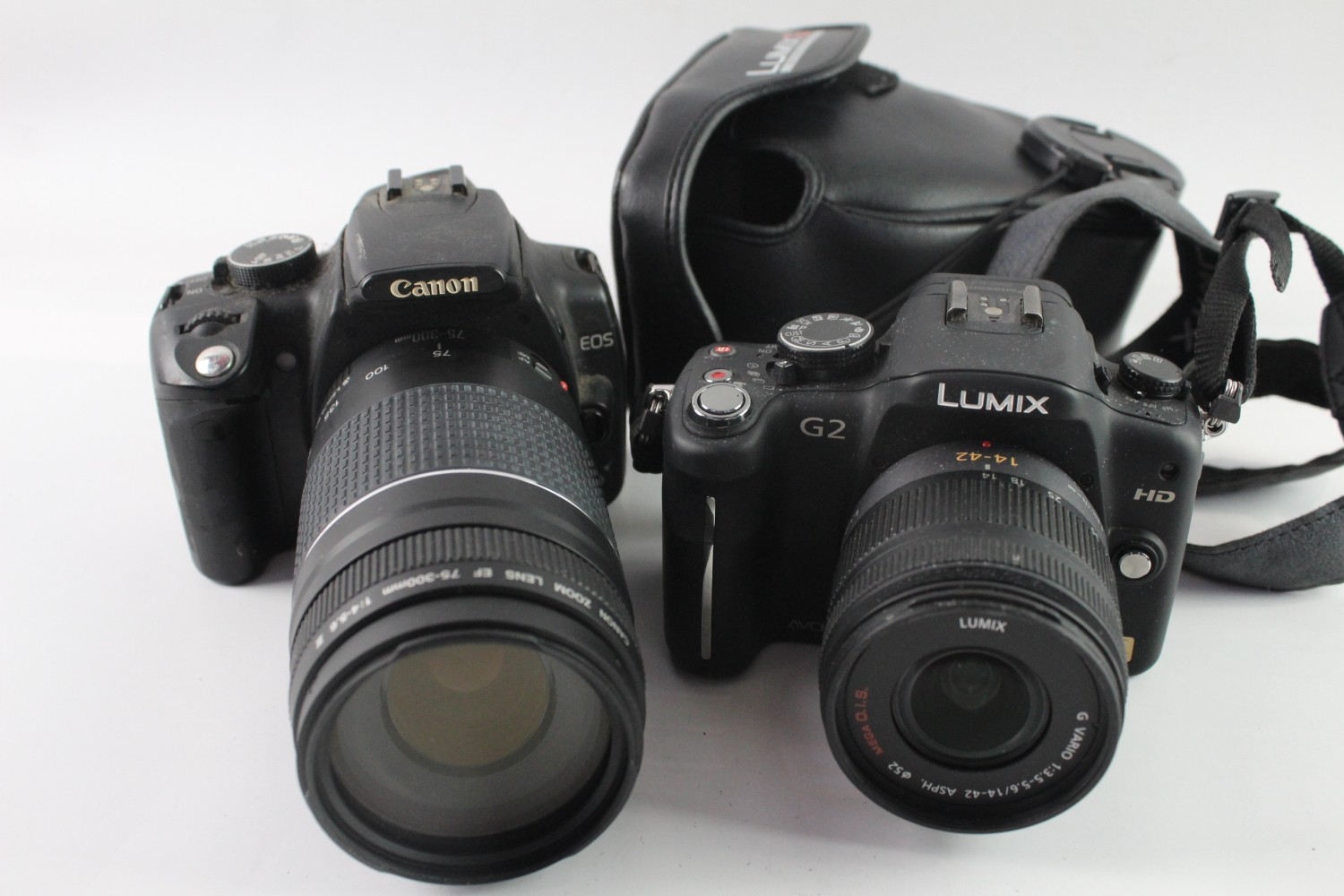 Two digital cameras, one Panasonic Lumix DMC-G2 12.1mp mirrorless fitted with G Vario 1:3.5-5.6 14-42mm lens and one Canon EOS 350D 8mp APS-C CMOS sensor DSLR fitted with EF 1:4-5.6 III 75-300mm zoom lens