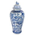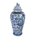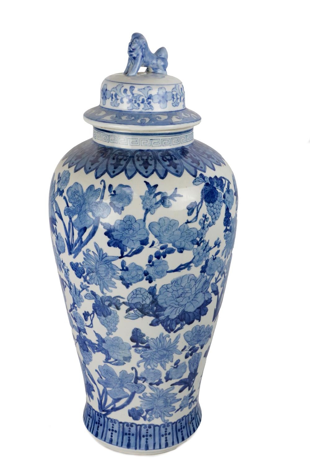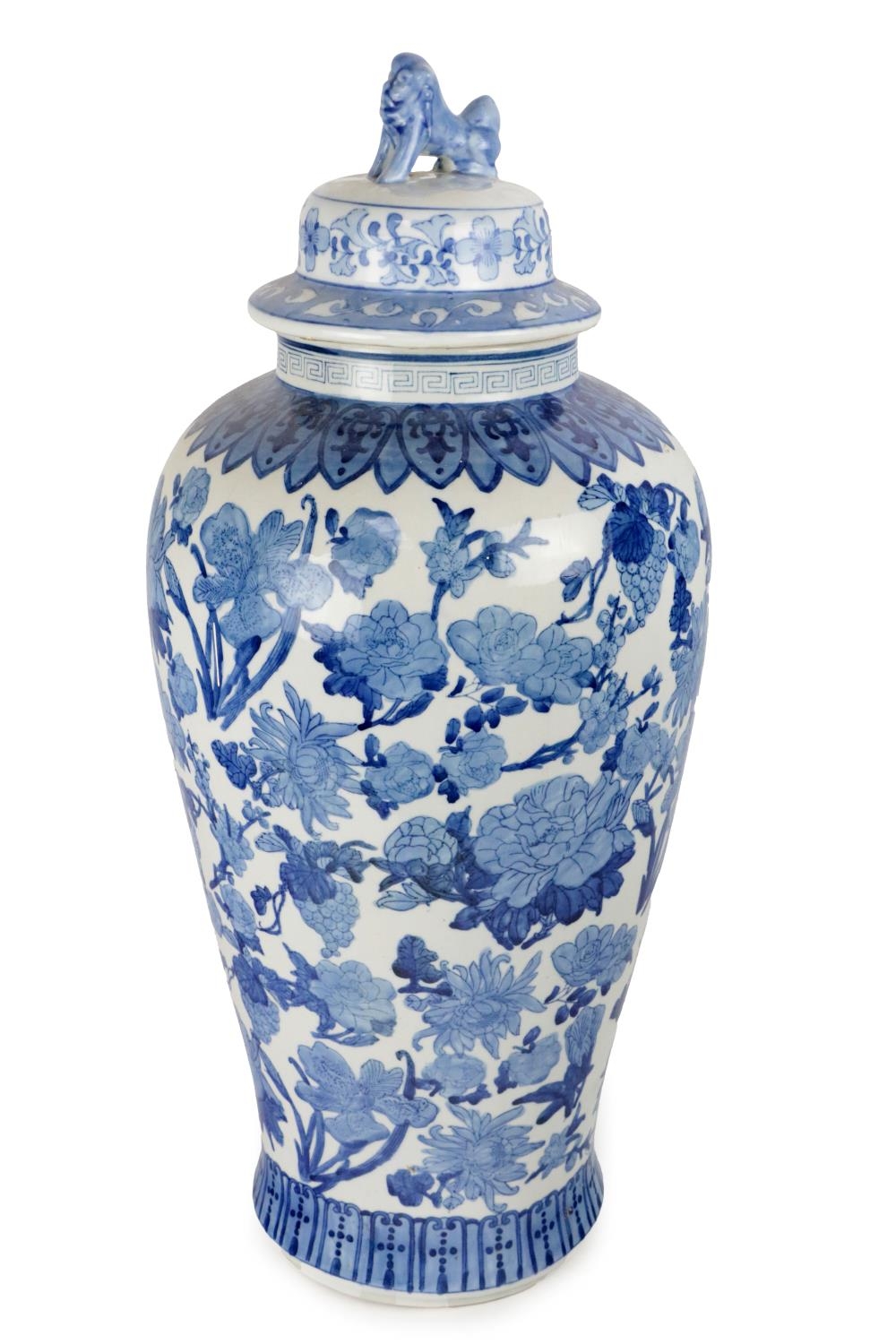 A tall Chinese blue and white baluster shaped Vase and Cover, with all over floral pattern, the cover with a Foo Lion, 72cms (28") h. (1)