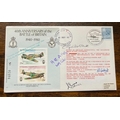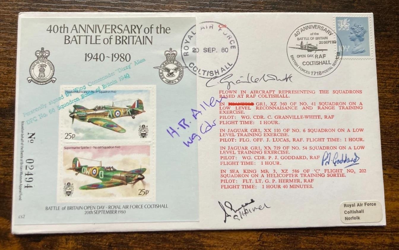 Wg Cdr H R Dizzy Allen DFC Battle of Britain ace signed 40th ann BOB RAF WW2 FDC. RARE autograph. Personally Signed by Wg Cdr H R ( Dizzy) Allen 66 Sqn WW11 Ace 13 victories and 1 shared destroyed, 2 probable's, 13 damaged, 4 V-1s destroyed. died 1987. Also signed by three RAF pilots who flew the covers. Allen joined 66 Squadron at Duxford on 13th April 1940. He and two other pilots shared in damaging a Ju88 on 19th June. On 30th August Allen shared in destroying a Do17, on 9th September he shared a He111, on the 15th he shot down a He111 and damaged a Do17, on the 18th he destroyed a Me109 and probably one on the 30th. In October Allen was appointed 'B' Flight Commander. On the 11th he got a probable Me109 and on 14th November he destroyed a Ju87 and damaged another. Over Edenbridge on the 28th, in Spitfire P7492, Allen collided with Sgt. Willcocks in P7491. Allen bailed out and landed safely but Willcocks was killed. On 11th December Allen destroyed a Me109. He was wounded in the right arm on 14th February 1941 after being jumped by Me109s. He crashed at Biggin Hill. Allen shot down a Me109 and shared another on 20th June and on 20th August he shared in the probable destruction of a Me109 off the Dutch coast. After being awarded the DFC (gazetted 22nd July 1941), Allen was promoted to Acting Squadron Leader in October 1941 and given command of 66 Squadron. He was posted away in December 1941 to 286 Squadron, which carried out anti-aircraft co-operation duties. He married Anne Mary Cecilia Smyth-Pigott in July 1942 in Marylebone, London. The engagement announcement stated that Allen was 'of Cadet College Bangalore, Bombay, Delhi and Coventry'. On 19th August 1942, flying in a Spitfire Vb as a supernumerary with 131 Squadron, Allen attacked and damaged a Do217 over the English Channel. It was his last operational flight. After the war Allen remained in the RAF. He commanded No. 1 Squadron from January to October 1946 and 43 Squadron from December 1949 to February 1952. He was a graduate of the RAF Staff College and retired on 1st January 1965 as a Wing Commander. Allen died on 31st May 1987. Good condition. All autographs come with a Certificate of Authenticity. We combine postage on multiple winning lots and can ship worldwide. UK postage from £5.99, EU from £7.99, Rest of World from £9.99