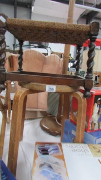 Round stool has no maker's marks, surface scratched and grubby, 1 leg split at bottom, height 45cm.Oak stool has some loose strands, oak will need a wipe over/polish height 30cm.