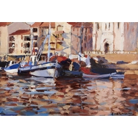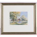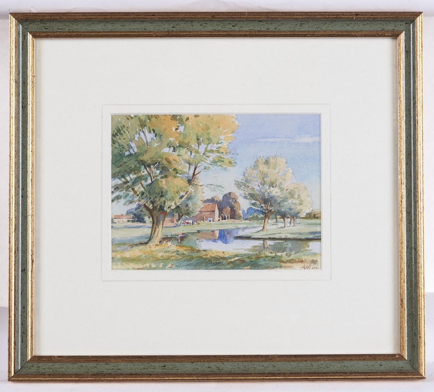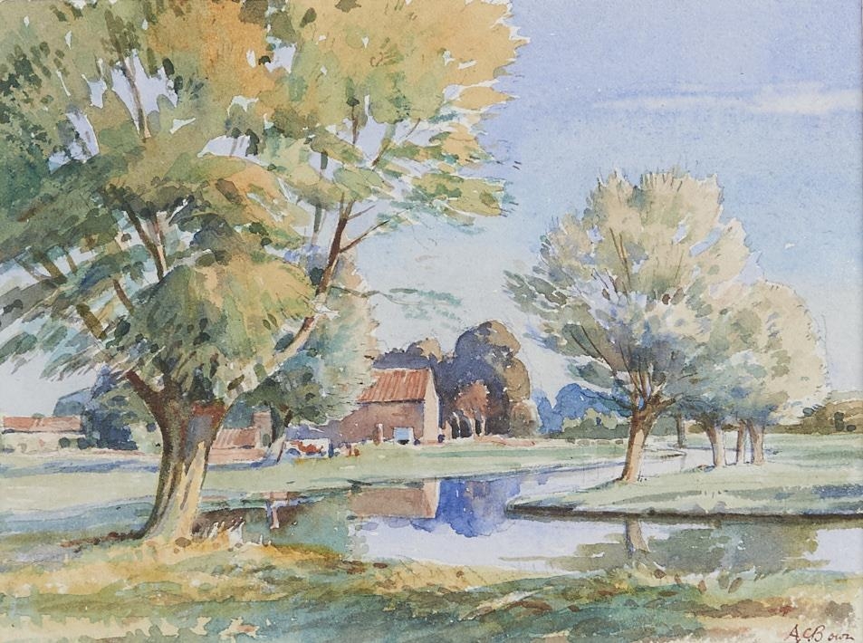 A C Bown - Summer River Landscape with Houses Beyond, watercolour, signed lower right, 11 x 15cm