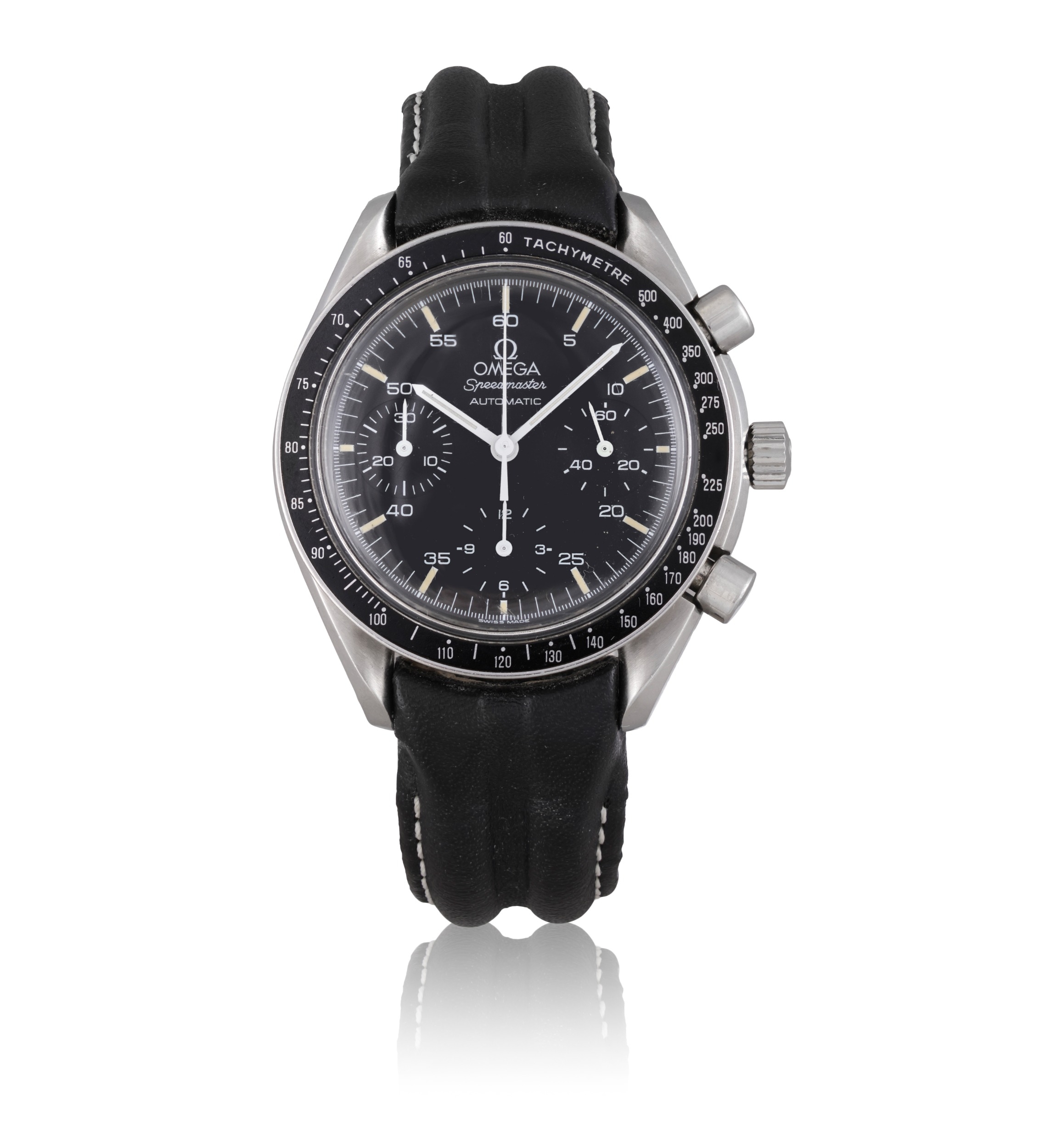 OMEGA SPEEDMASTER REDUCED CHRONOGRAPH, STAINLESS STEEL A sporty and highly recognizable automatic chronograph wristwatch in stainless steel. Year: Circa 1990s Dial: Black dial with three recessed sub-dials, luminous baton hour markers, outer minute/seconds track, central chronograph seconds hand, sword luminous hands, tachymeter bezel, Calibre: Automatic, cal. 1140 (ETA-based 2890-2), signed Omega Case: Stainless steel, snap caseback, reference 175.0032, No. 53536651 Dimensions: 38 mm diameter Gross Weight: 60.82 g approx. Bracelet/Strap: Omega black leather strap with Omega stainless steel pin buckle Signature: Dial and movement signed
