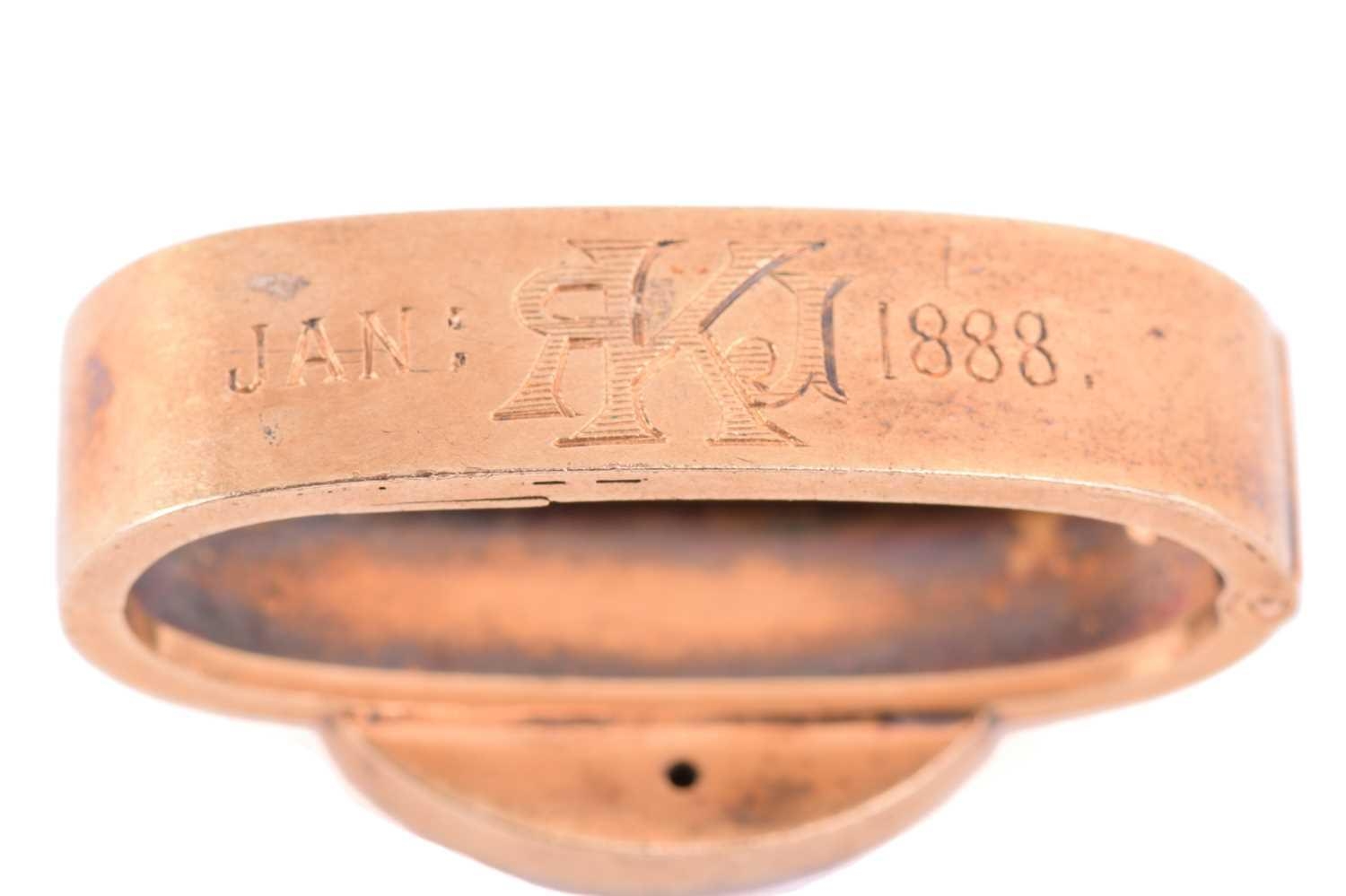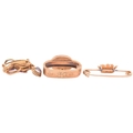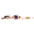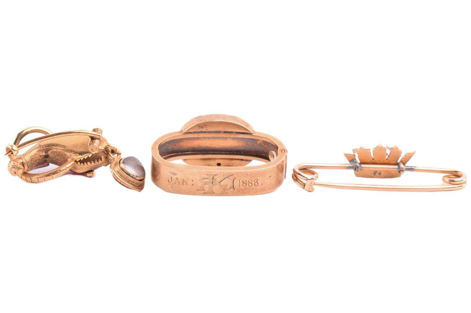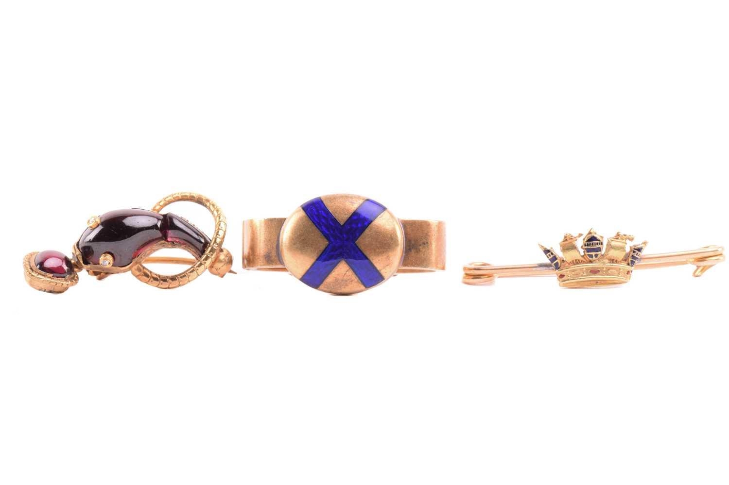 A garnet-set serpent brooch, scarf clip and a tie pin; the serpent brooch with heart-shaped locket, glazed compartment with hairwork to verso, converted from a clasp, set with garnets and diamond chips, with later-fitted pin and C-catch, yellow metal testing 14ct, 3.5 cm drop; a scarf clip with an enamelled St.Andrew's cross, monogrammed to the back and engraved with date Jan 1888, yellow metal testing 18ct; together with a enamelled Royal Navy crown tie pin in 15ct yellow gold; Total weight of items 16.6 grams (3).