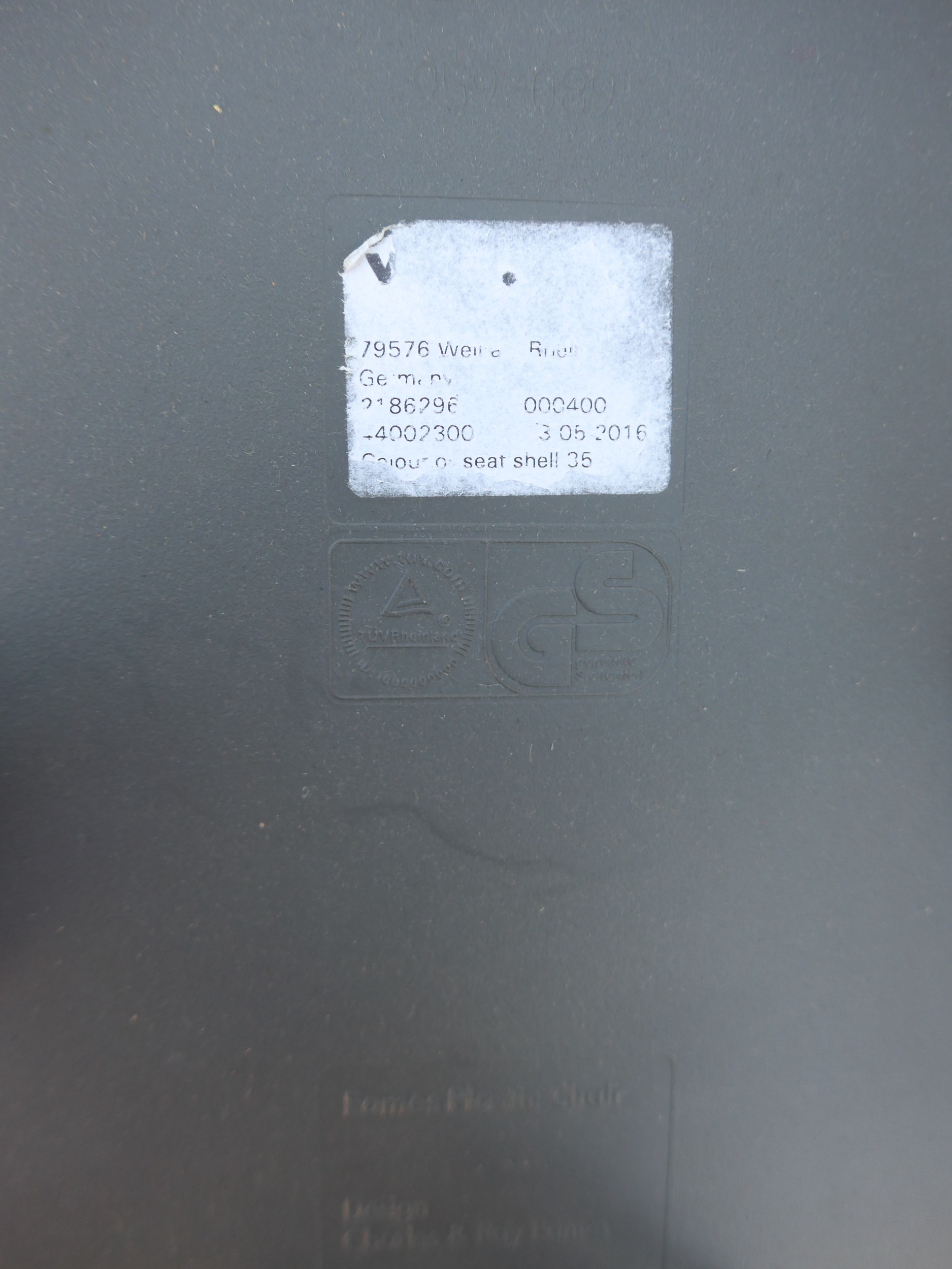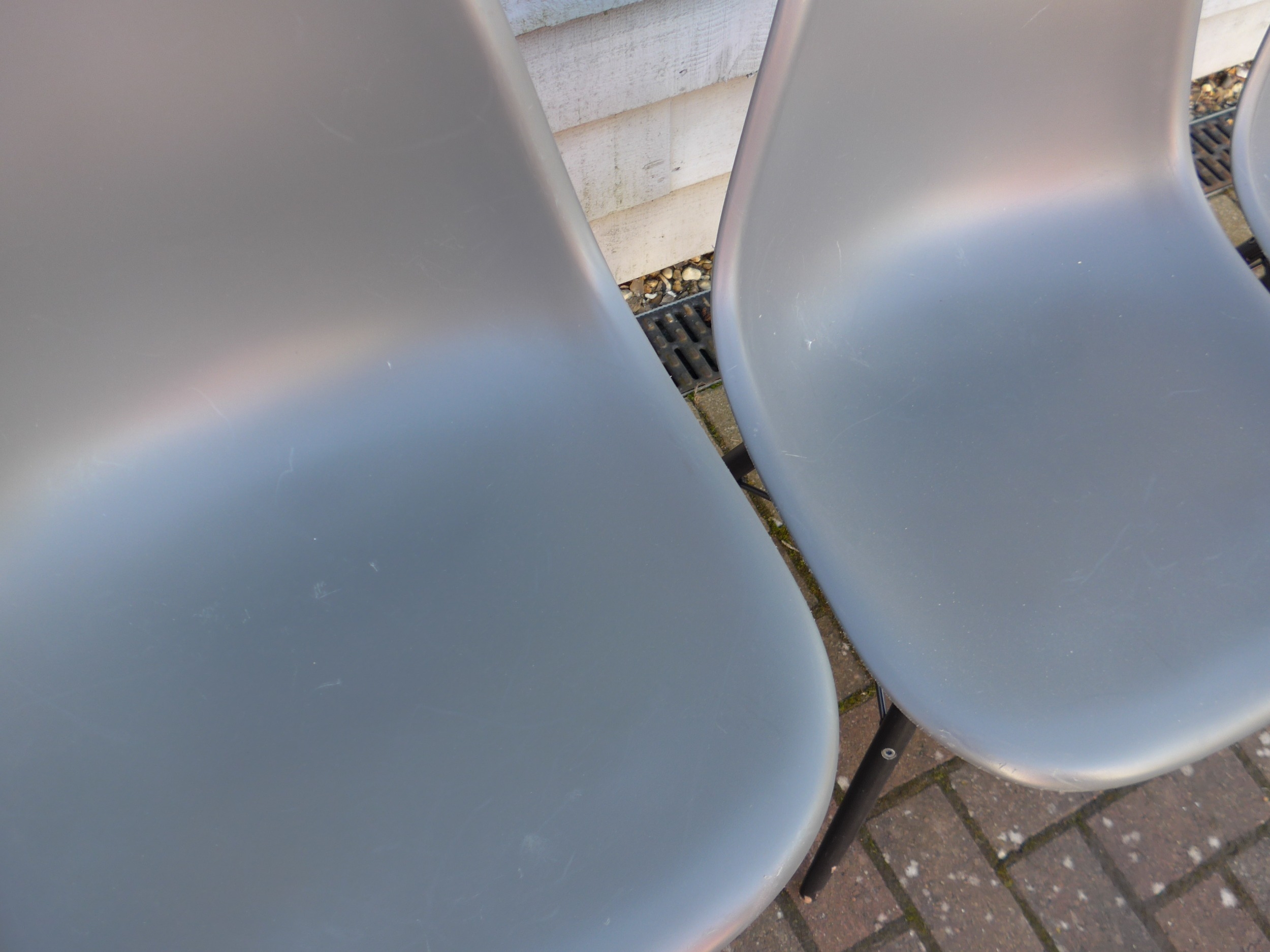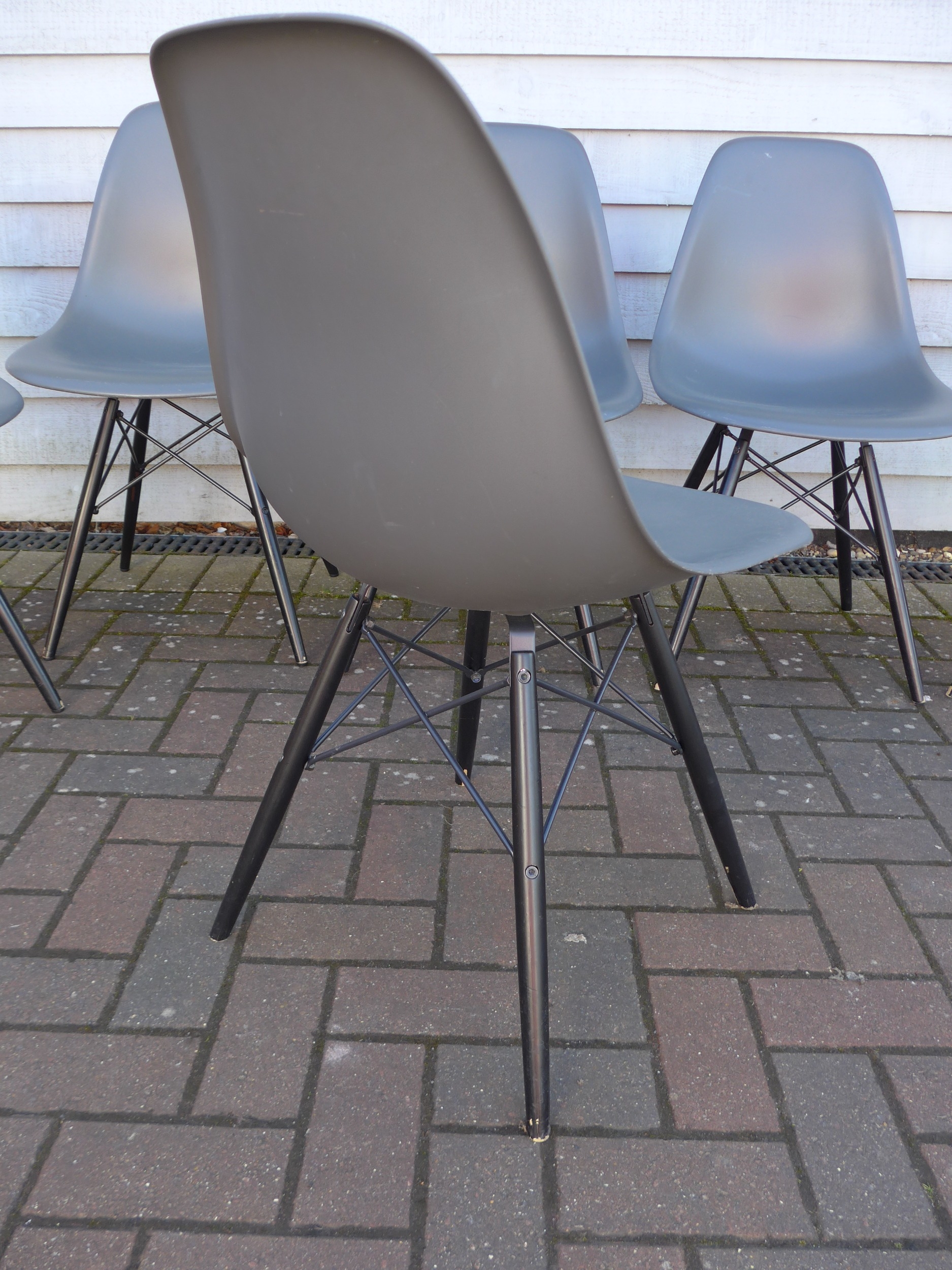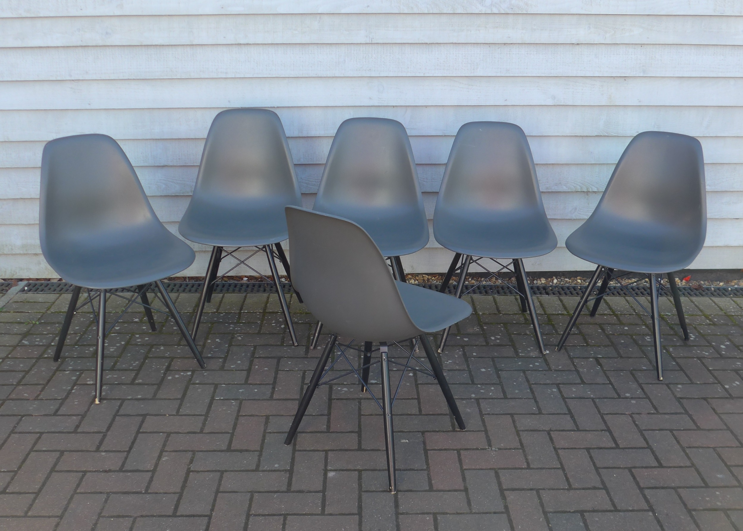 A set of six Vitra DSW chairs designed by Charles Eames in dark grey with black painted wooden bases. Marked underneath.