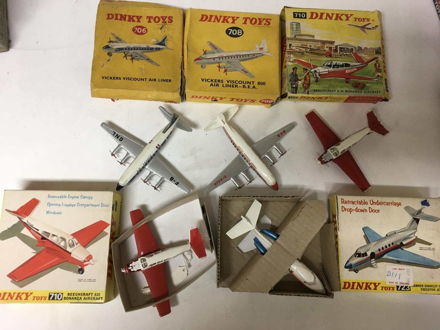 Dinky toys, a collection of boxed Diecast aircraft including #706 Vickers Viscount, #708 Vickers Viscount 800, #710 Beechcraft S35 Bonanza x2 and #723 Hawker Siddley executive jet, boxed