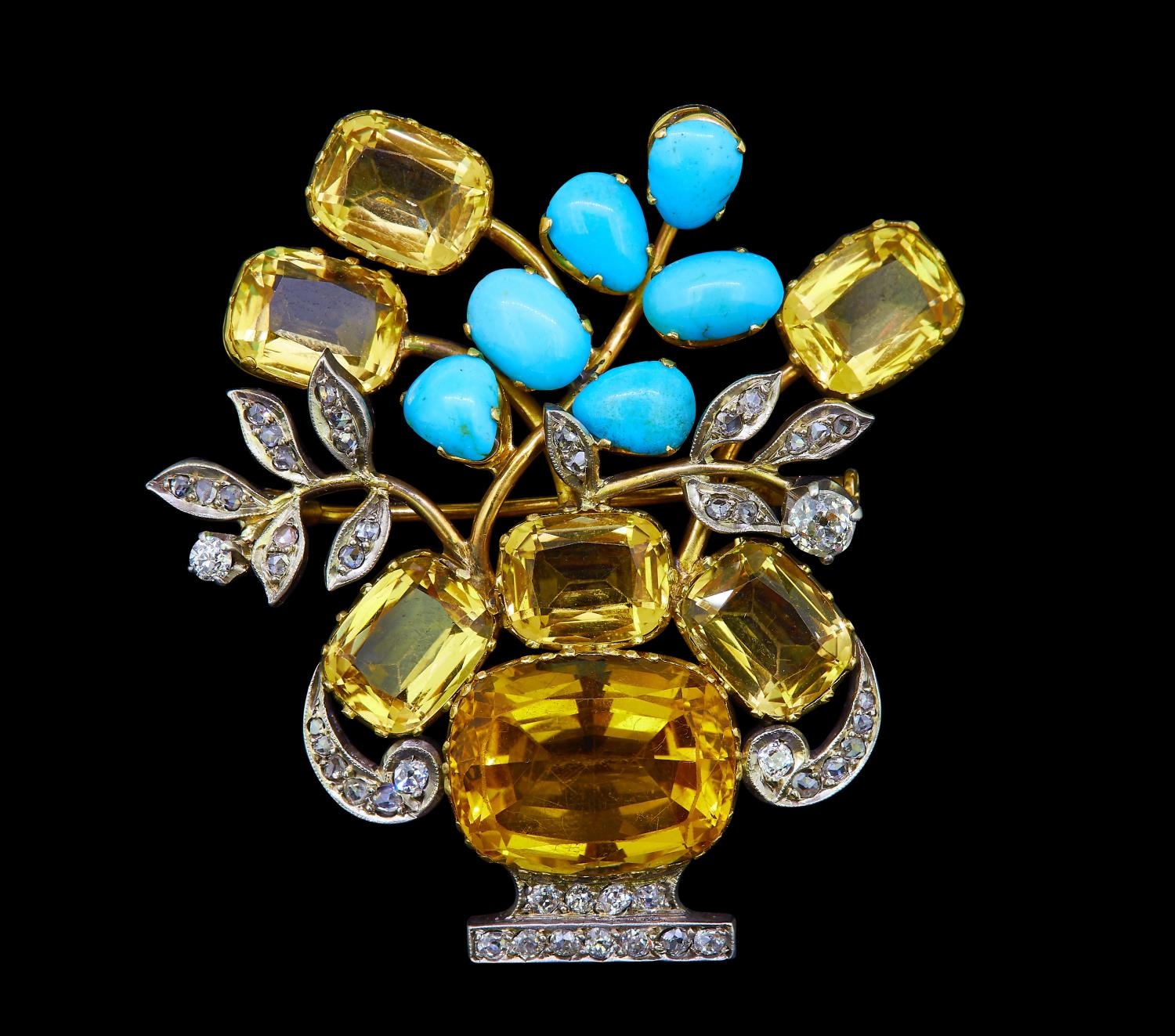CITRINE, DIAMOND AND TURQUOISE FLORAL BROOCH, designed as a vase with flowers. The vase set with a larger central citrine, flanked with 3 other citrines. The flowers set with turqiose citrines and diamonds. Diamonds totalling approx. 0.95 ct. L. 5.6 cm. 25.4 grams.