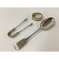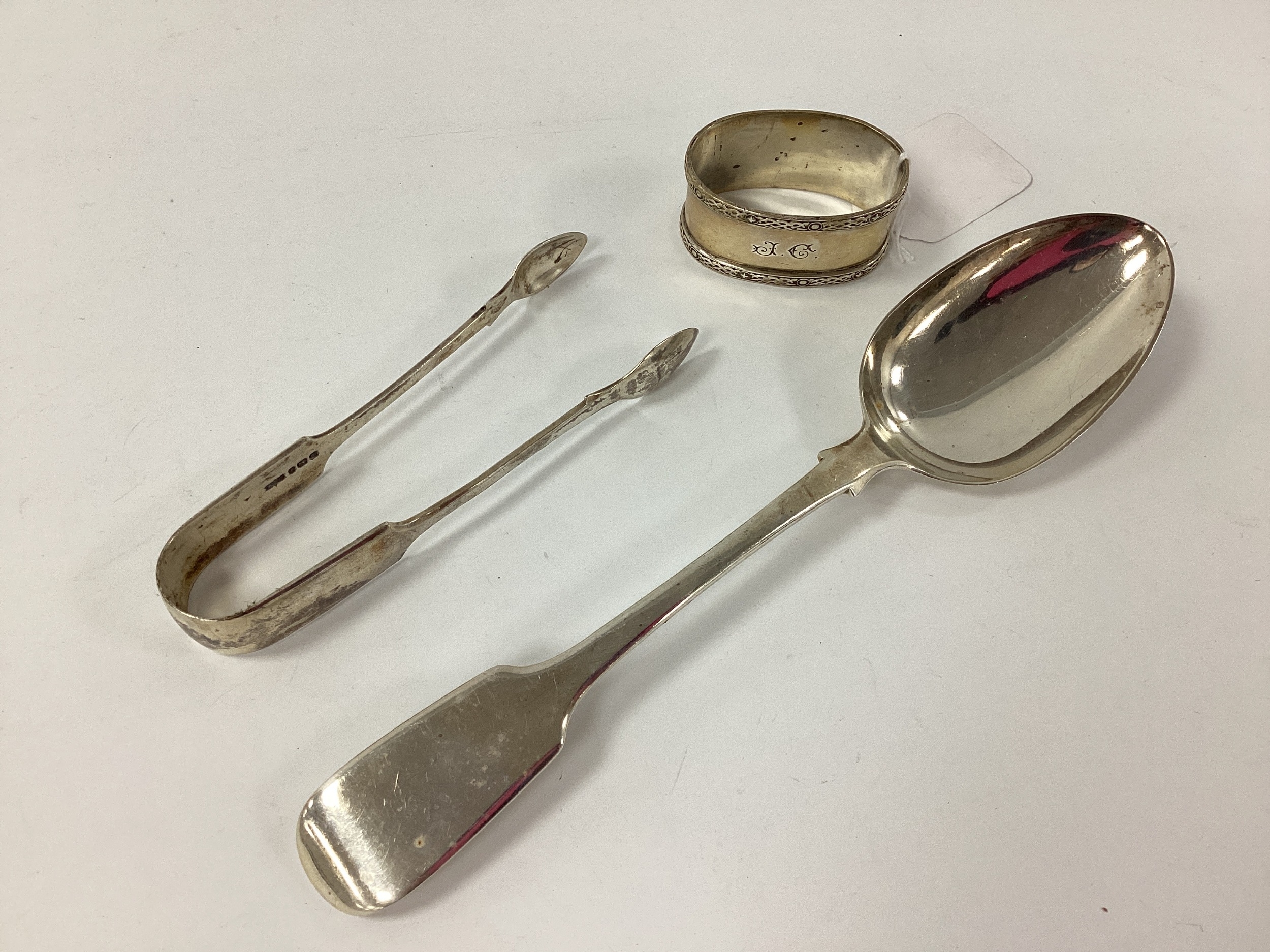 A Victorian Hallmarked Silver Fiddle Pattern Table Spoon, London 1838, a pair of hallmarked silver Fiddle pattern sugar tongs, initialled; a hallmarked silver napkin ring. (3)