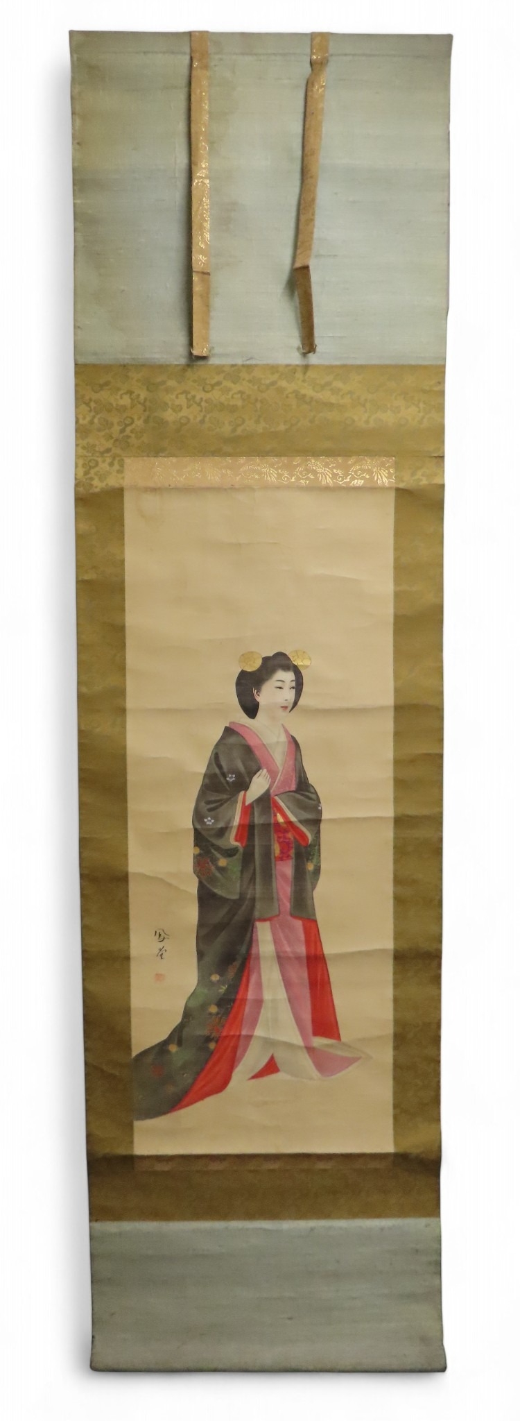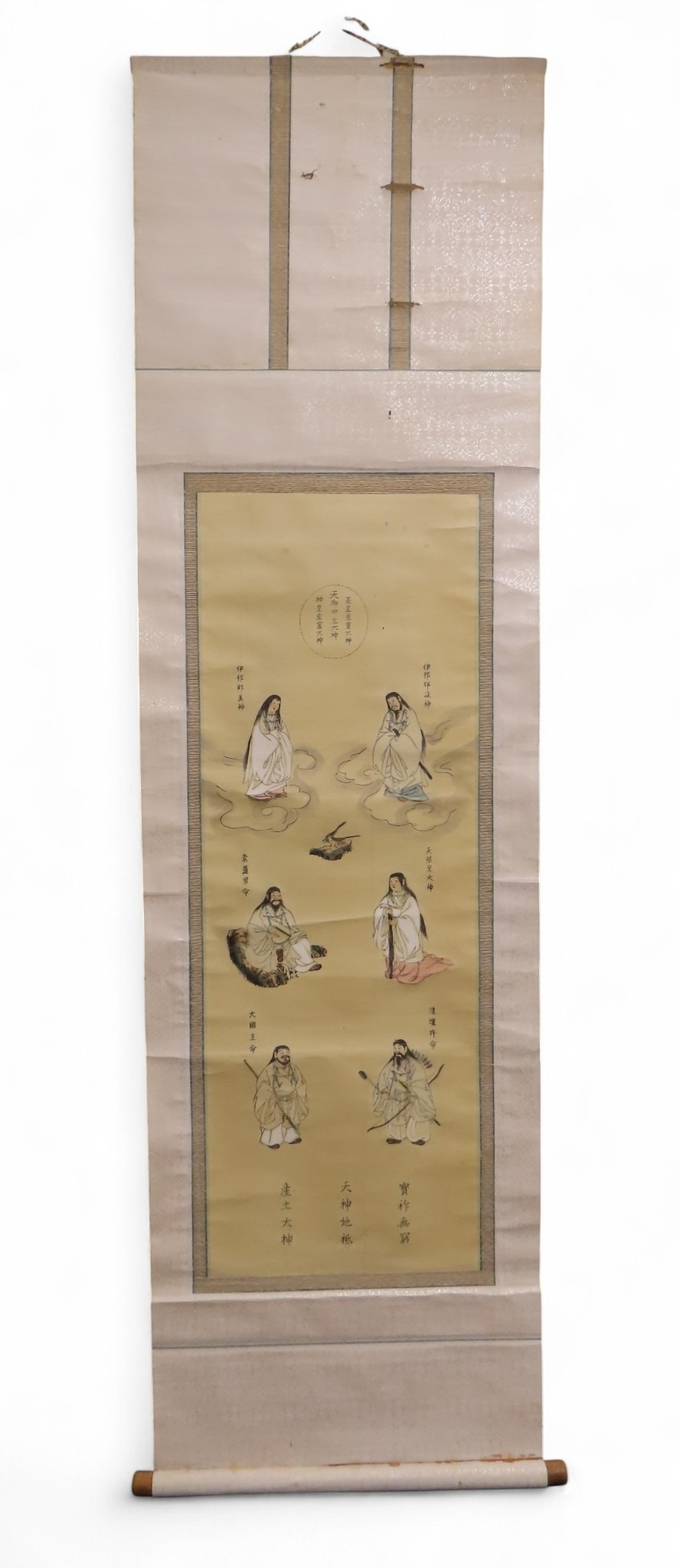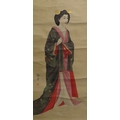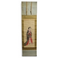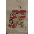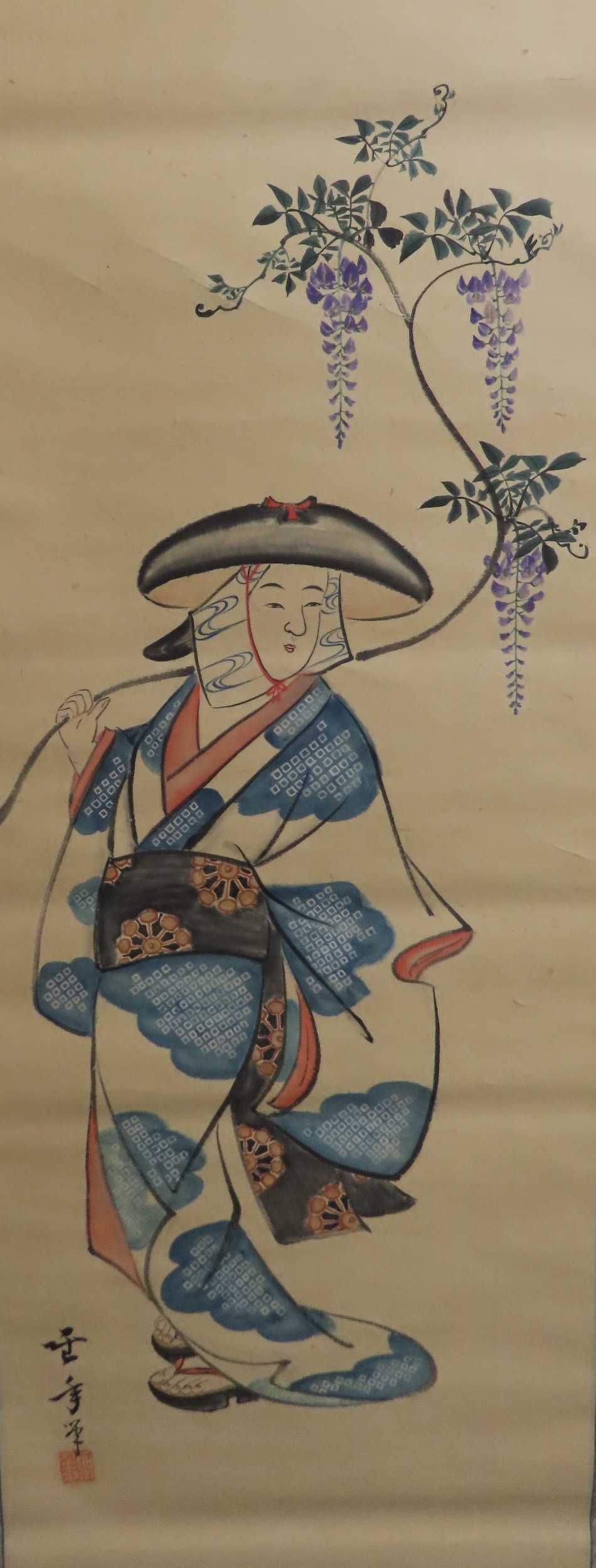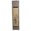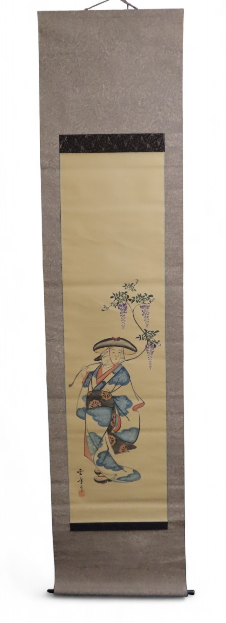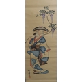 including a painted fan leaf, 146 x 62cm, another of a figure carrying a vine of wisteria, 175 x 42cm, a scroll depicting a bijin, 158 x 44cm, another depicting six figures, 152 x 44cm, another woodblock print scroll depicting peacocks, and another scroll (6)