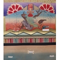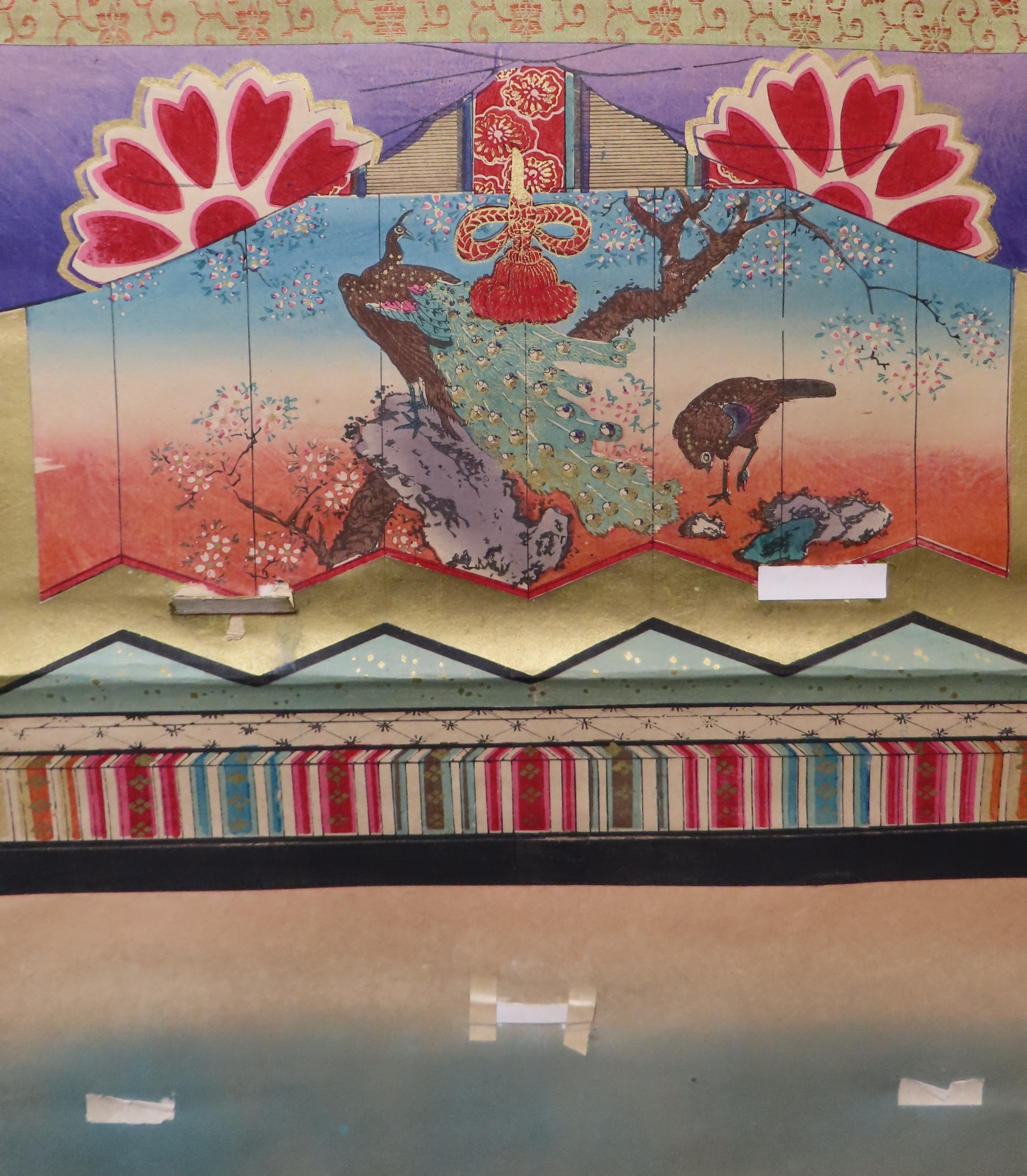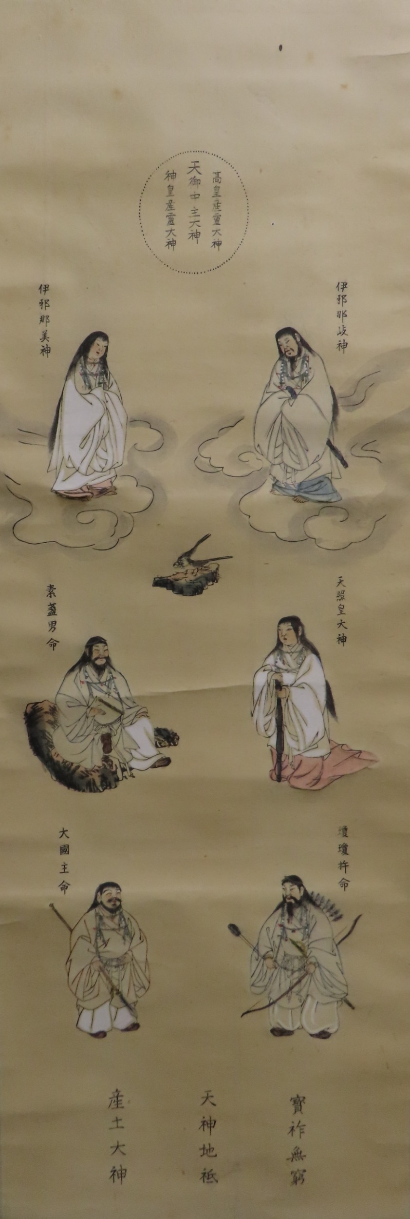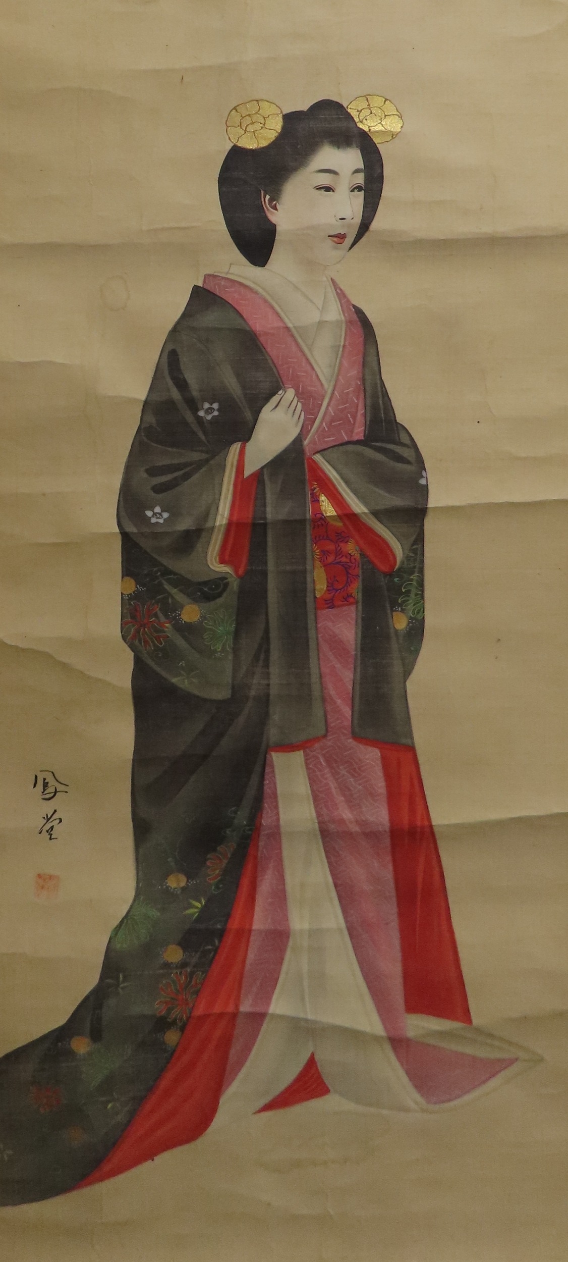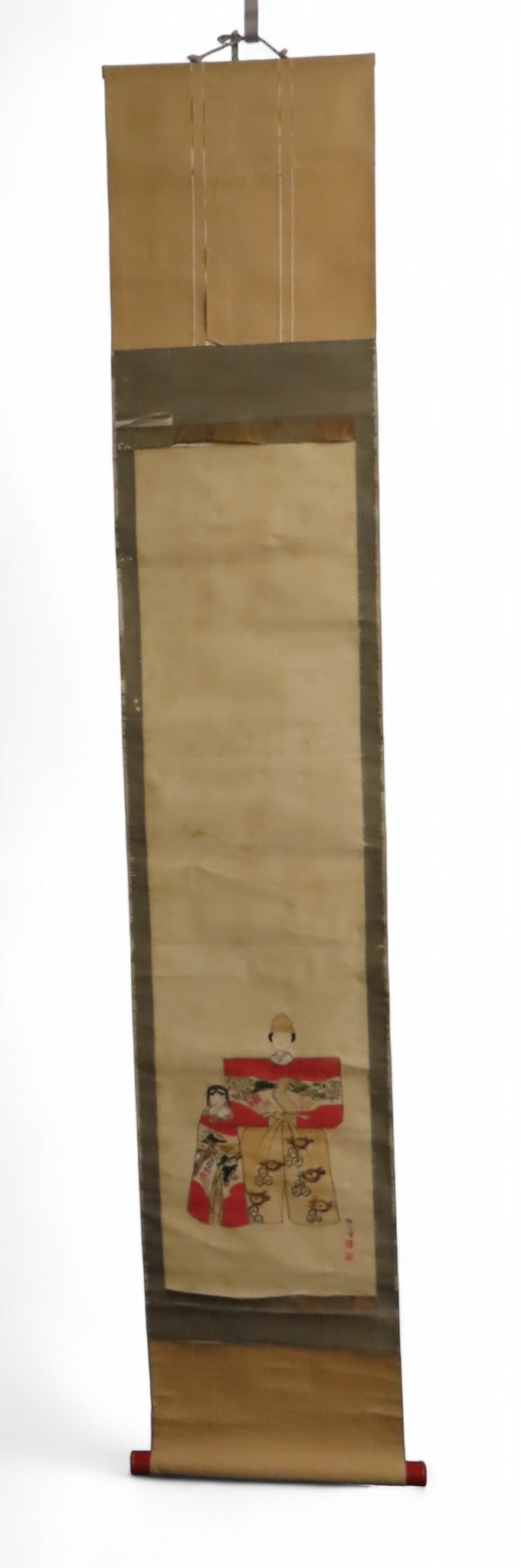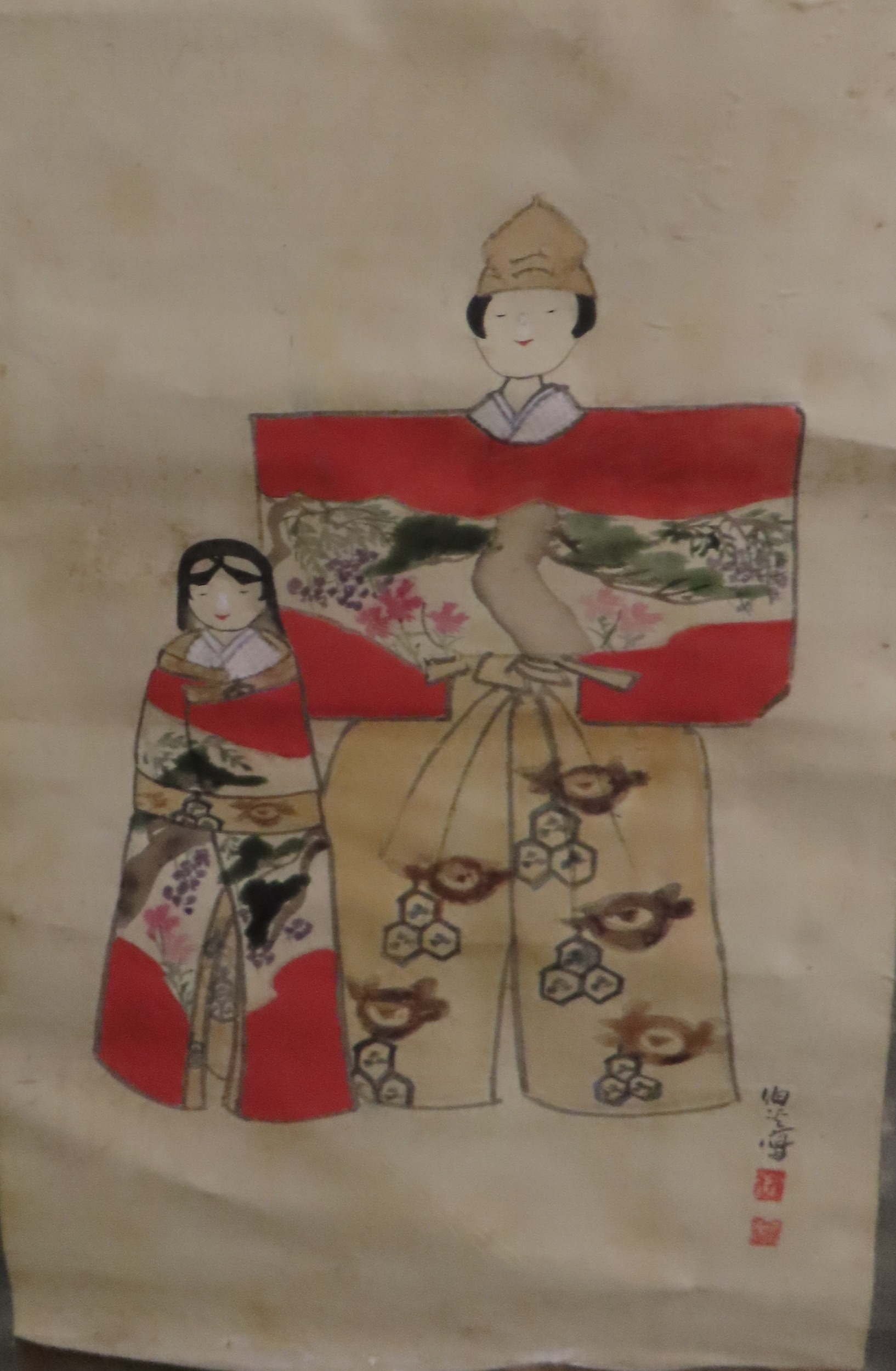 including a painted fan leaf, 146 x 62cm, another of a figure carrying a vine of wisteria, 175 x 42cm, a scroll depicting a bijin, 158 x 44cm, another depicting six figures, 152 x 44cm, another woodblock print scroll depicting peacocks, and another scroll (6)