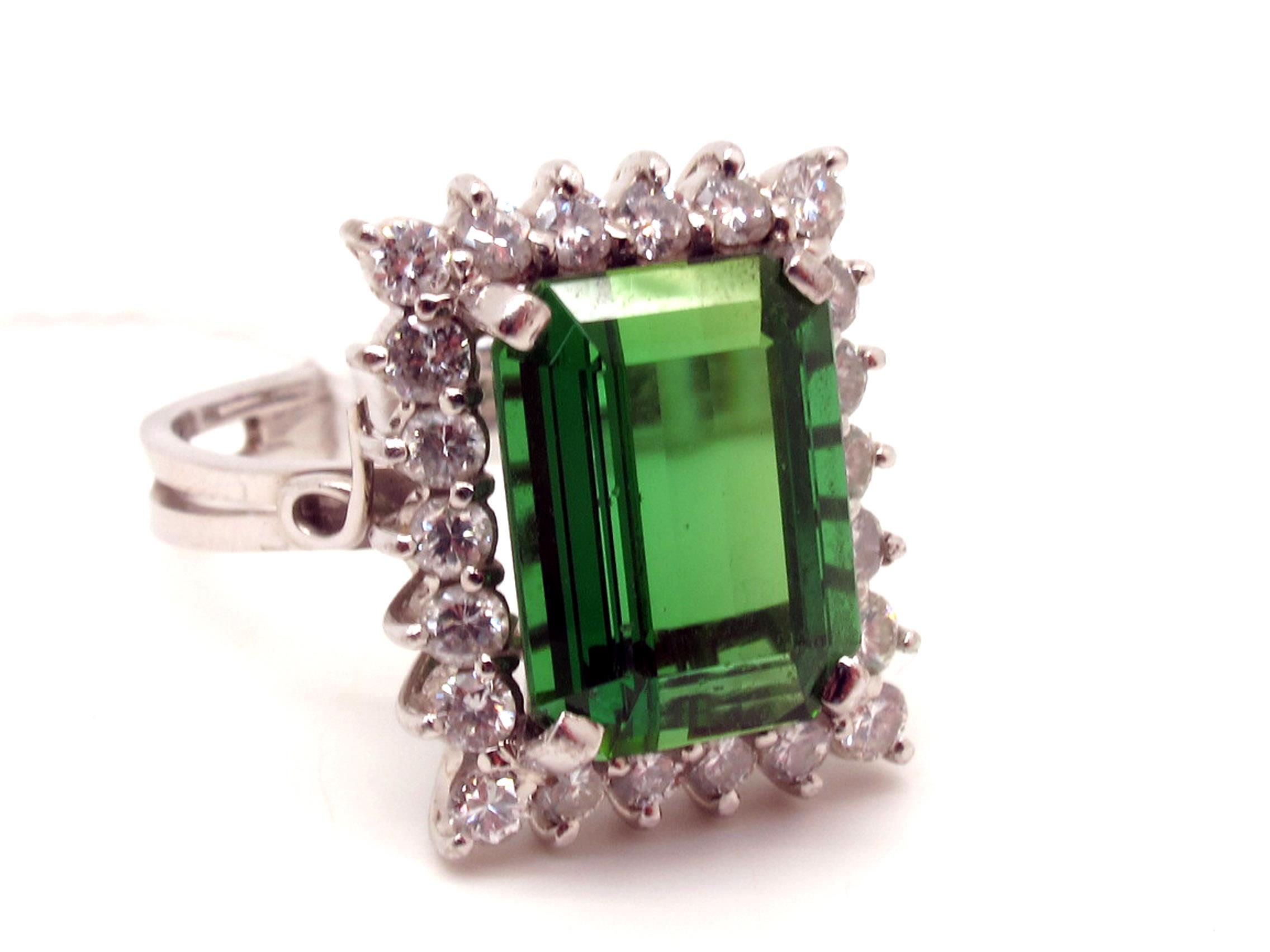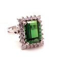 A Large Tourmaline and Diamond Set Rectangular Cluster Ring, four claw set to the centre within claw set border of uniform brilliant cut diamonds, between scroll detail shoulders and pierced shank, indistinctly stamped "750" (finger size O). *Griffin Jewellers (Bridlington) Insurance Valuation states emerald cut tourmaline approximately 6.64ct (12.7 x 9.5 x 6.5mm), total diamond weight approximately 0.88ct, second hand replacement value £6,200.