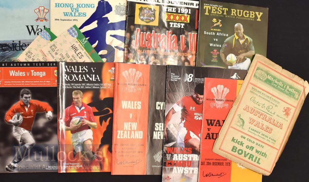 Wales v the World Rugby Programme Selection (12): Really wide group: homes v Australia 1947 (v worn), 1975 & 2008; New Zealand 1978 (Divers); Romania & Tonga (plus two tkts) 2001; & Presidents RFU XV 1970 (New Ground); with aways at Australia (Brisbane) 1991 and South Africa (2nd Test) 2002, plus scarce, large, with slightly faded cover, Hong Kong 1975. Splendid lot. Good or better except 1947