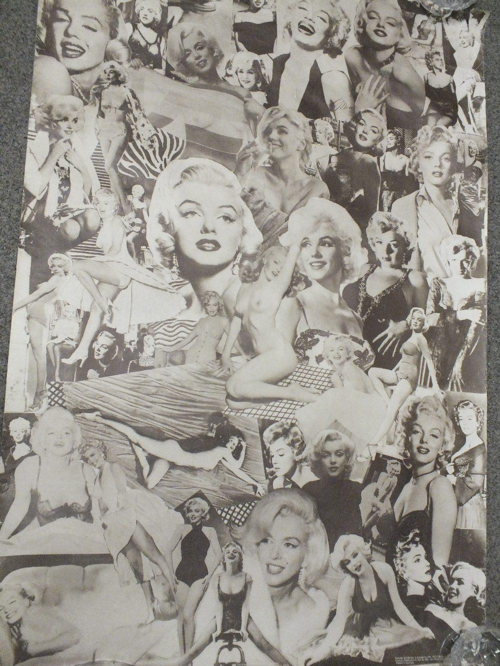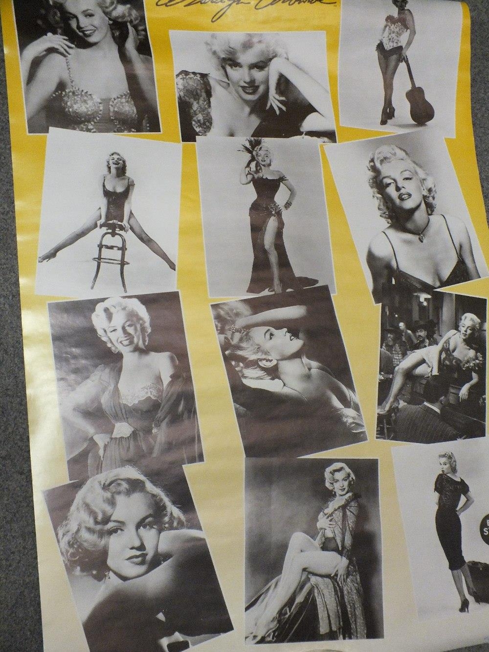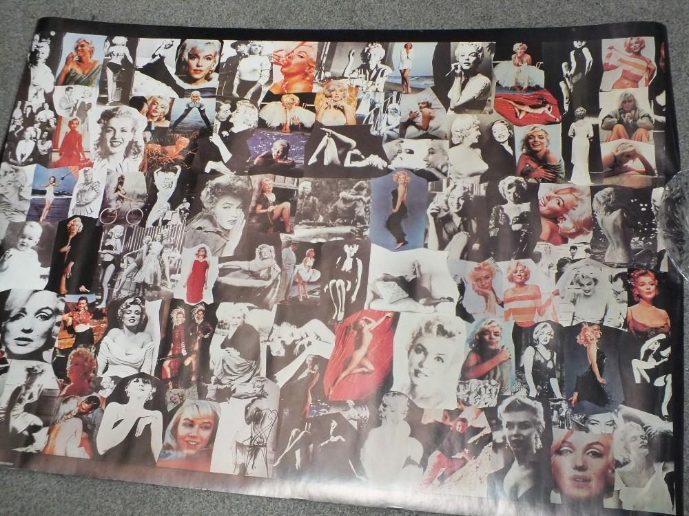 A LARGE TOO HOT TO HANDLE MARILYN MONROE ROLLER BLIND W- 90CM TOGETHER WITH THREE MARILYN MONROE RELATED COLLAGE POSTERS ETC.