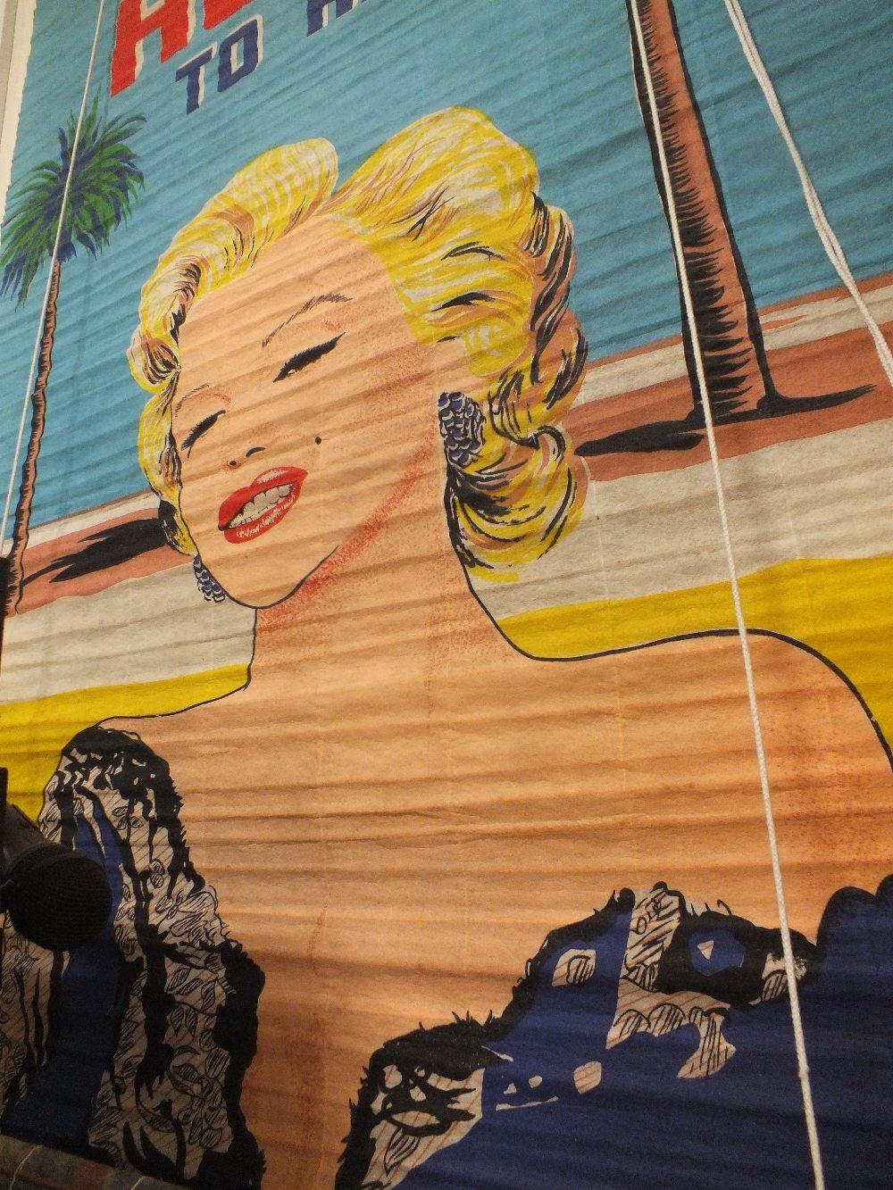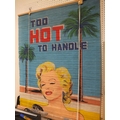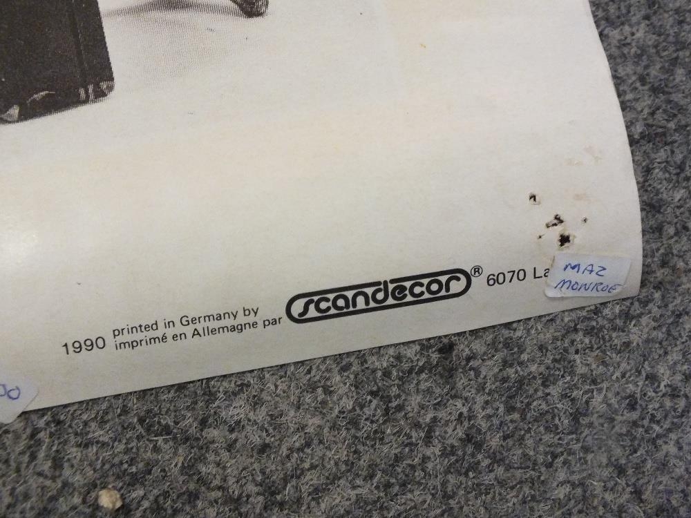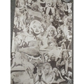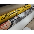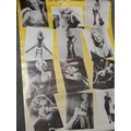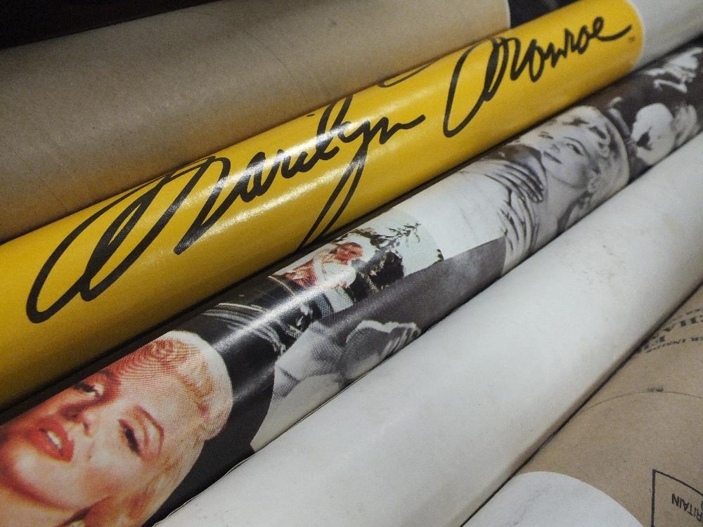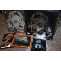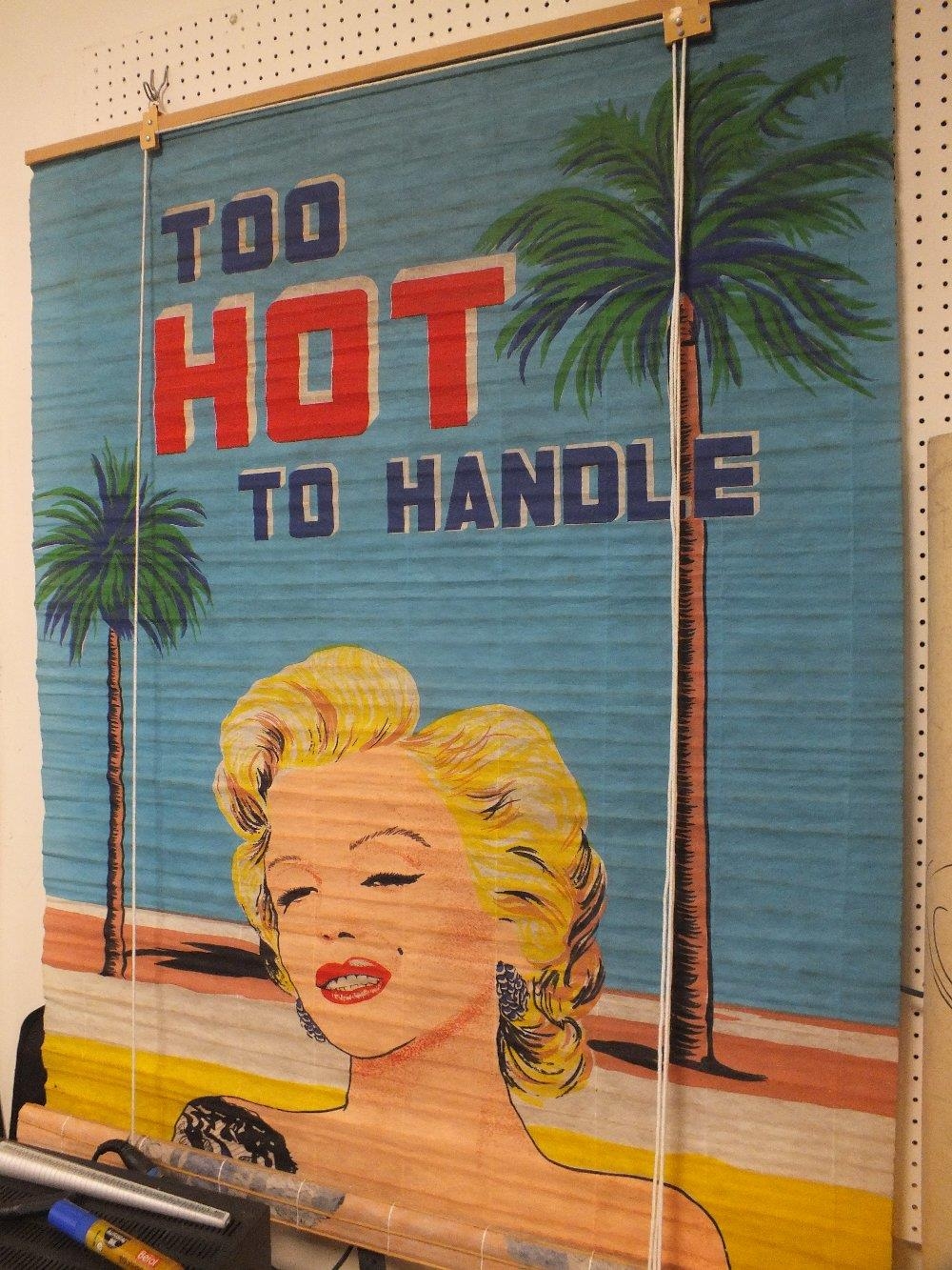 A LARGE TOO HOT TO HANDLE MARILYN MONROE ROLLER BLIND W- 90CM TOGETHER WITH THREE MARILYN MONROE RELATED COLLAGE POSTERS ETC.