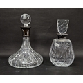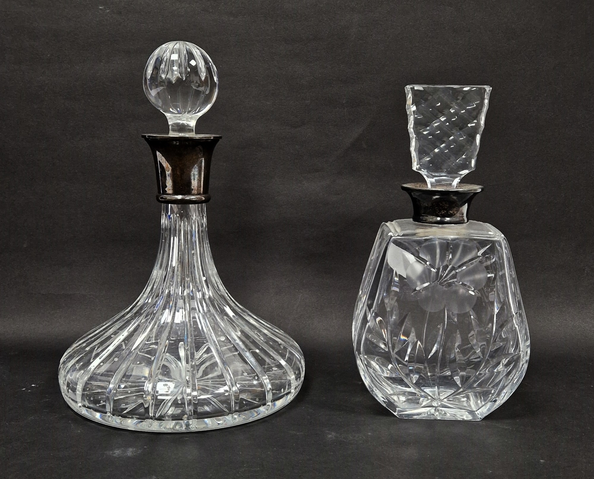 Cut glass ships decanter with silver coller, 28cm high, together with another cut glass, silver collared decanter, 25cm high (2)