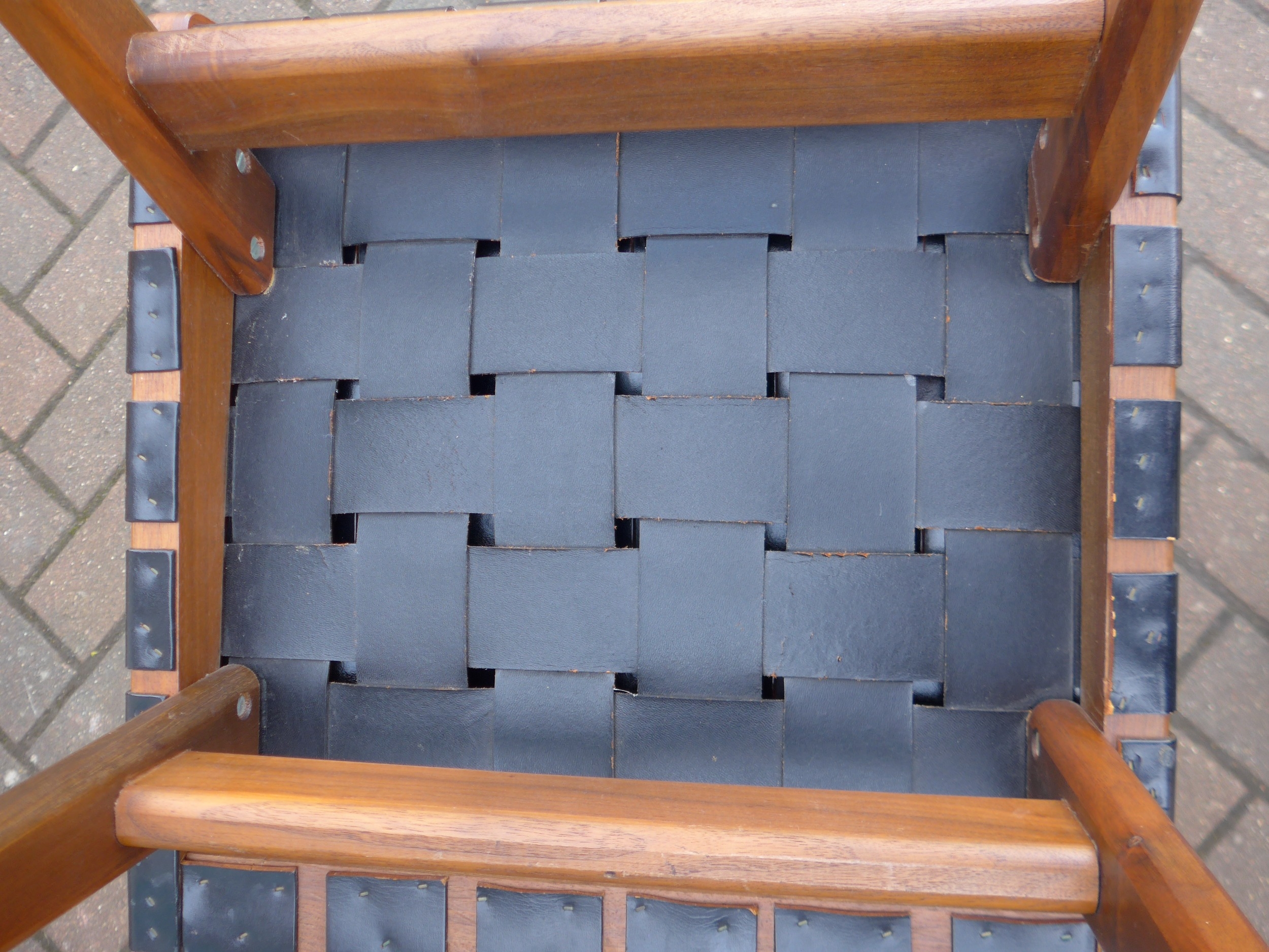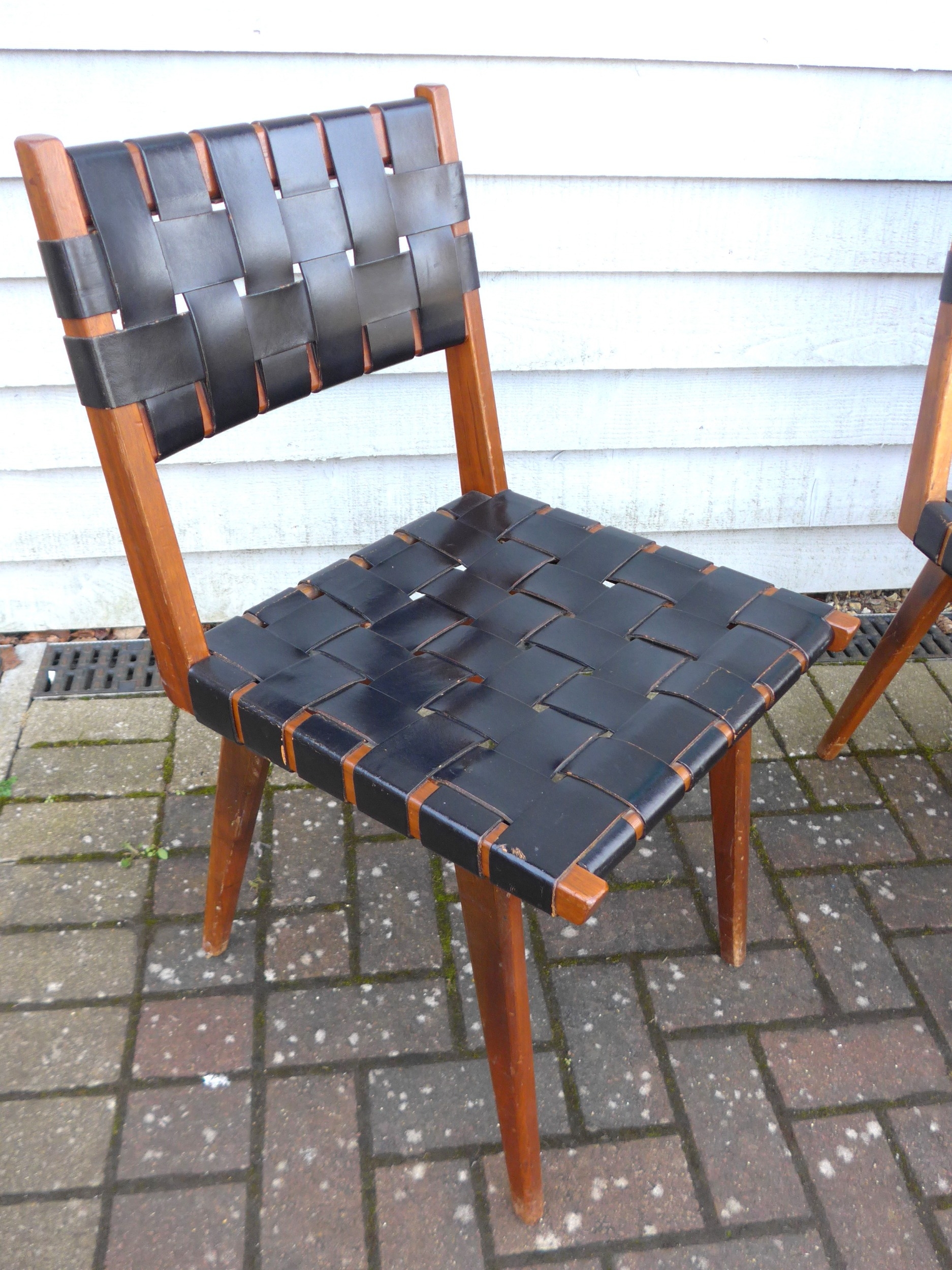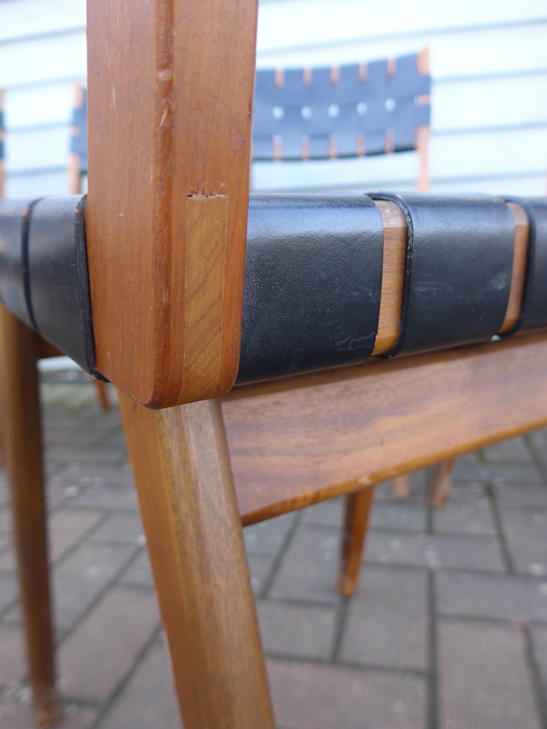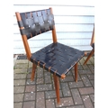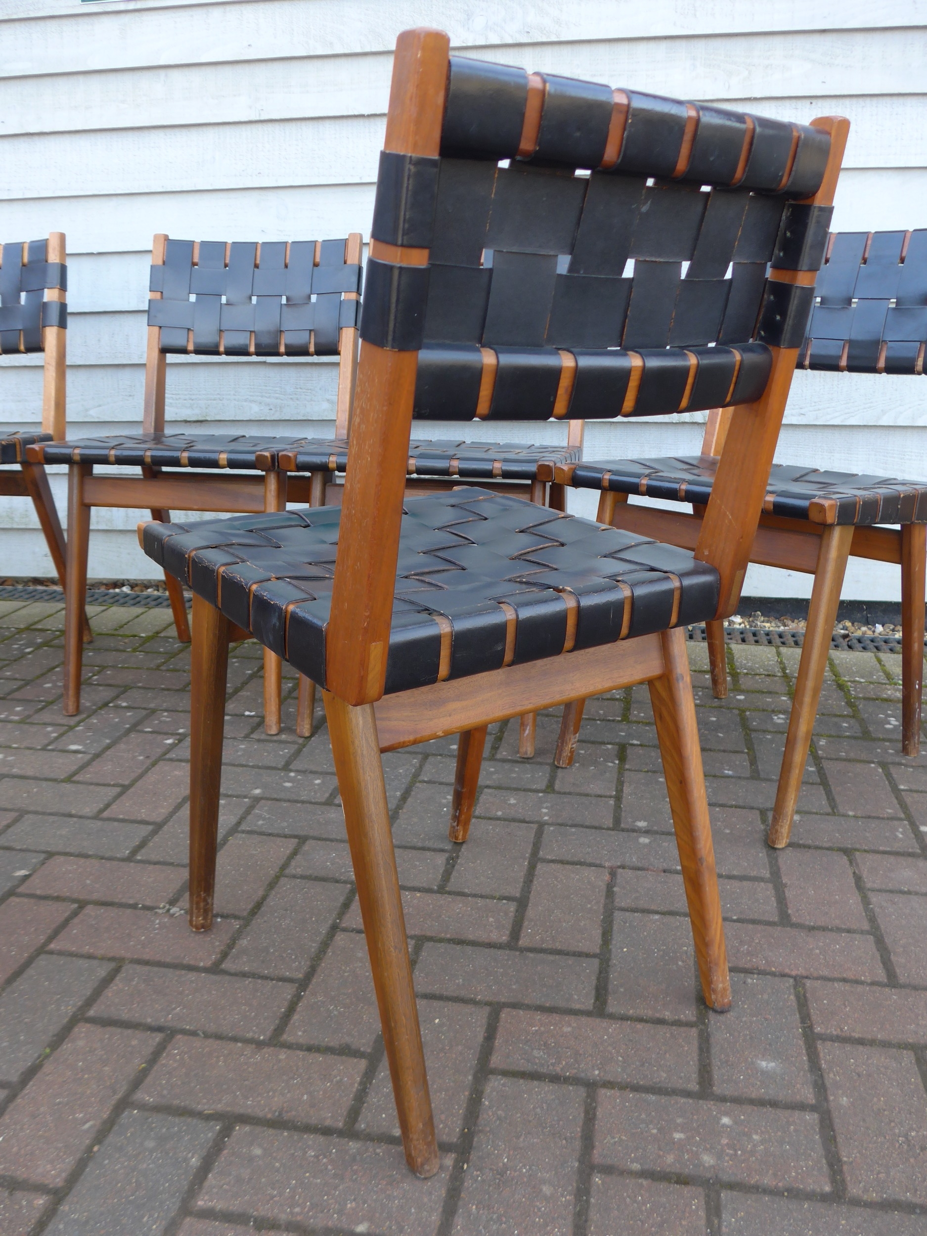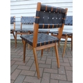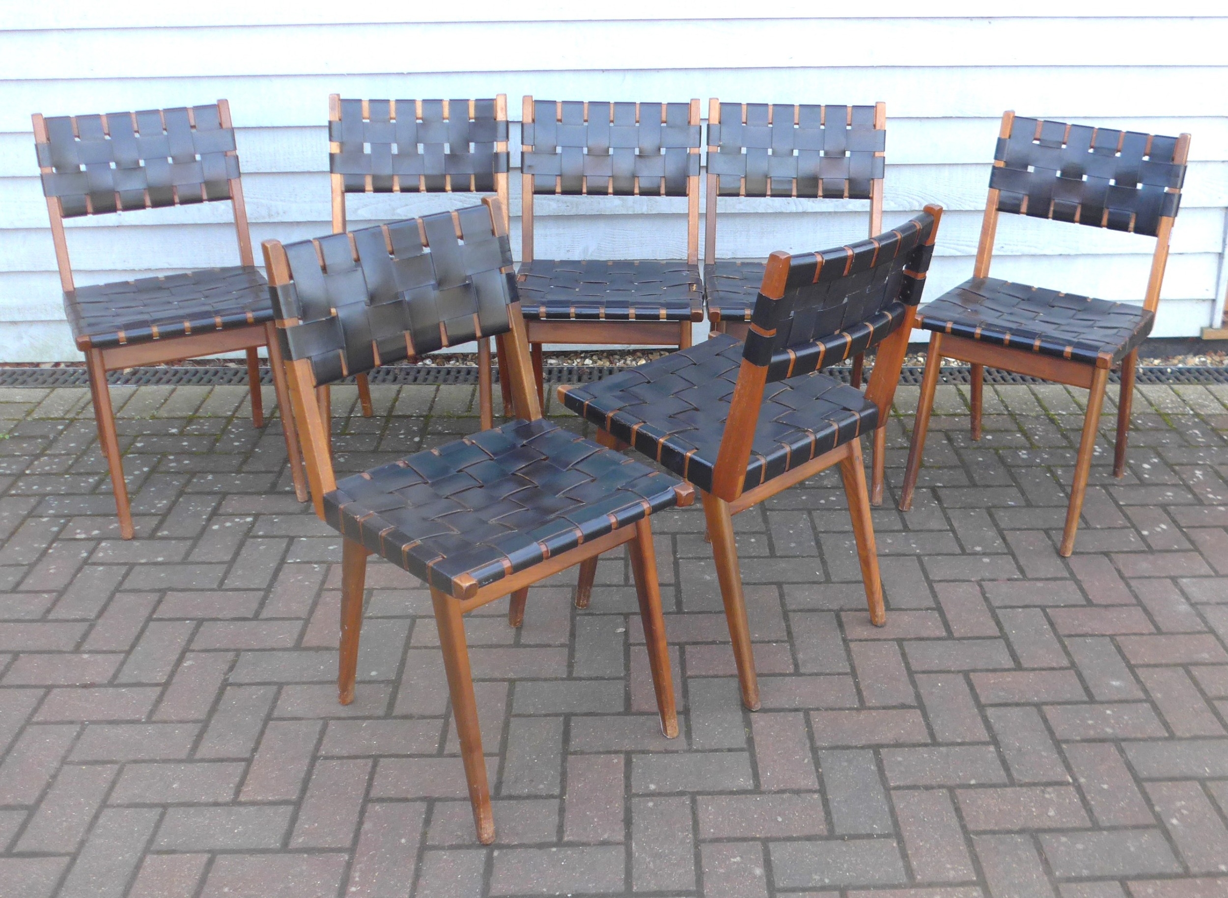 A set of seven chairs in the style of Jens Risom, stained hardwood frames with black leather woven strap seats and backs