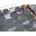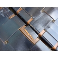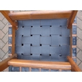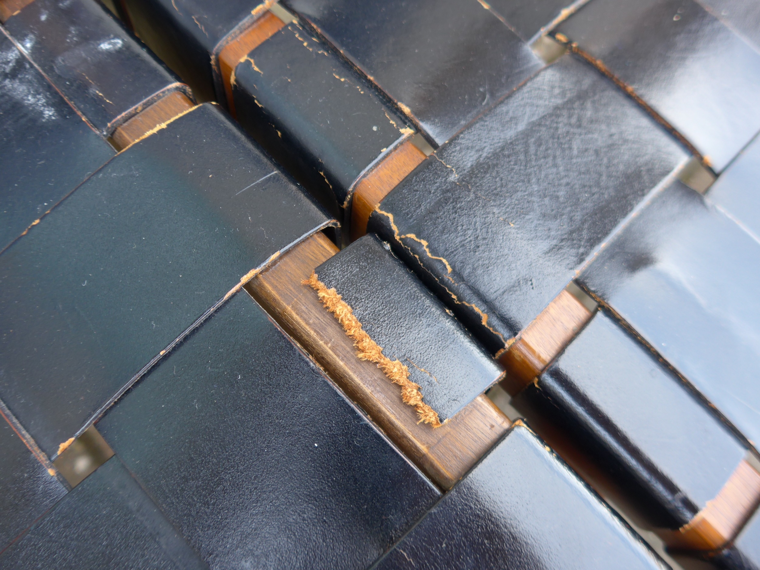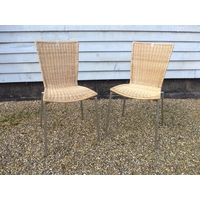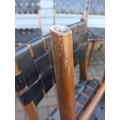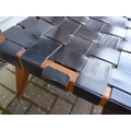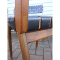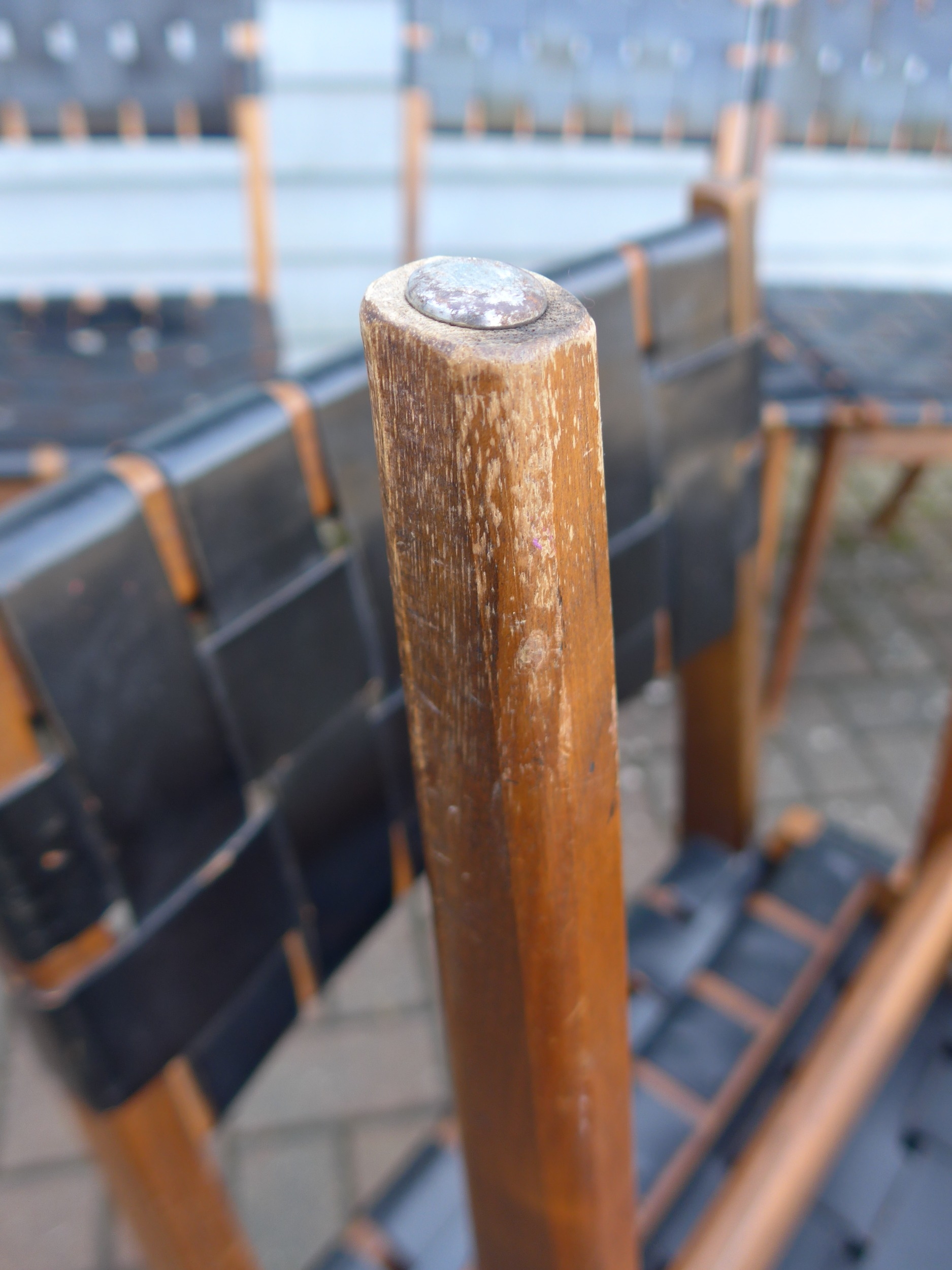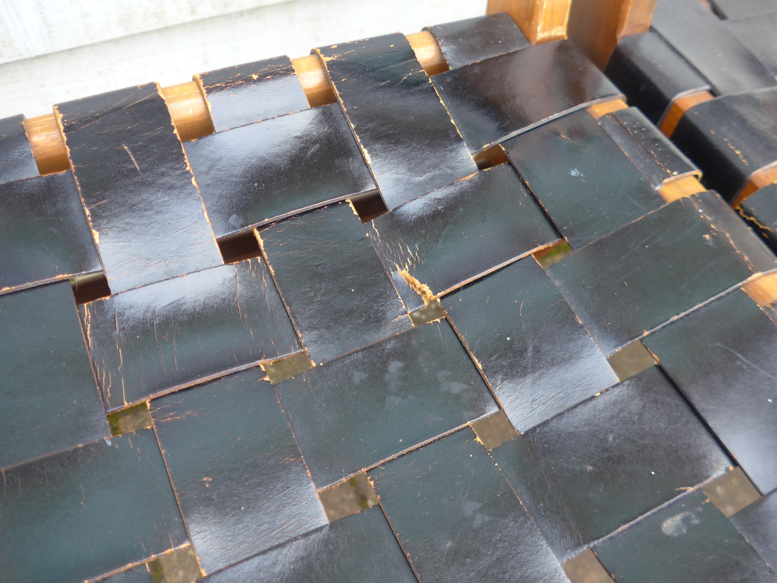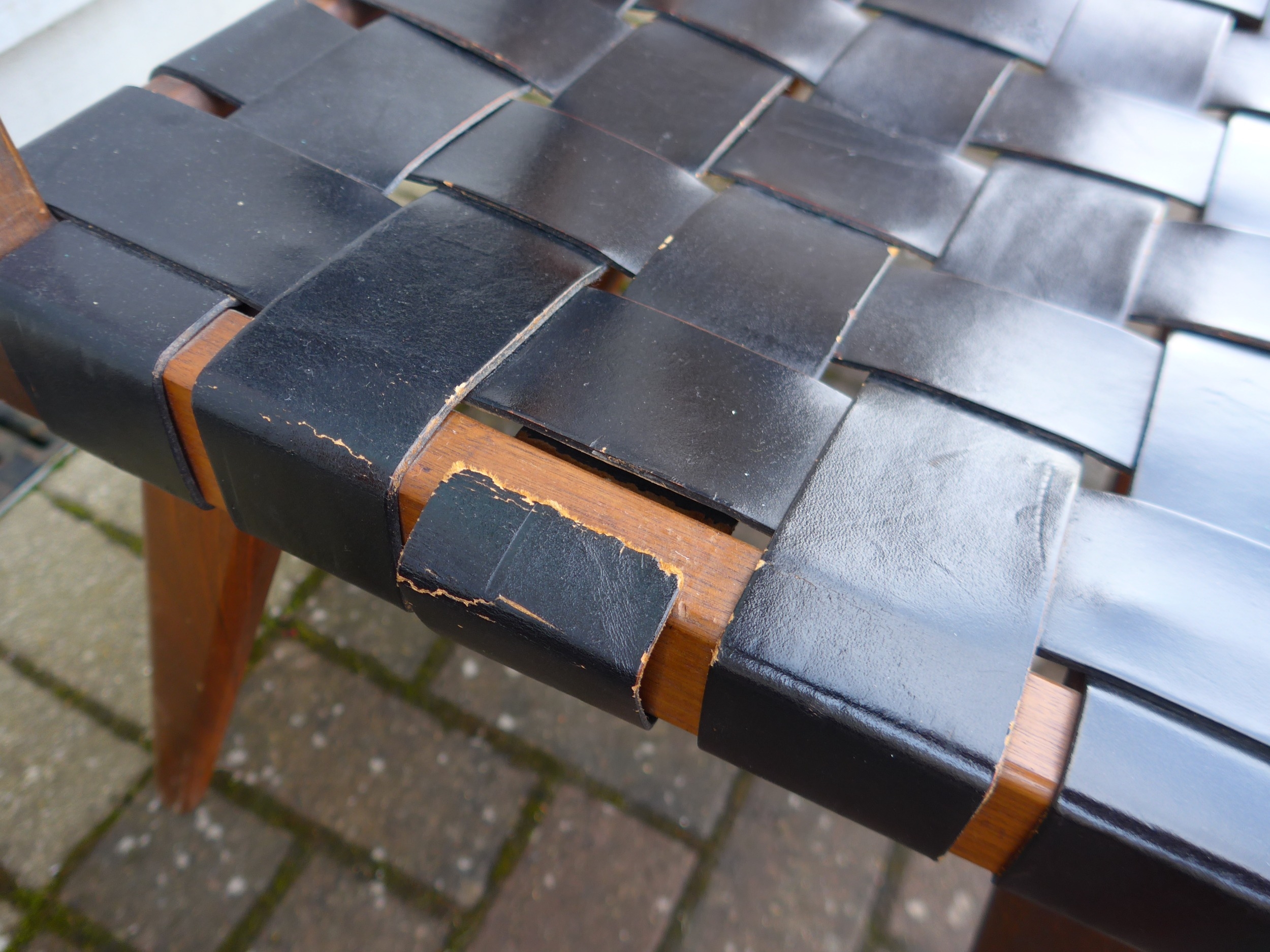 A set of seven chairs in the style of Jens Risom, stained hardwood frames with black leather woven strap seats and backs