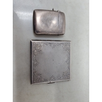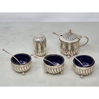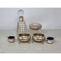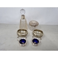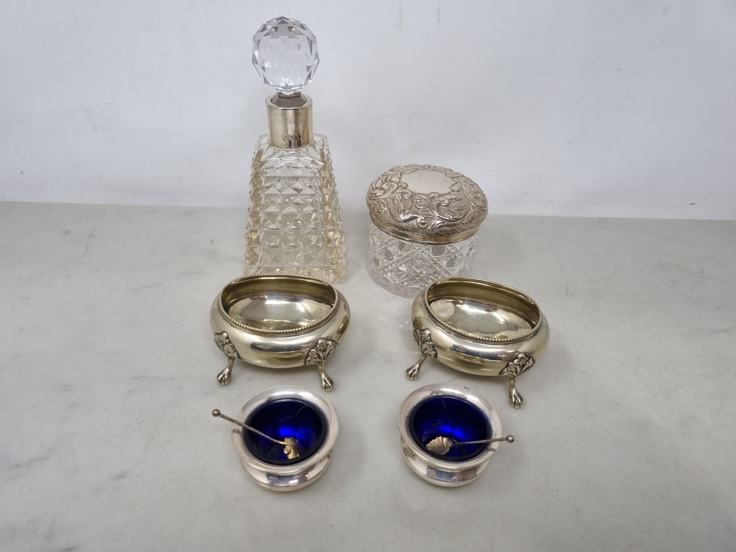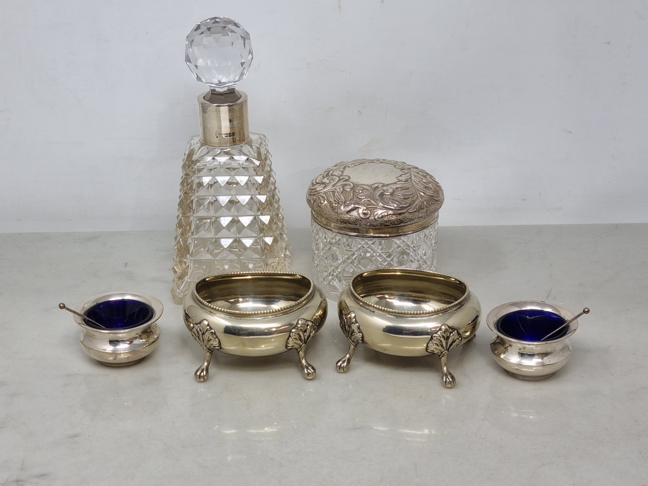 A pair of George V silver circular Salts with blue glass liners and spoons, Birmingham 1920, silver lidded glass Jar embossed birds, Chester 1897, silver mounted glass Flask and a pair of plated oval cauldron Salts
