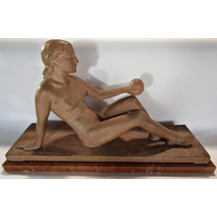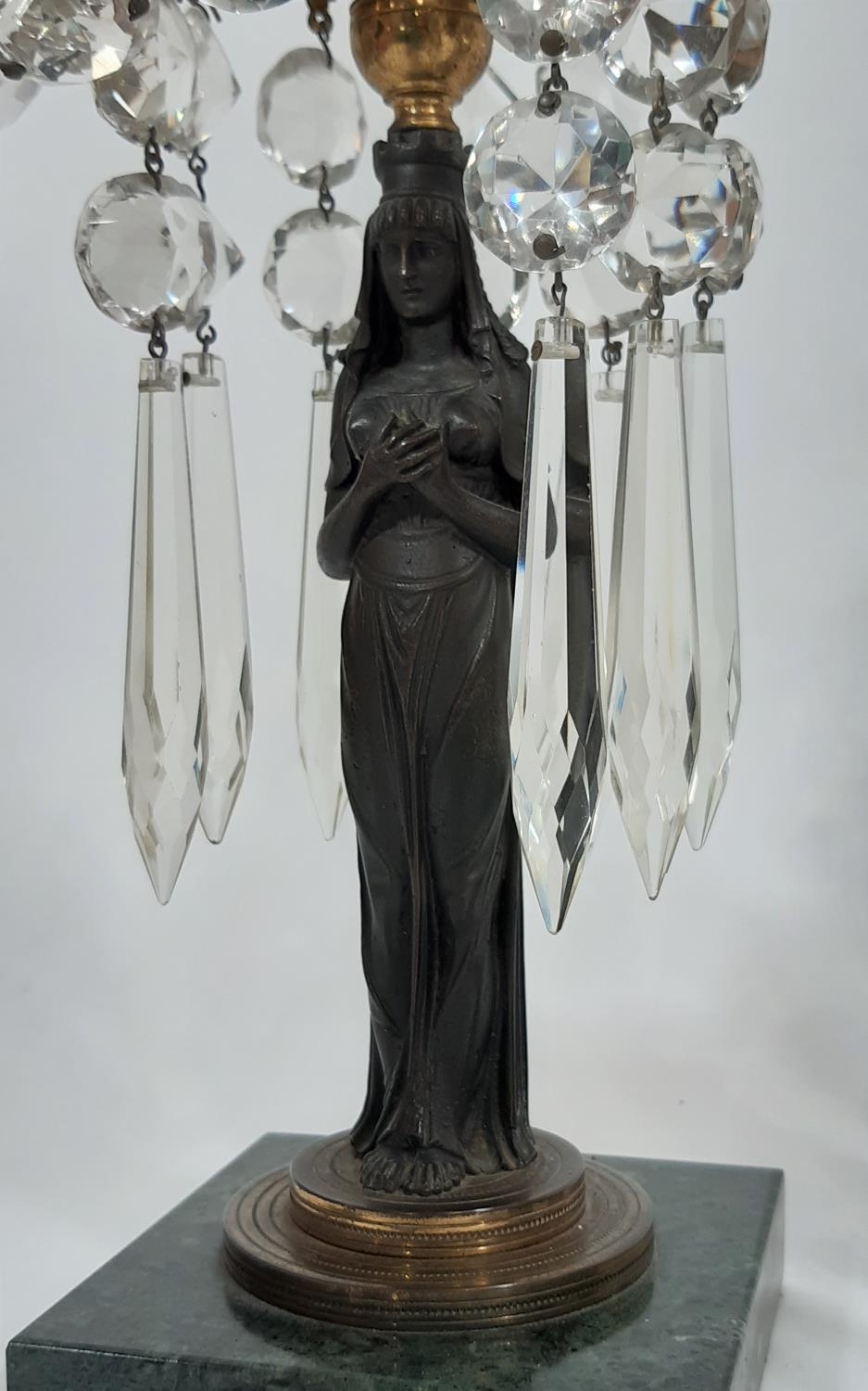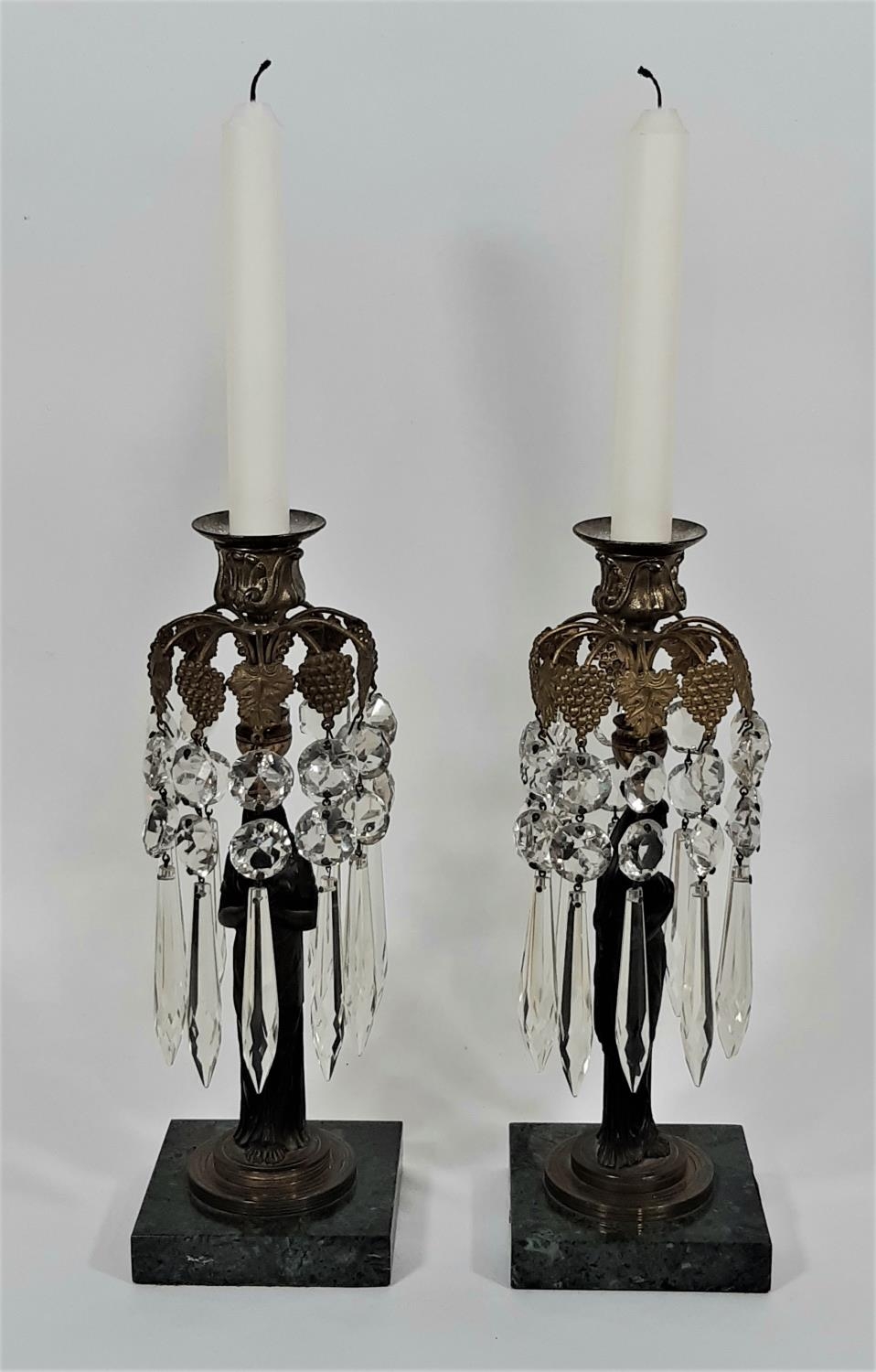 A pair of Regency table candlesticks decorated with ten gilt vine and grape fronds hung with glass lustres supported by classical dressed females on a circular step and green marble plinth, 30cm tall.