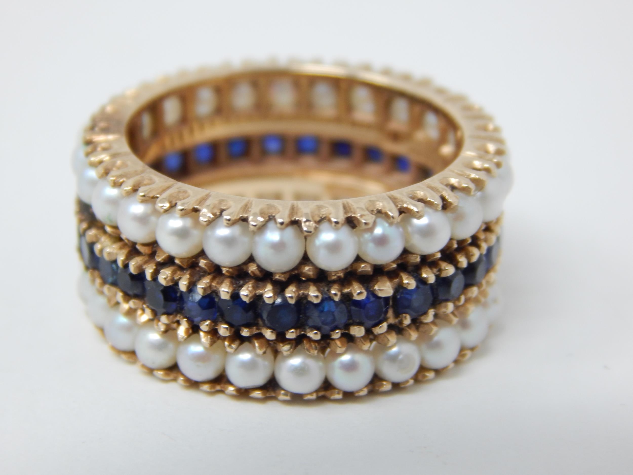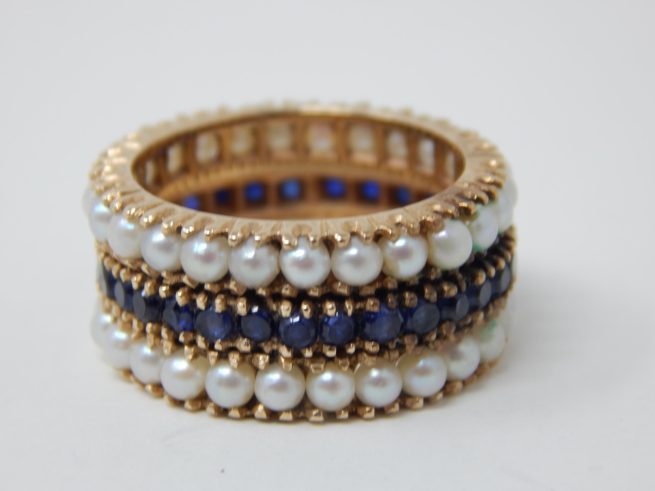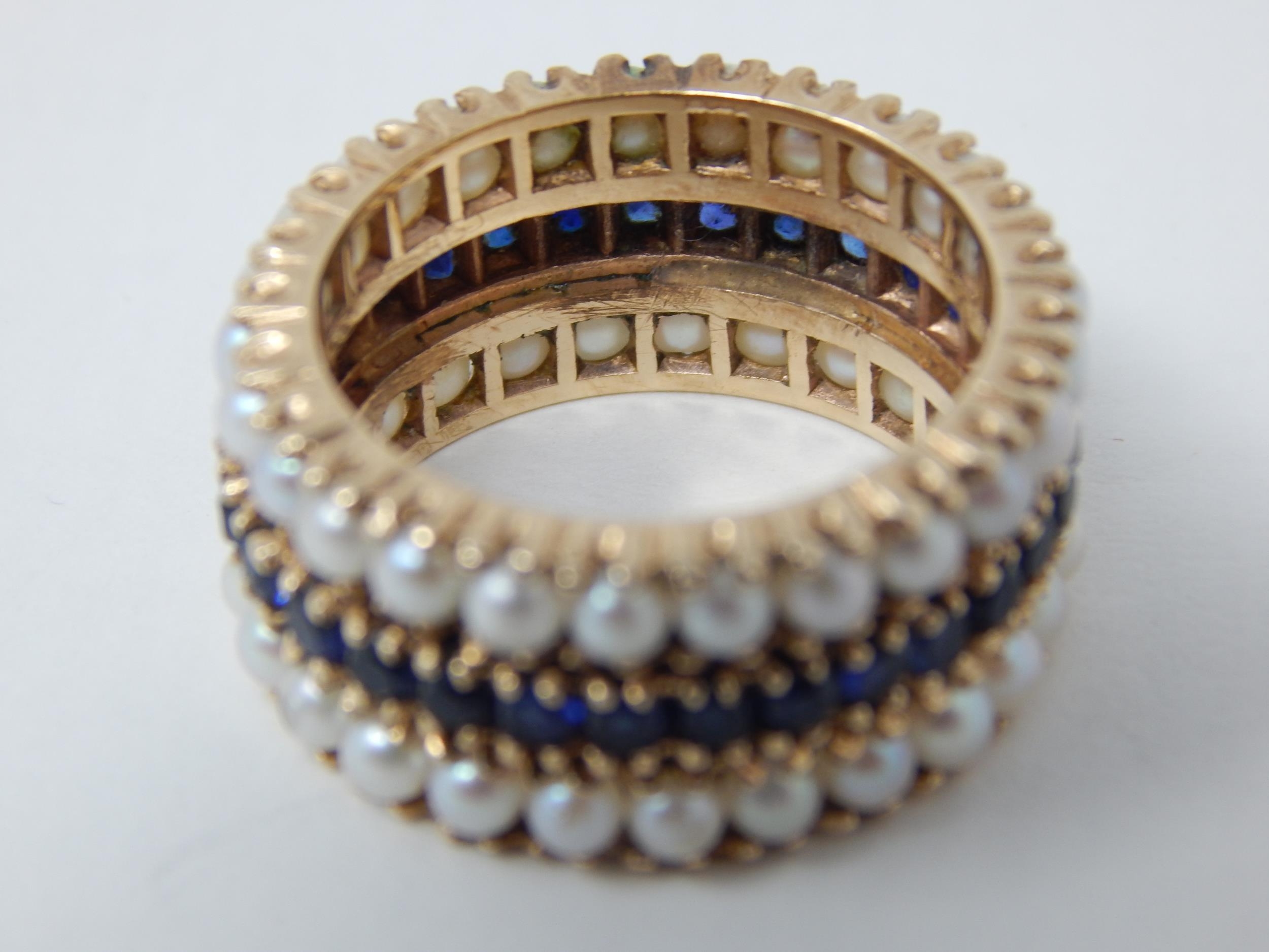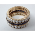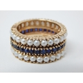 18ct Gold Eternity Ring Set with a Central Band of Sapphires Bordered with Bands of Pearls: Ring Size L: Weight 7.1g