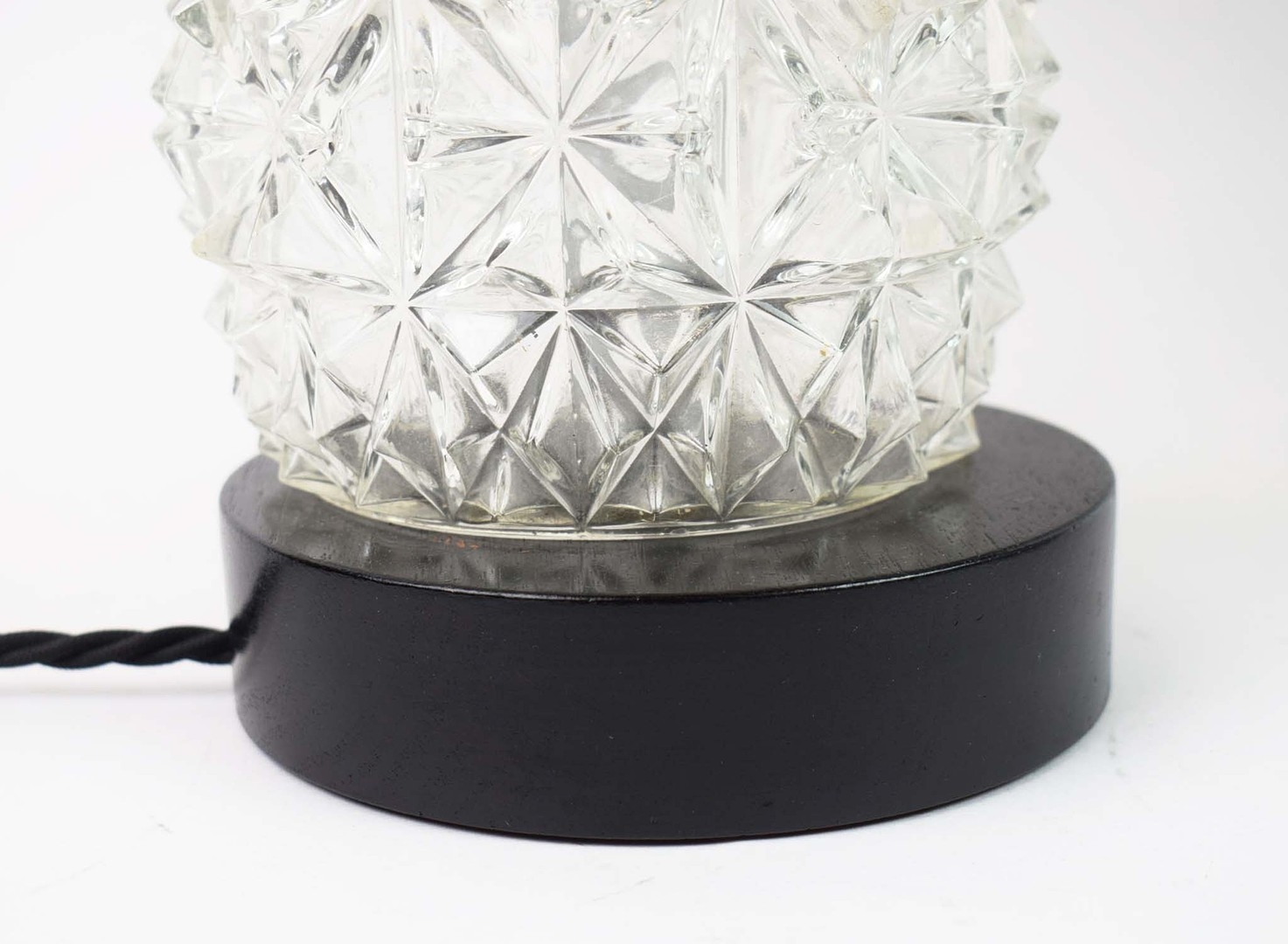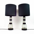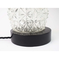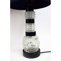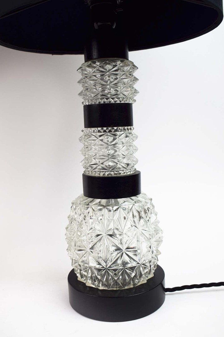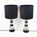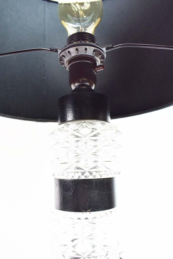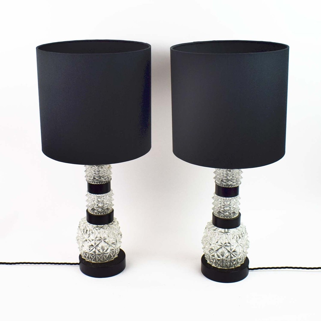 TABLE LAMPS, A PAIR, CUT GLASS. with black shades, each 66cm t overall (2).