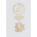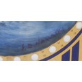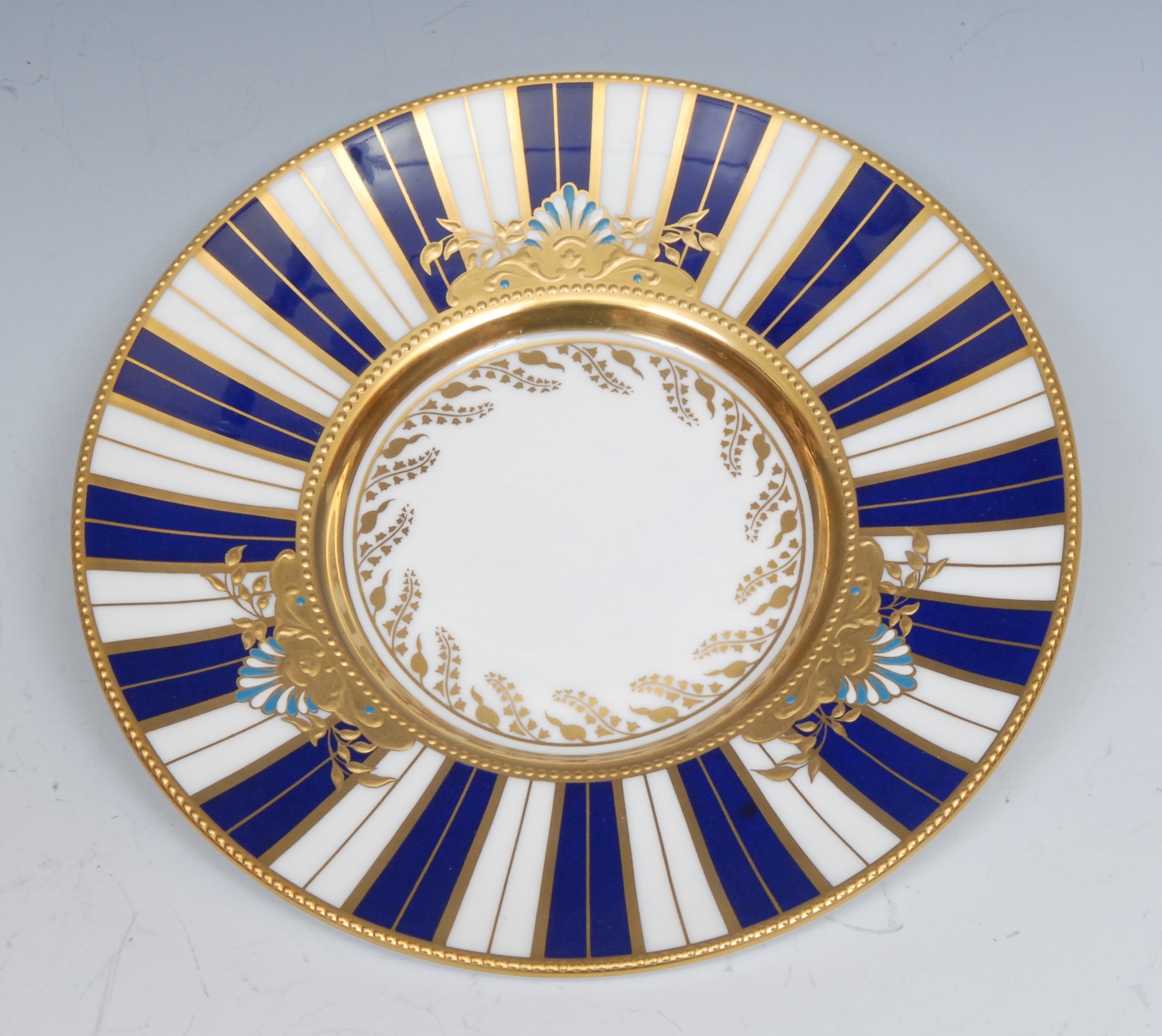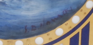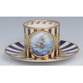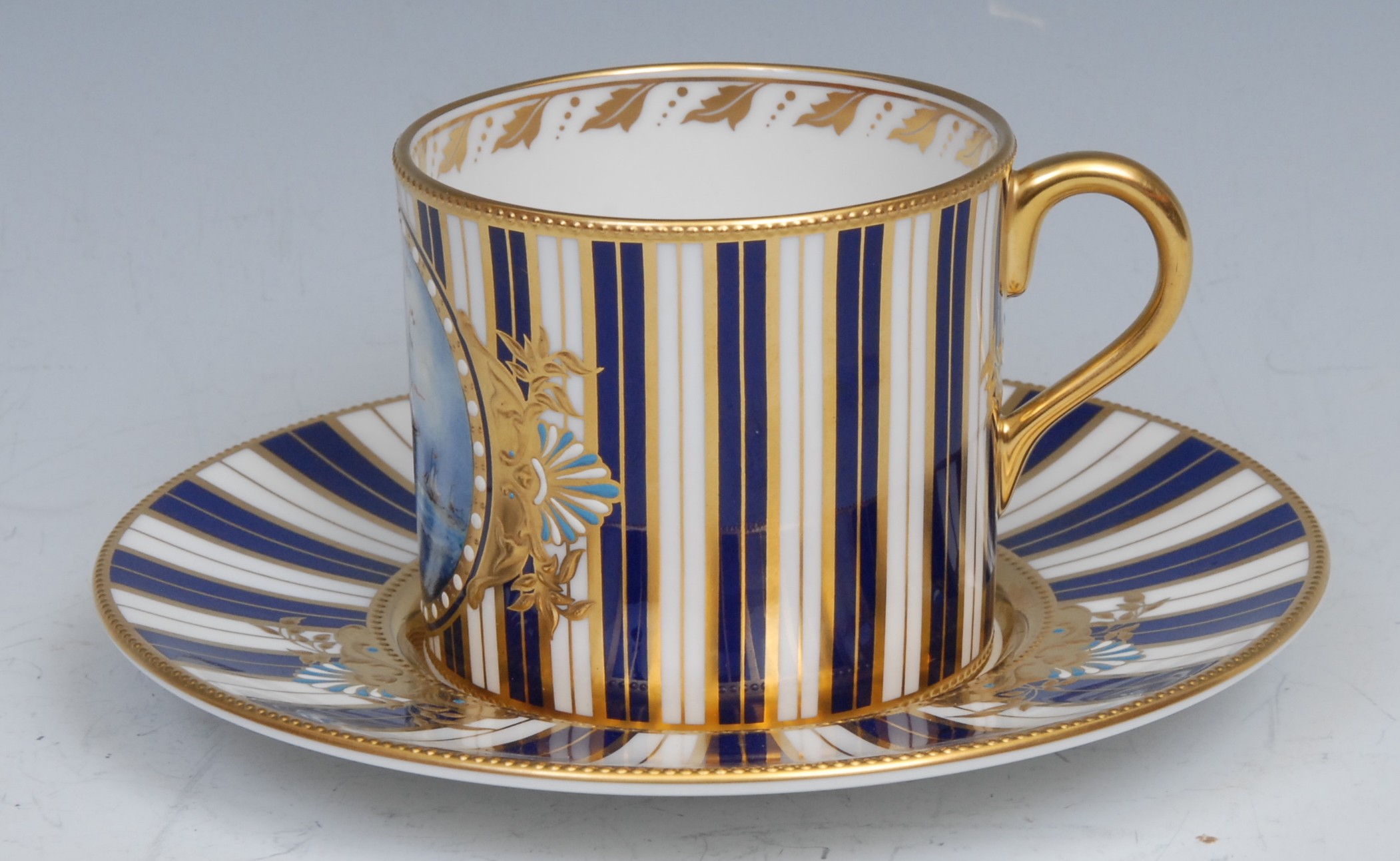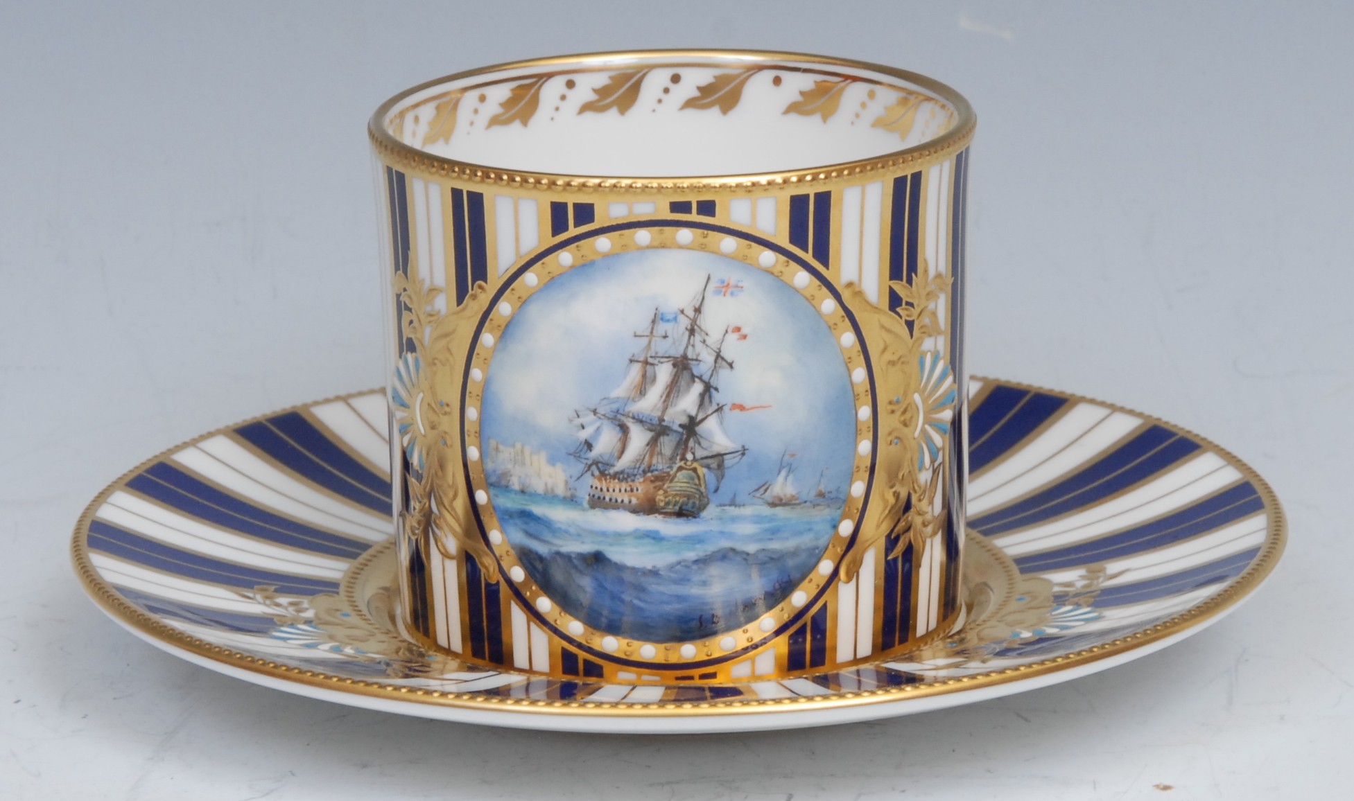 A Lynton coffee can and stand, painted by Stefan Nowacki, signed, with a seascape, tall ship on a choppy sea, on a striped ground, the saucer 14cm diam, gilt printed mark