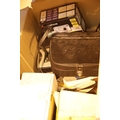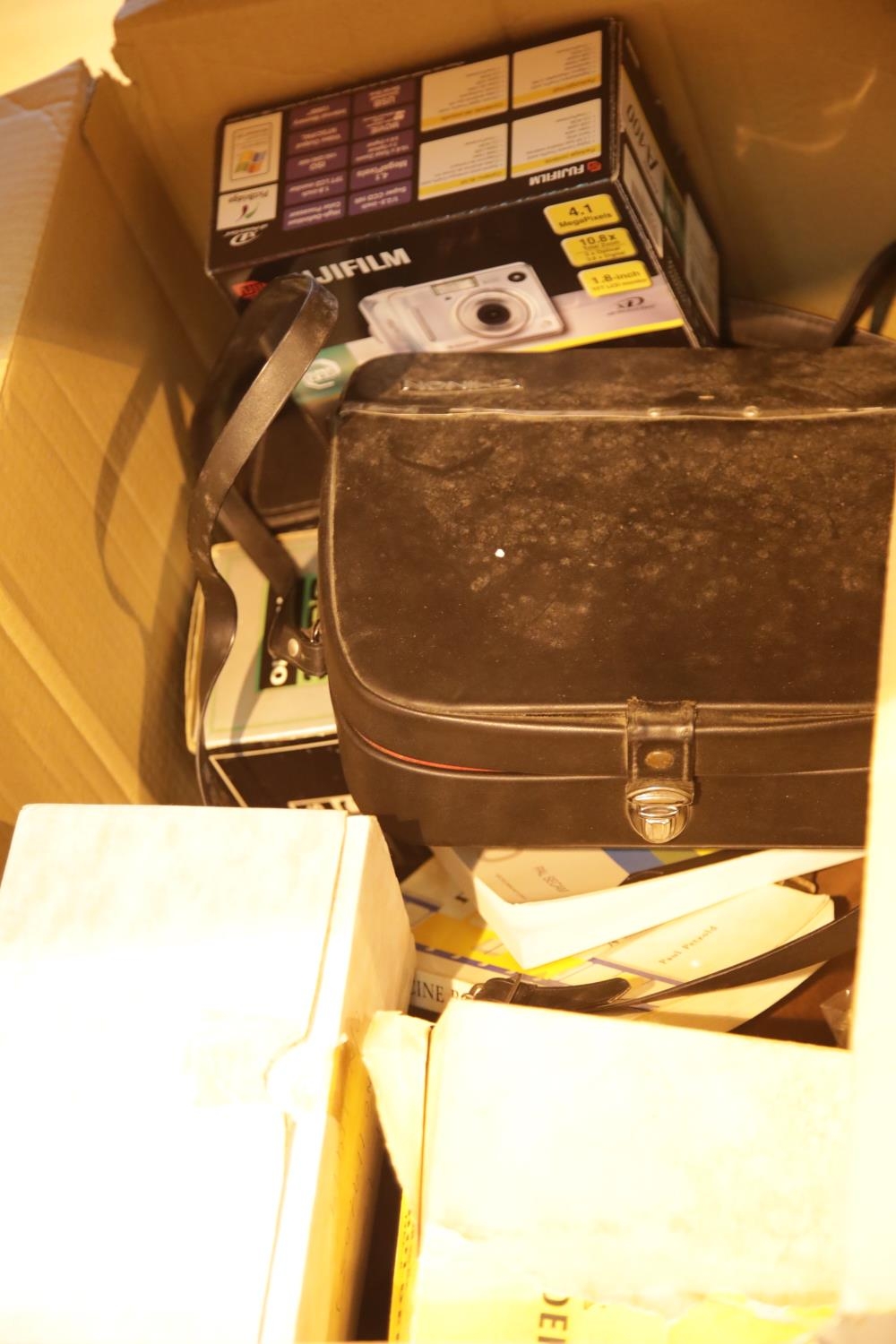 Box of vintage cameras and equipment including Olympus, Polaroid, box brownie etc. This lot is not available for in-house P&P.