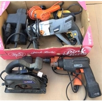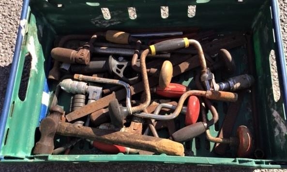 PLASTIC CRATE CONTAINING VARIOUS HAND TOOLS INCLUDING BRACK & BIT RATCHETS ETC