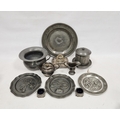 Assorted pewter and metalware, including: a Victorian engine-turned biscuit barrel on fixed stand with hinged cover, a 19th century large pewter circular dish indistinctly stamped 'Helen Bright' to reverse, a pewter chamberpot with fleur-de-lys and castle stamp to base, a collection of smaller plates and dishes, an EPNS bark moulded teapot in the Aesthetic-style, a silver-plated inkstand with glass inkwell, a pair of British Pewter inkwells and other items