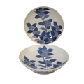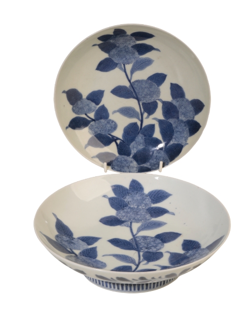 A PAIR OF JAPANESE "NABESHIMA" SHALLOW BOWLS decorated in underglaze blue with blossoming branches of hydrangea, the reverse with formalised scrolls and stylised flowerheads above a circular foot painted to simulate fluting, 20.5cm dia.