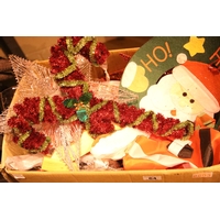 Two shelves of mixed Christmas decorations including wreaths. Not available for in-house P&P