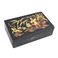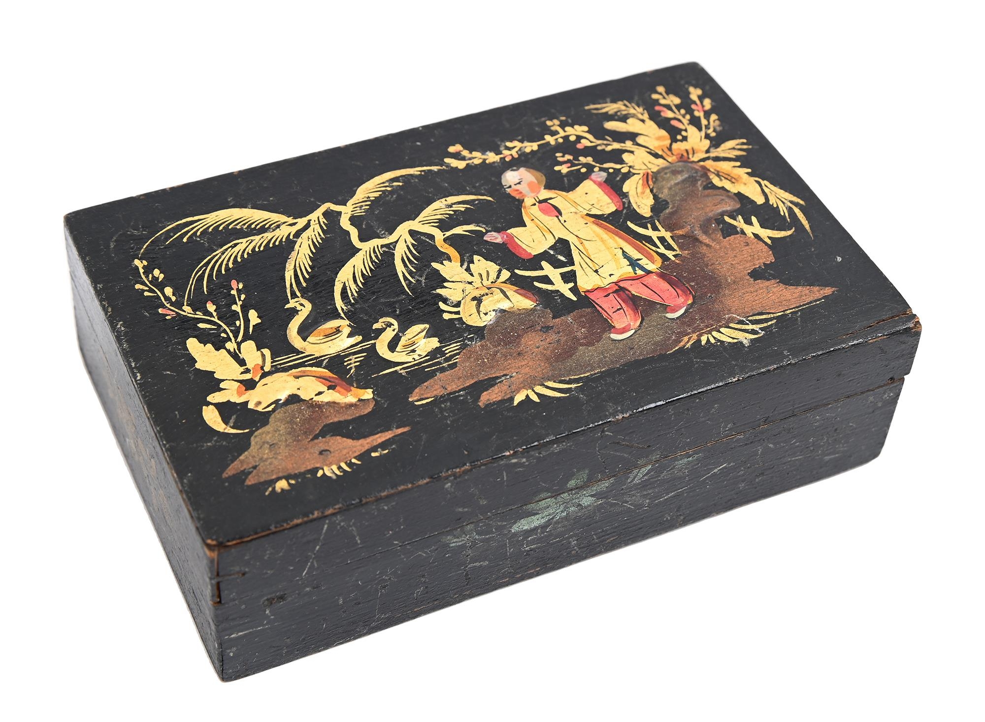 A japanned wood box and cover, early 20th c, with chinoiseries, 12.5cm l