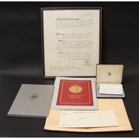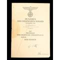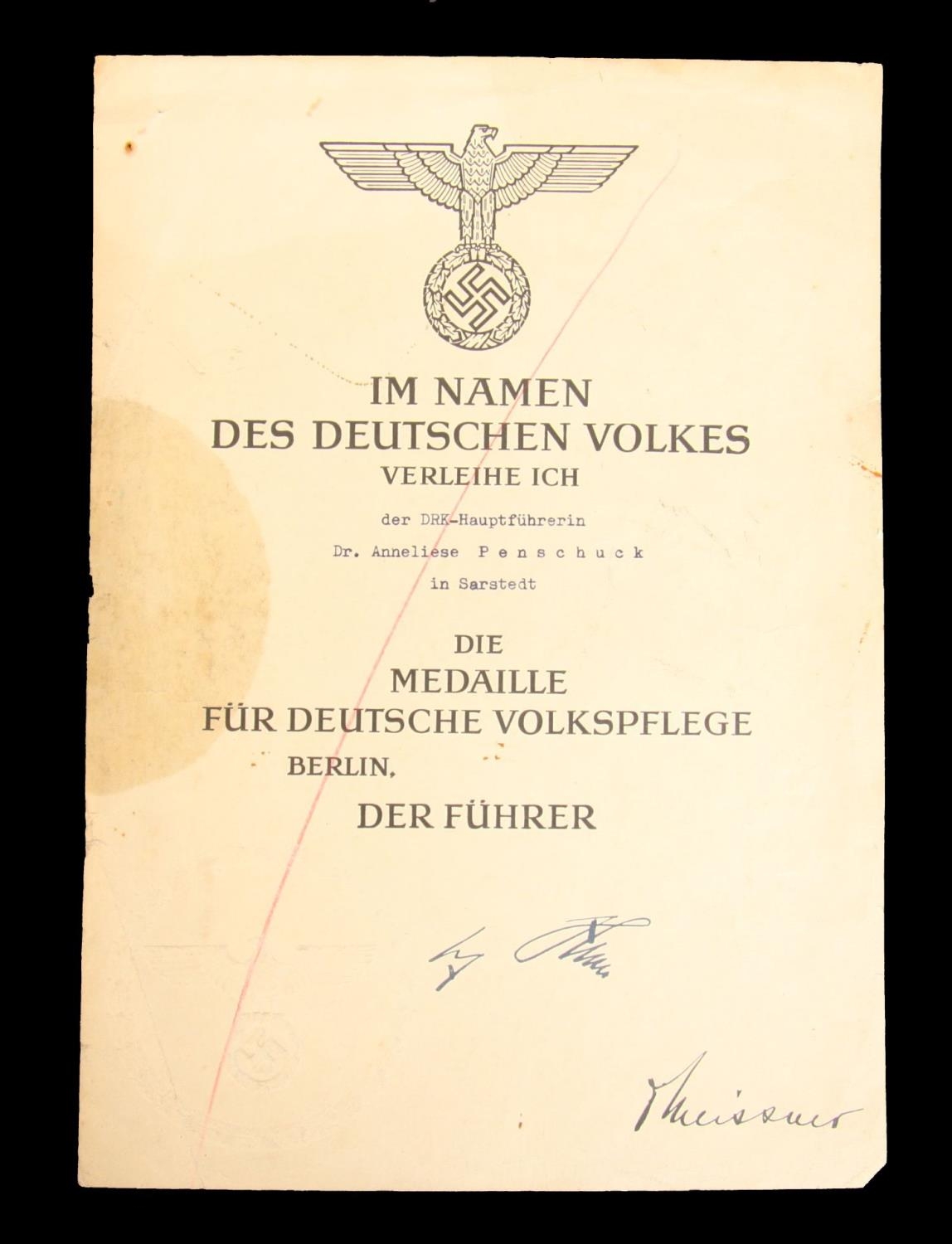 Militaria, Germany, Third Reich, Im Namen des Deutsche Volkes Certificate awarding der DRK-Hauptfuhrein Dr. Anneliese Penschuck in Sarstedt Die Medaille Fur Deutsche Volksplege, bearing the iron stamped signature of Adolf Hitler and bearing another signature