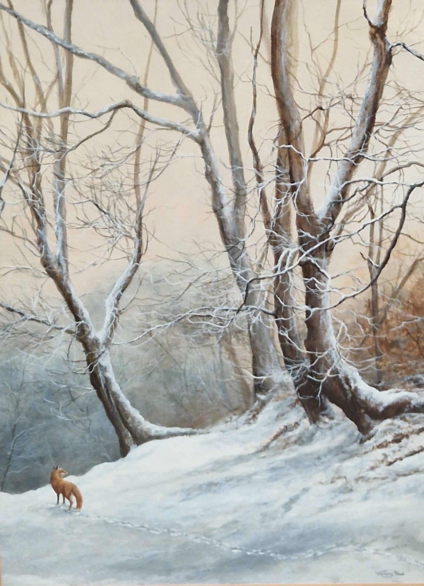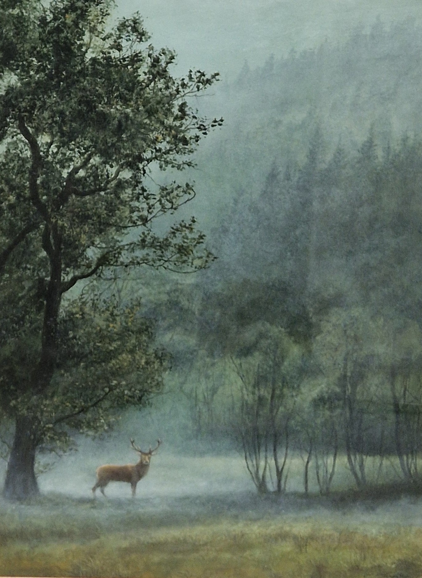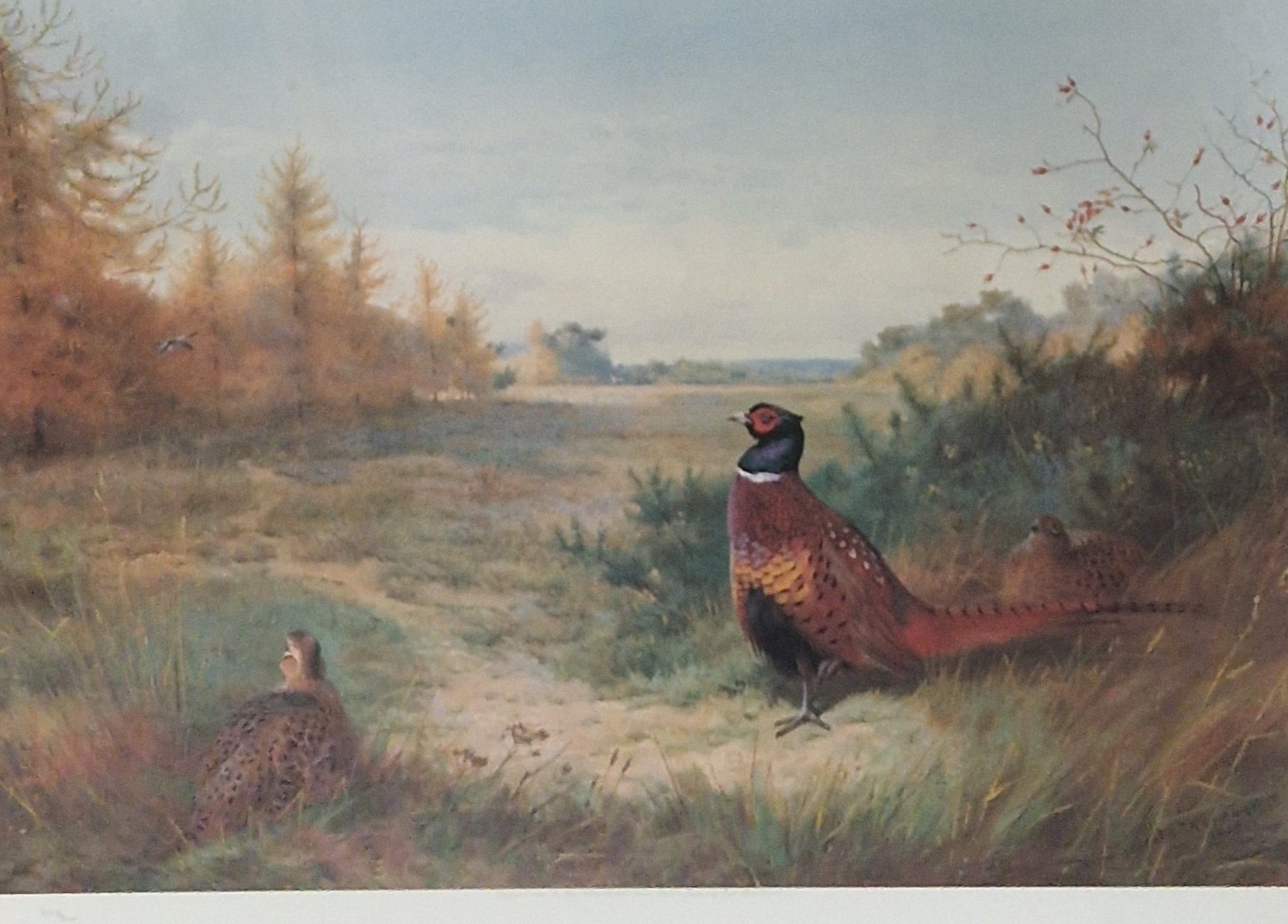 AFTER ARCHIBALD THORBURN. Pheasants, colour reproduction, published by The Tryon Gallery, London, Pl.15 x 22 in; two watercolours by Jeremy Paul titled 'Winter Fox' and ' Misty Morning, Stag, Glen Nevis'; a pastel by Rona Knowles depicting The Head of a Horse'; and a colour reproduction after Philip Eustace Stretton titled 'Patience'. five (5) (R7)